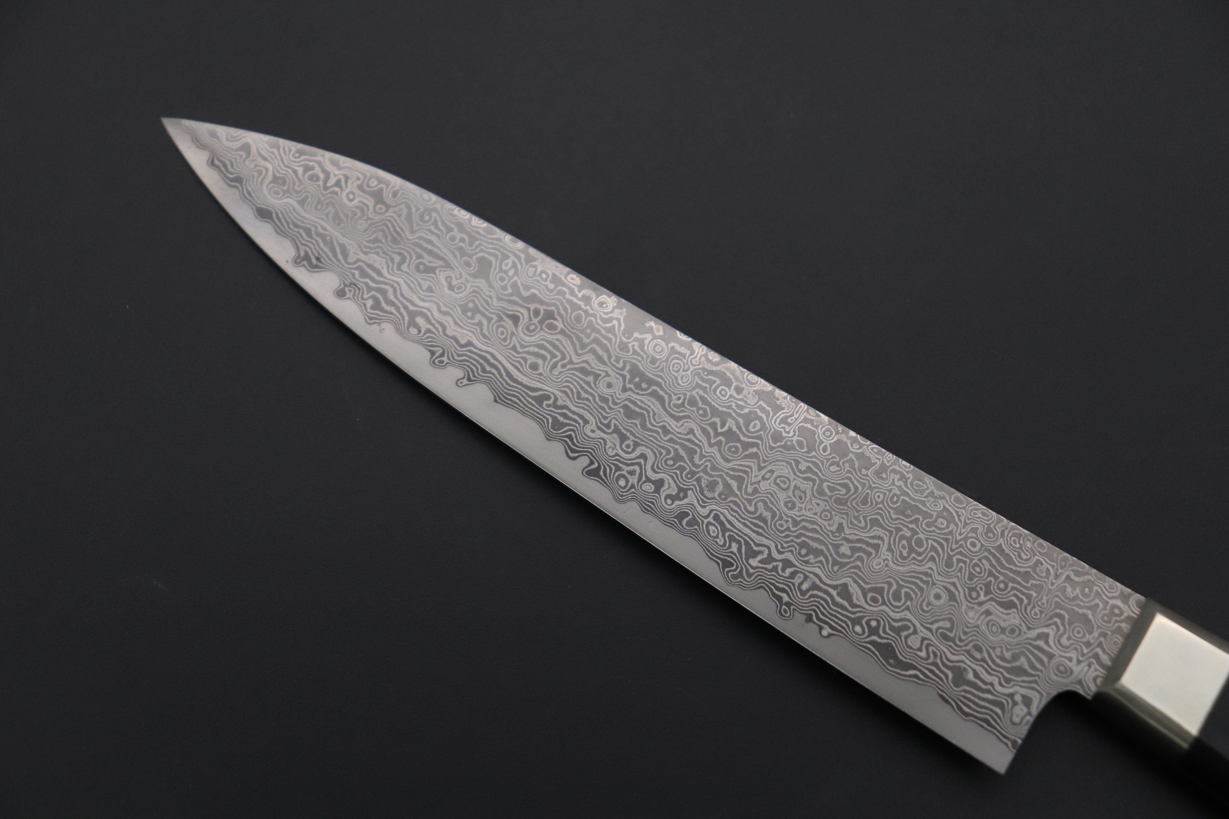 Mr. Hattori is an uncompromising traditional craftsman and he utilizes all of his available energy, passion, and expertise to create these beautiful Chef’s knives, which are made using ancient forging and sword making techniques. Each hand forged blade has a core layer of Cowry X and outer layers of Nickel-Stainless Damascus (SUS440 steel). Cowry X is a tough Powdered Metallurgy tool steel that was specially developed by Daido Steel Company for high-performance cutting tools. It contains a high volume of Carbon (3%) and Chromium (20%), some Molybdenum (1%) and a little Vanadium (0.3%). Amazingly, it can be heat treated to HRc. 63-67 without becoming brittle.