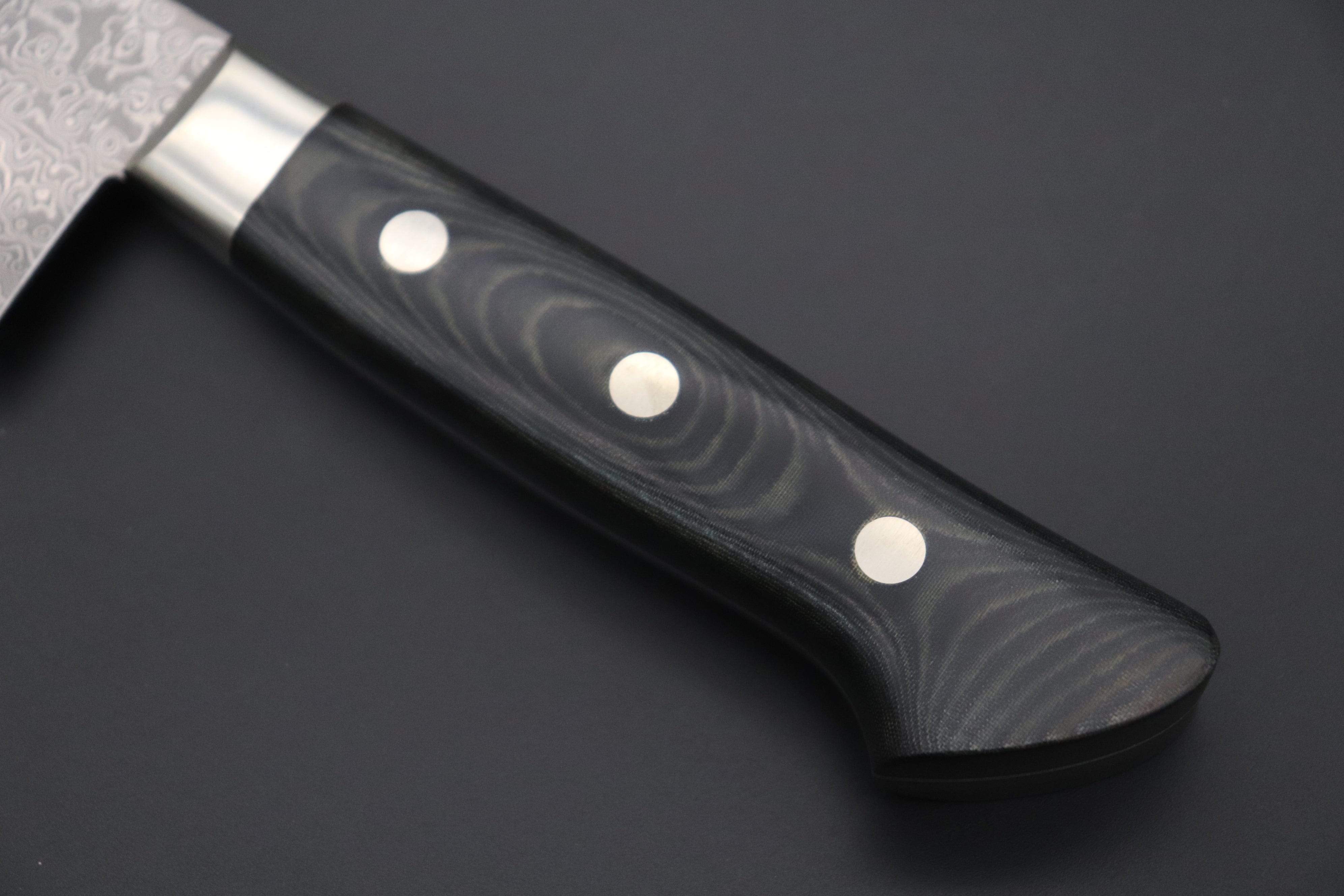 The sturdy black linen Micarta handle fits your hand perfectly, is resistant to water and shrinkage, and is enhanced with a nickel silver bolster and rivets. Each knife comes in a traditional Kiri (Paulownia) wood presentation gift box.