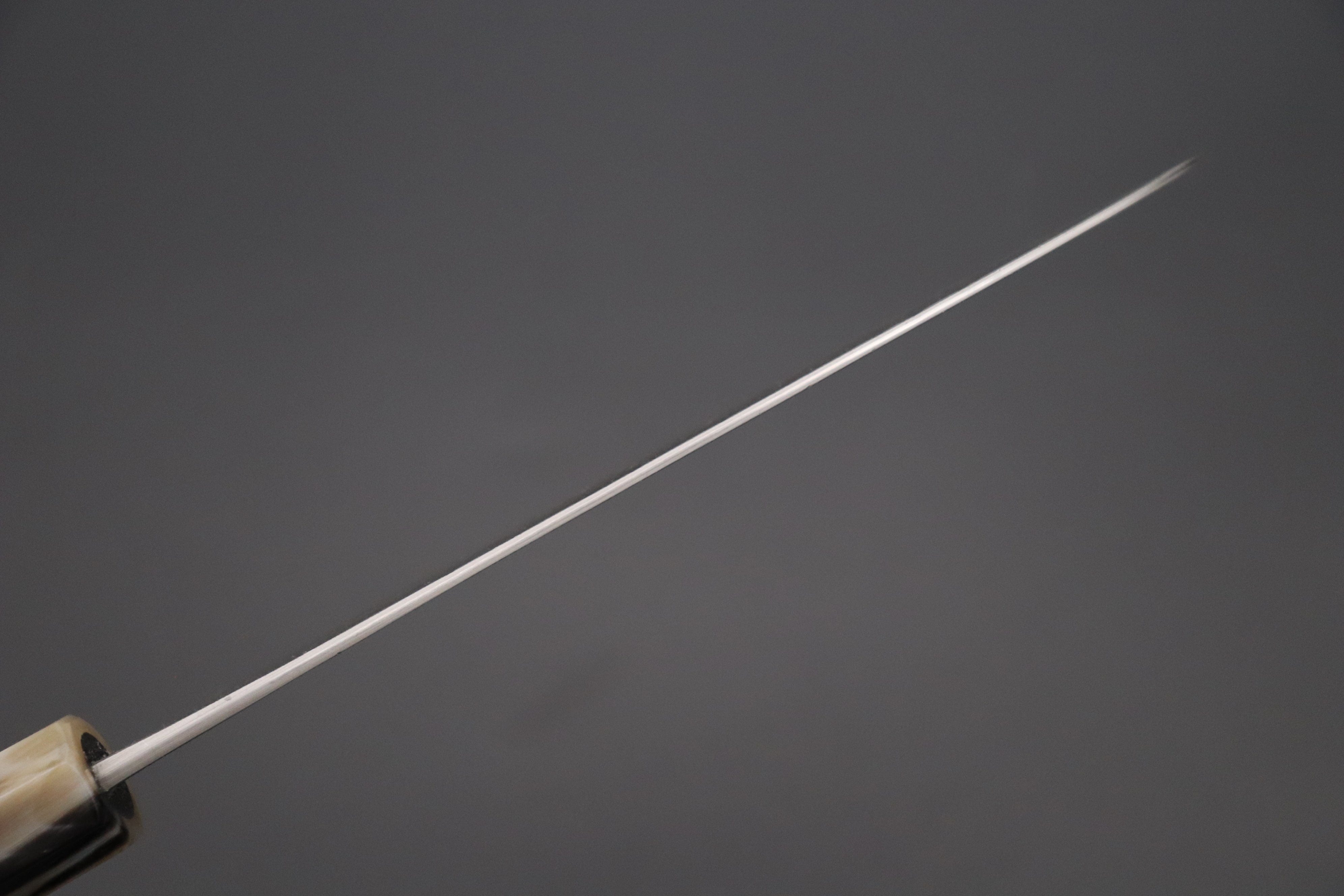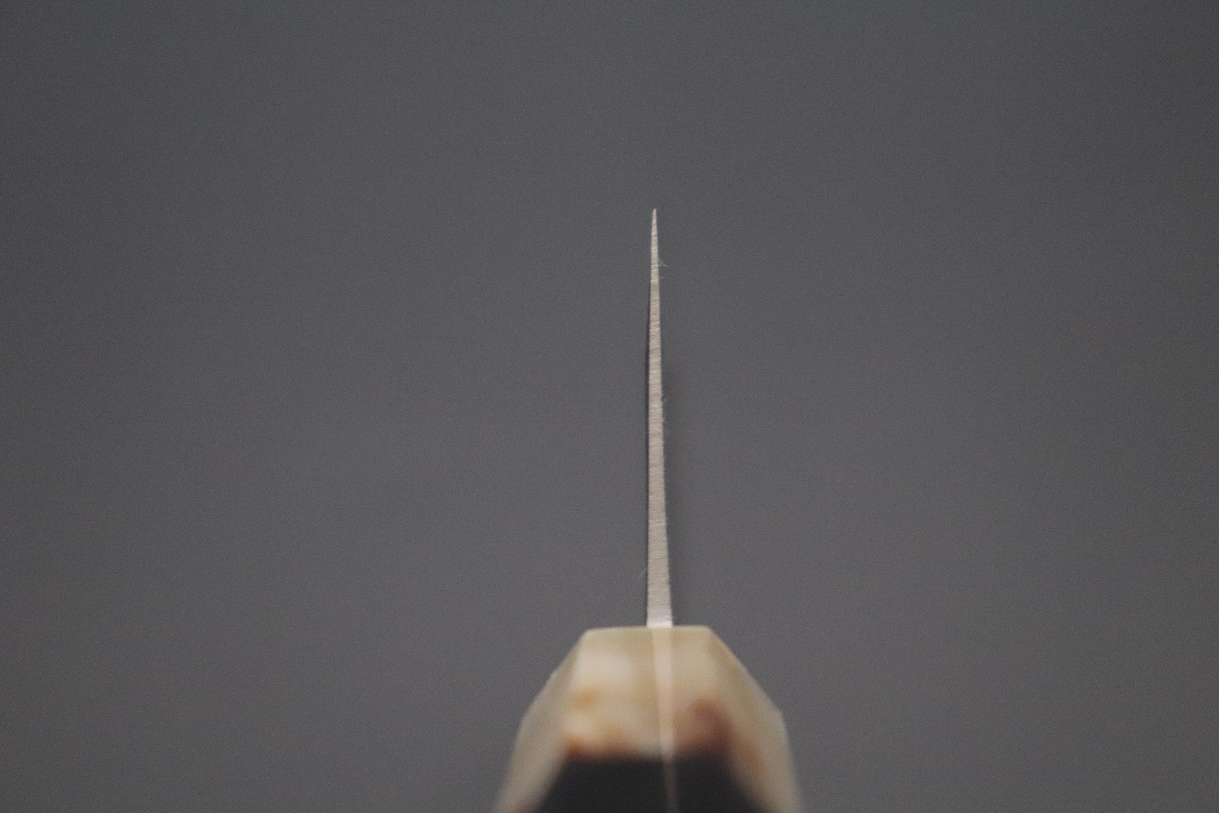 The Octagonal Ebonywood Handles are suitable for both right-handed and left-handed users. The distinctive Marbled-White Color of the Water buffalo horn ferrule provides a good accent and has a beautiful appearance. A matching Black Lacquered wood Saya (Sheath) with a black pakkawood Saya pin is also included with the knife.