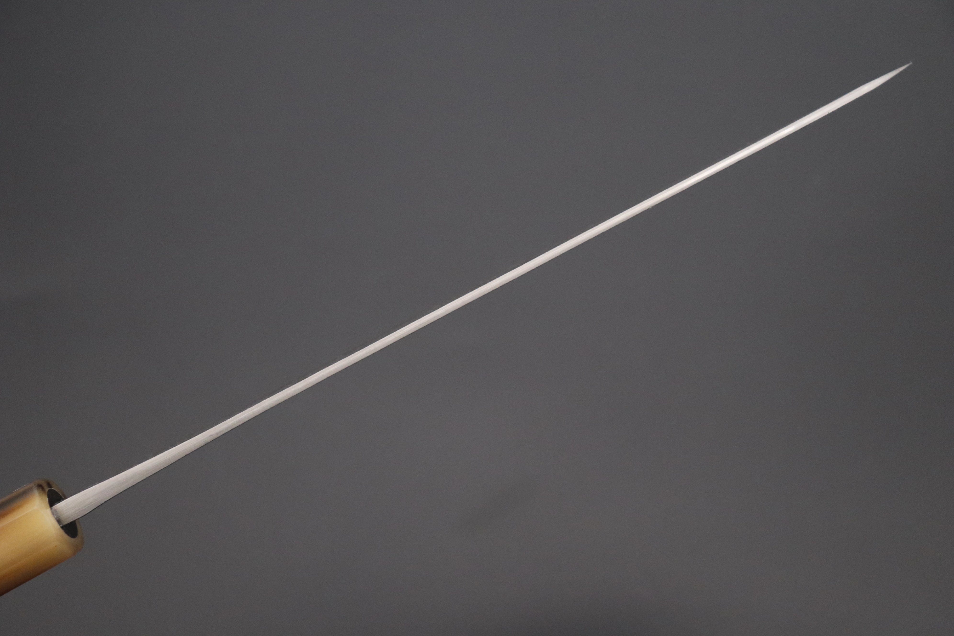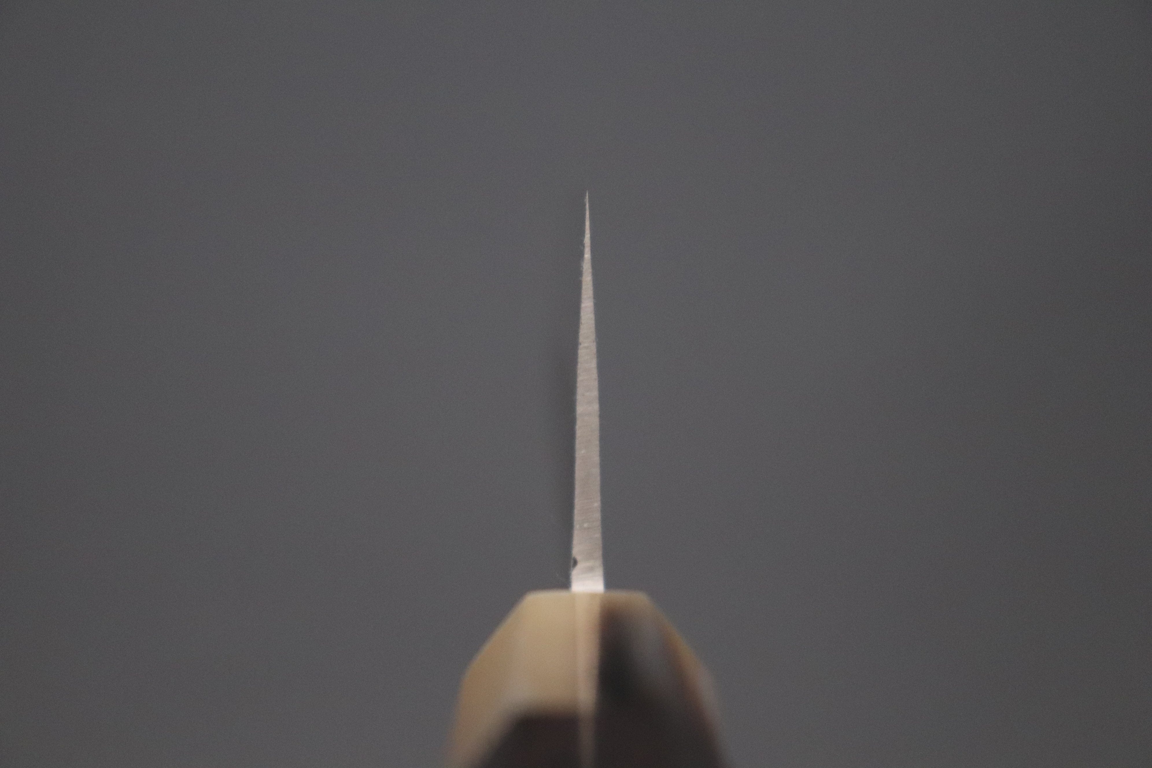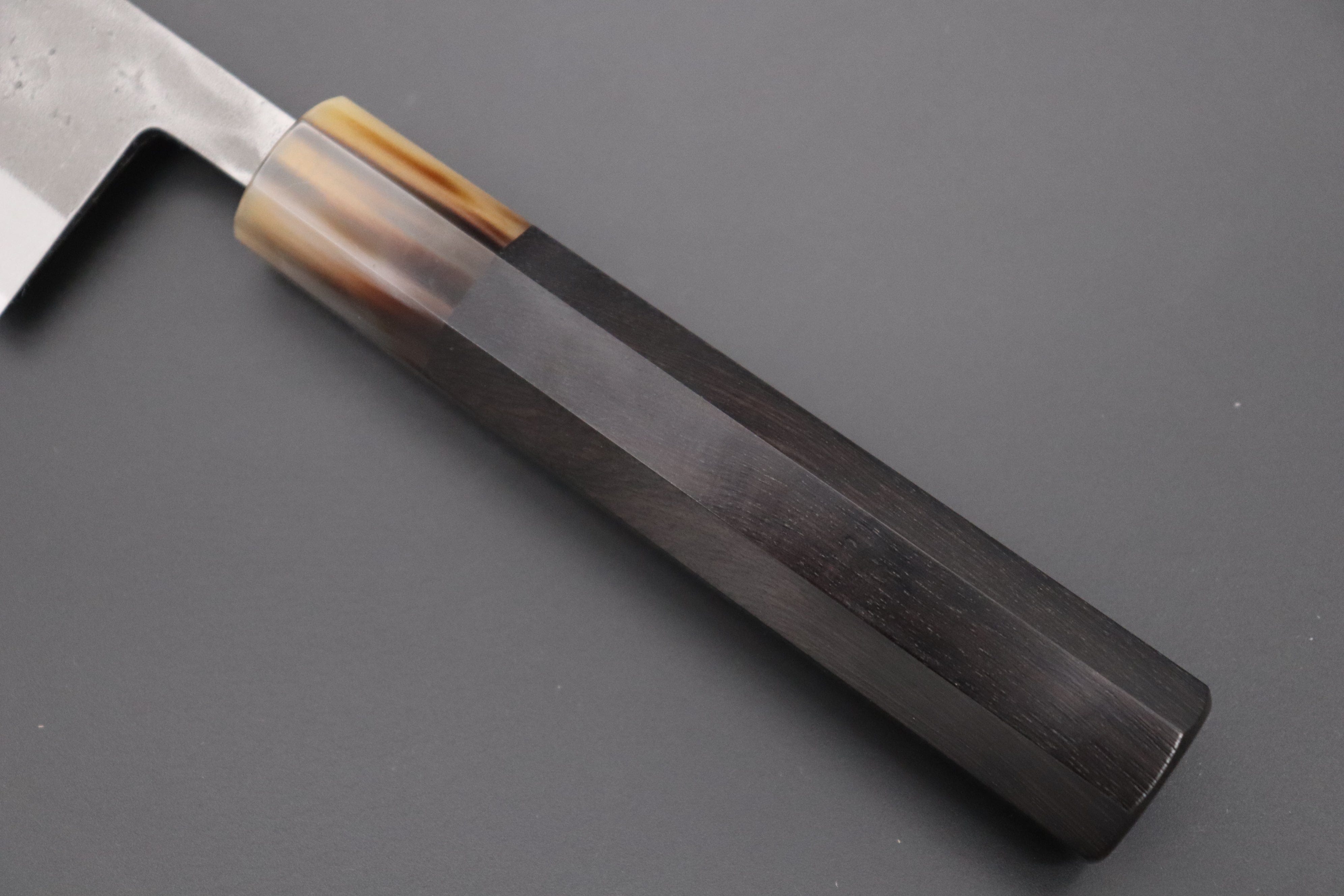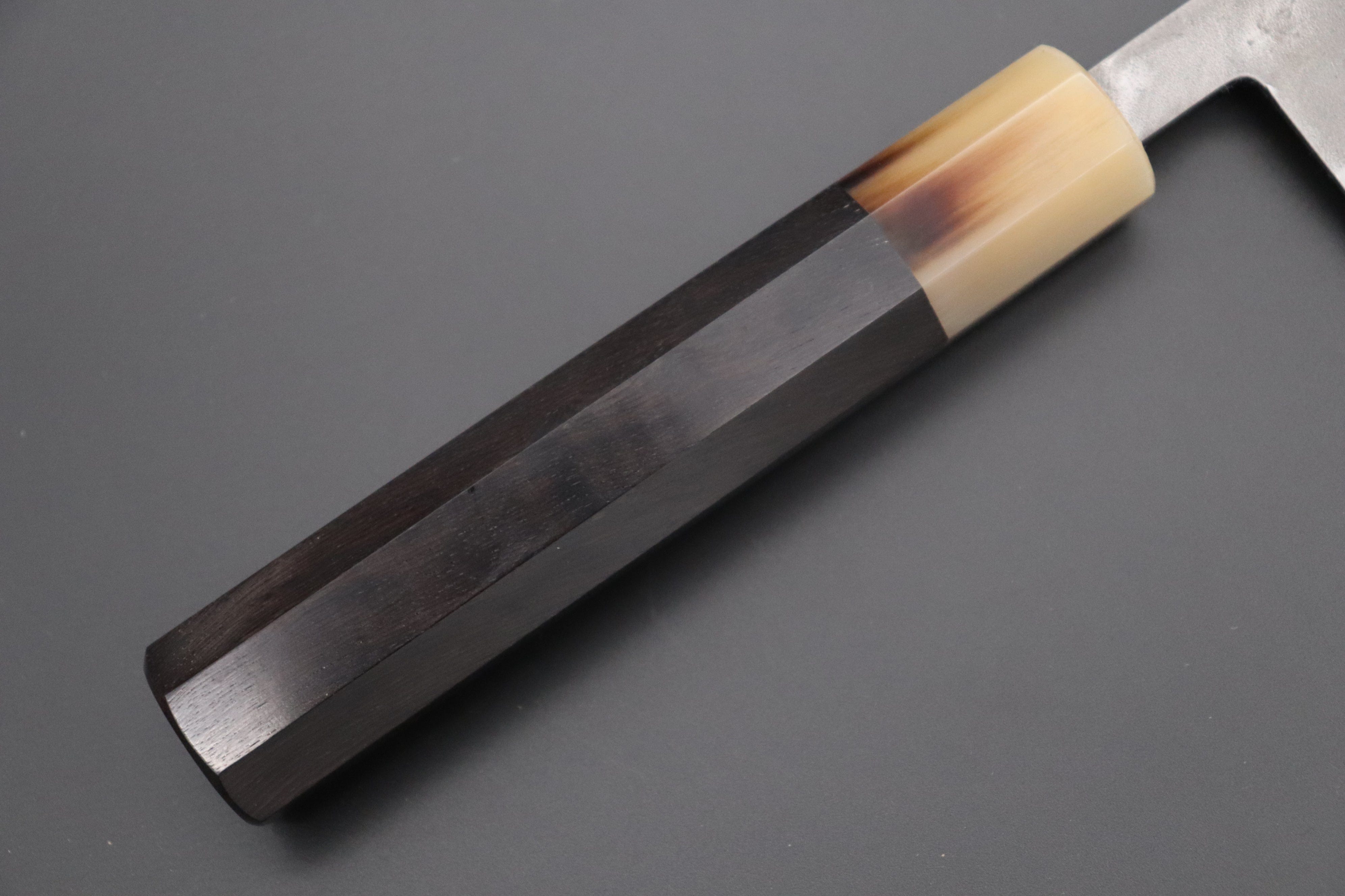 The Octagonal Ebonywood Handles are suitable for both right-handed and left-handed users. The distinctive Marbled-White Color of the Water buffalo horn ferrule provides a good accent and has a beautiful appearance. A matching Black Lacquered wood Saya (Sheath) with a black pakkawood Saya pin is also included with the knife.