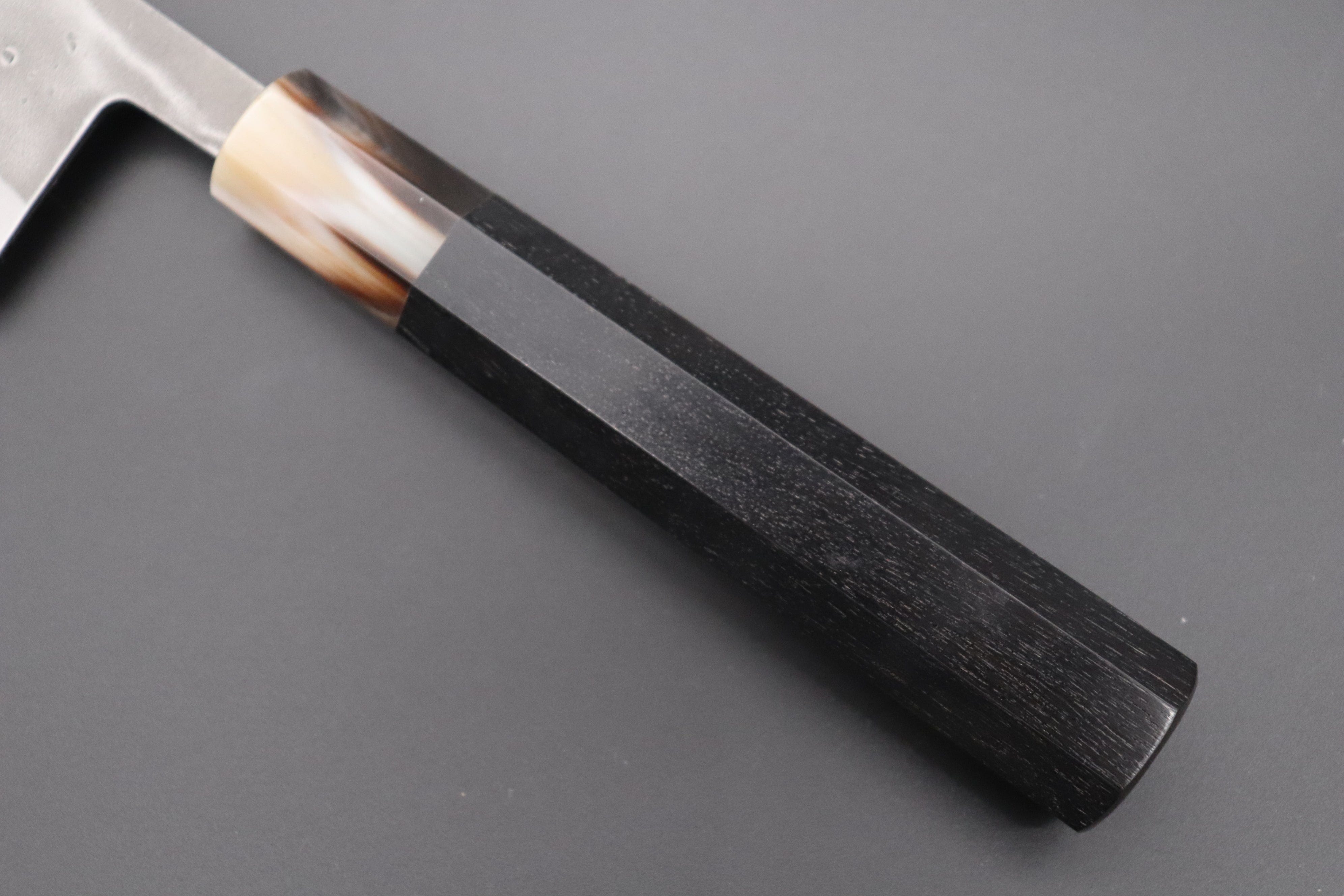 The Octagonal Ebonywood Handles are suitable for both right-handed and left-handed users. The distinctive Marbled-White Color of the Water buffalo horn ferrule provides a good accent and has a beautiful appearance. A matching Handcrafted Magnolia wood Saya (Sheath) with a black pakkawood Saya pin is also included with the knife.