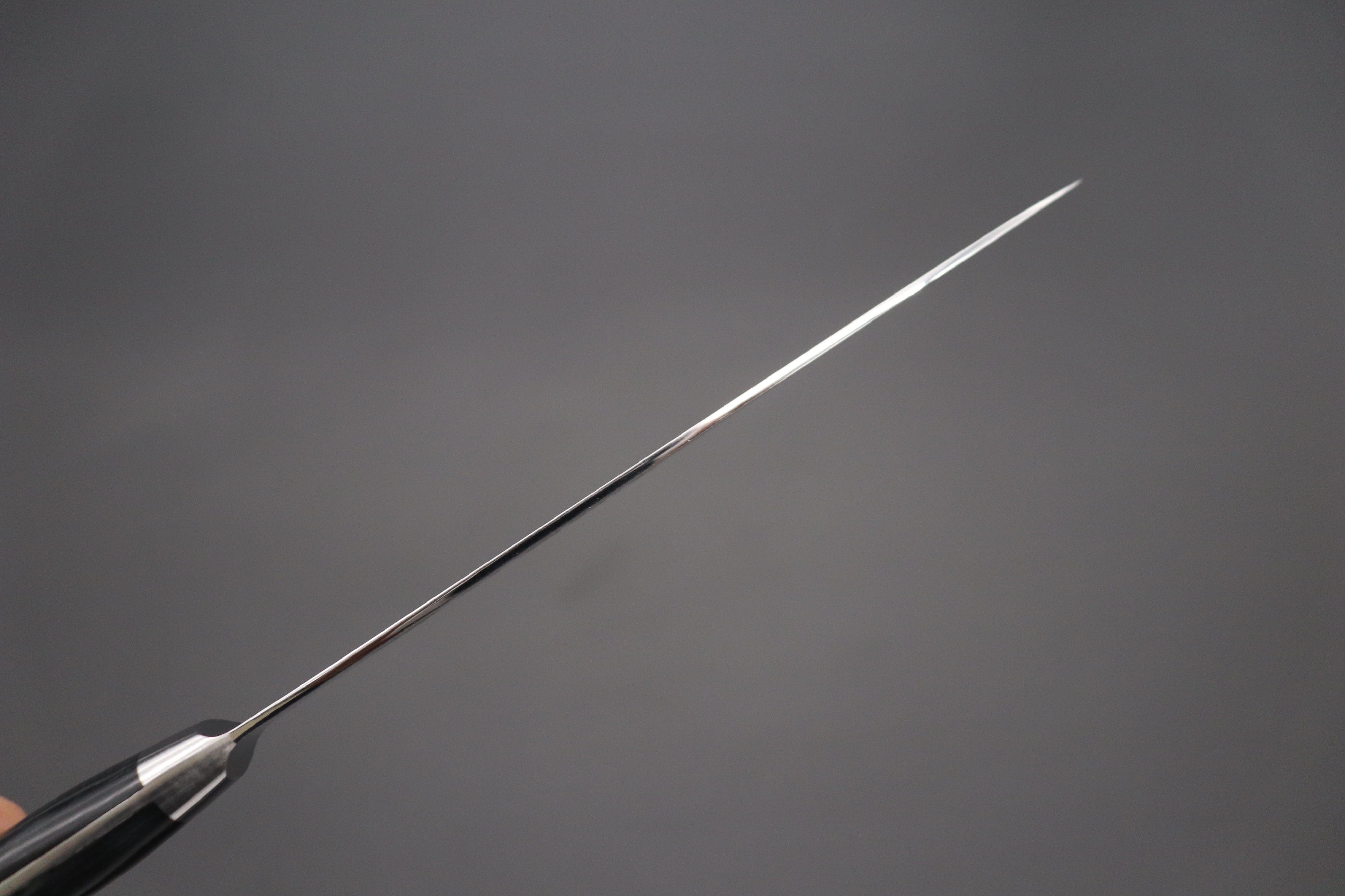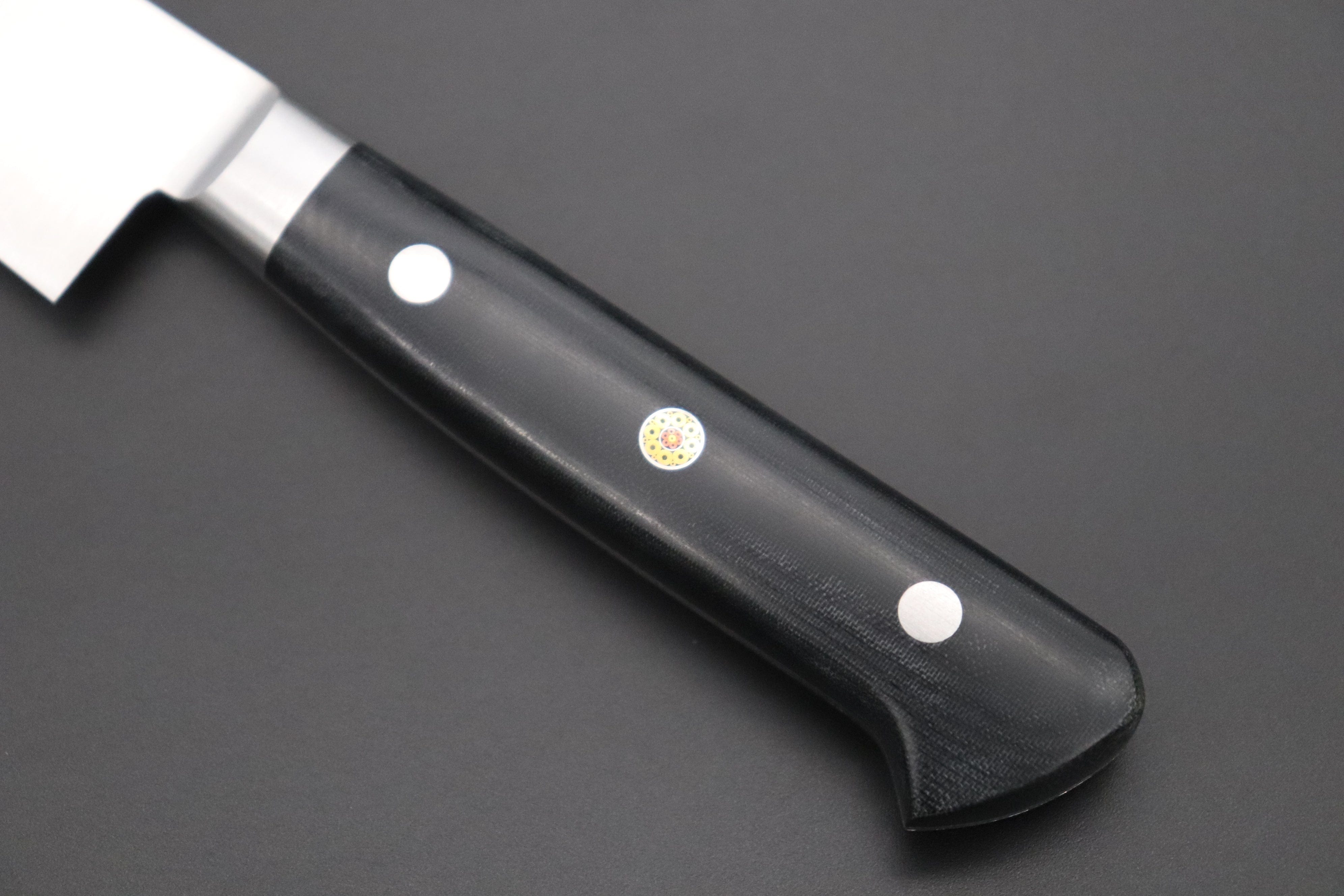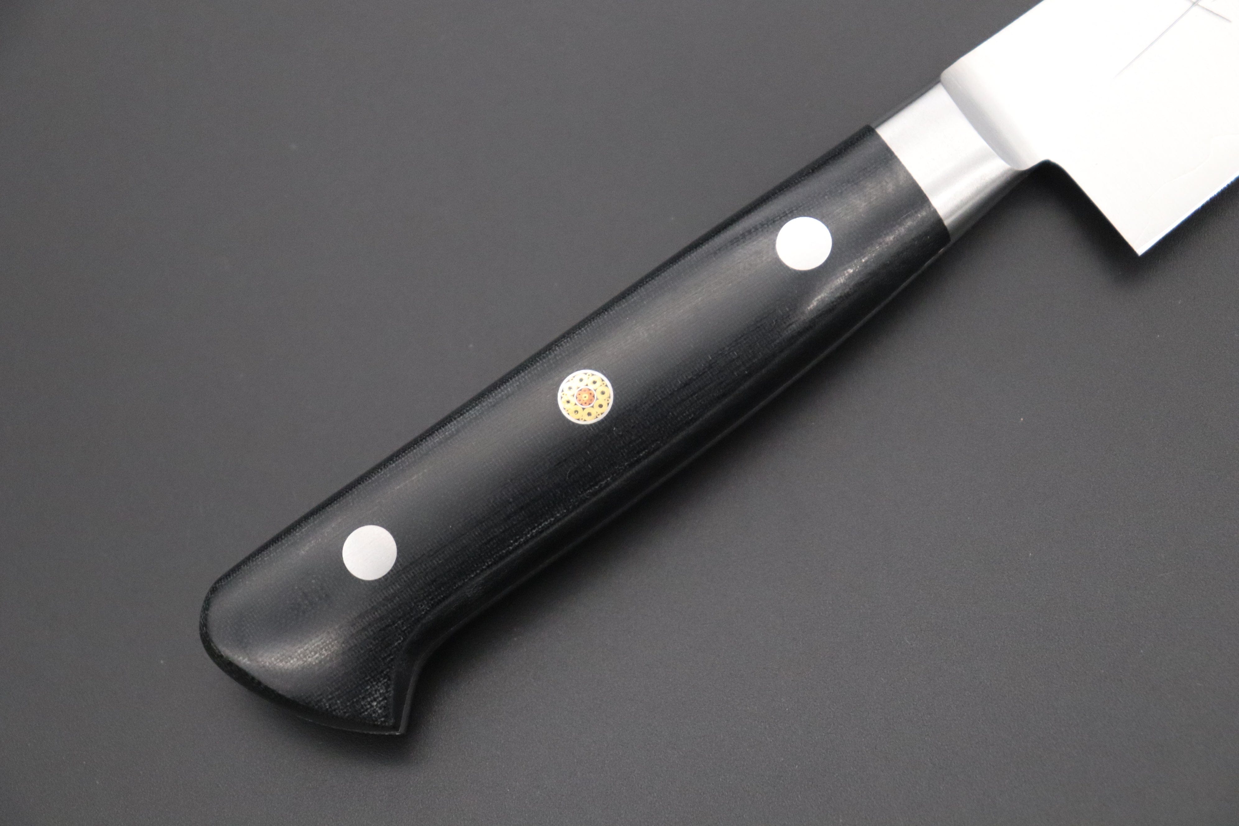 In order to satisfy new market demands, including those of a large number of experienced users and knife enthusiasts, Master Gotou has recently been refining his techniques for making the new generation of special steel knives. Master Gotou selected a special Powdered Metallurgy High Speed Tool Steel called “R-2”, which he heat-treats to HRc. 63. R-2 is made by a highly reputable Japanese company called Kobelco, and the steel offers remarkable cutting performance and edge retention. It is 3 layers construction blade, outer soft stainless steel supports the R-2 hard steel core for making the strength and ease of the maintenance.