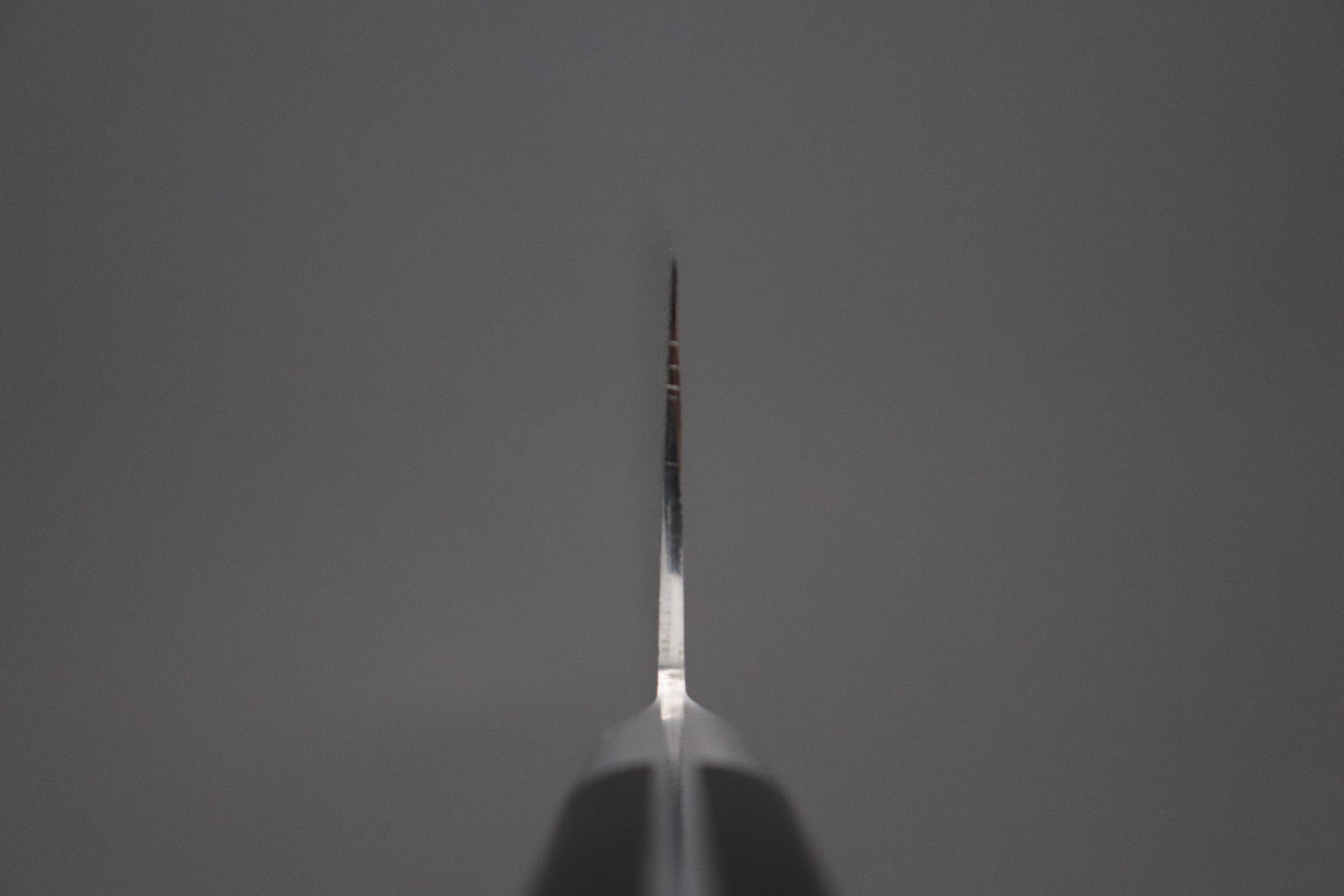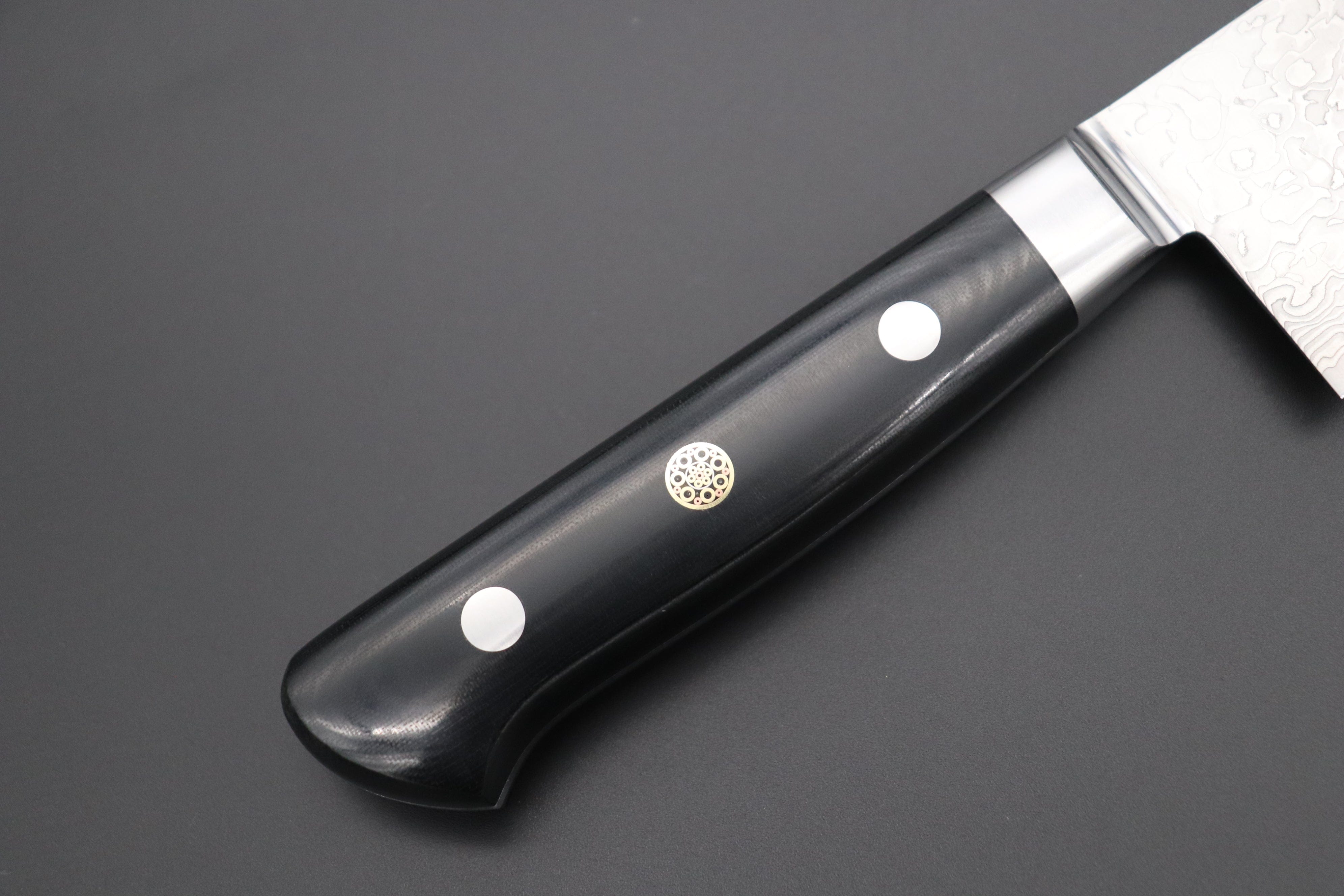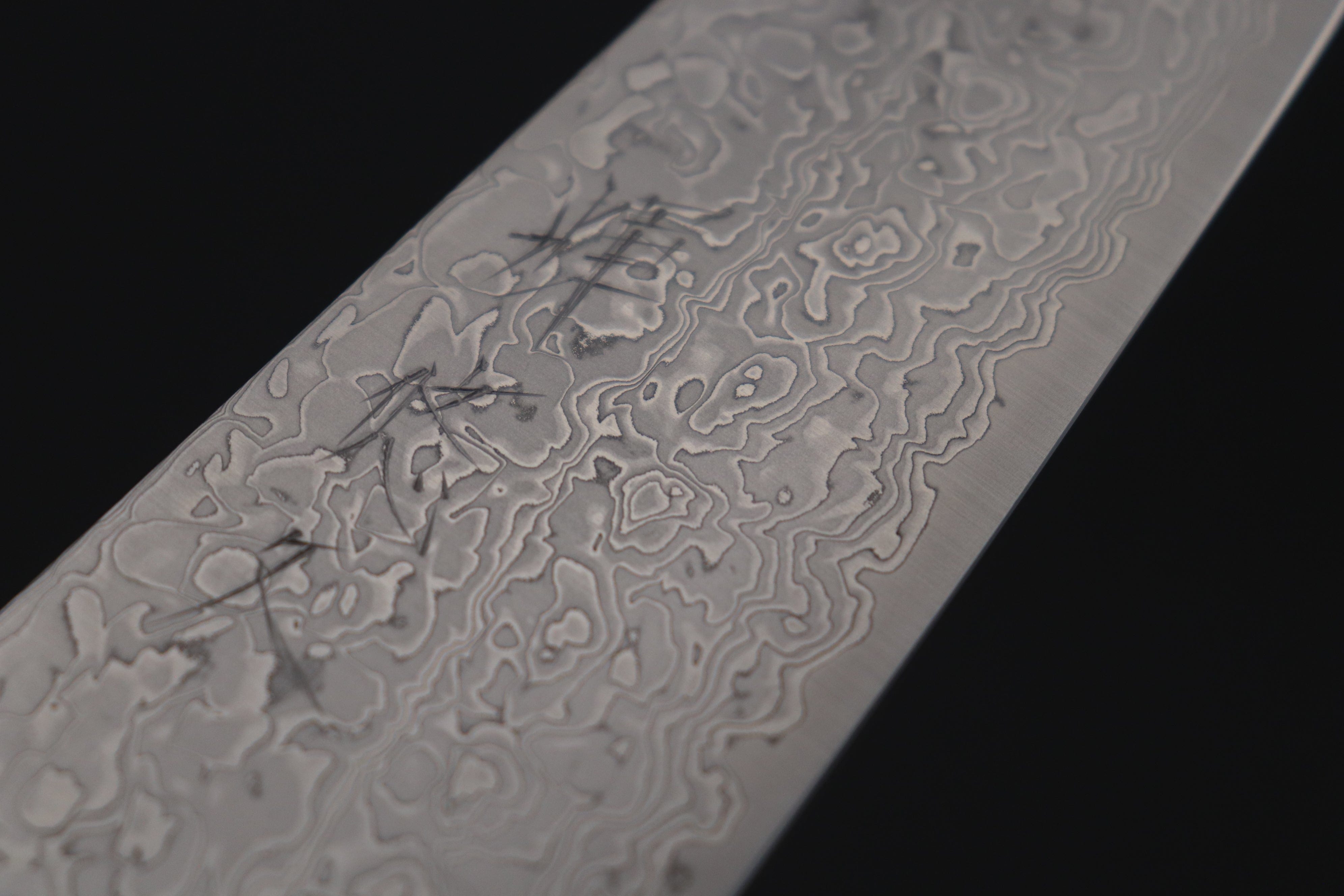 For the core steel of this Damascus knife, Master Craftsman Mr. Gotou selected a special Powdered Metallurgy High Speed Tool Steel called “R-2”, which he heat-treats to HRc. 63. R-2 is made by a highly reputable Japanese company called Kobelco, and the steel offers remarkable cutting performance and edge retention. The two outer layers of the blade are made from a unique and elegantly patterned Damascus steel, which is comprised of alternating layers of white-colored nickel steel and sparkling mirror polished layers of steel.