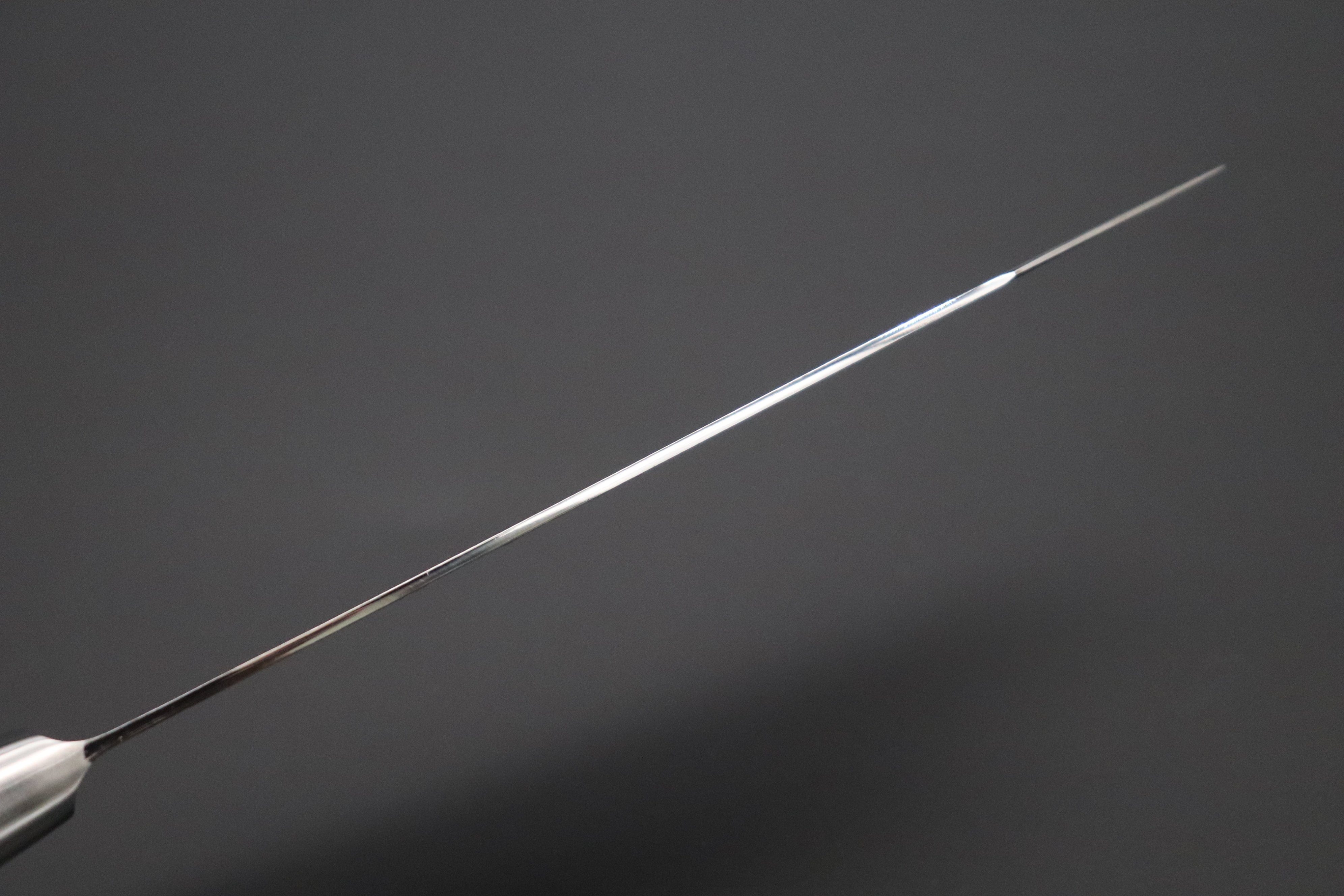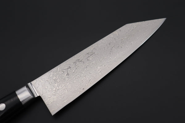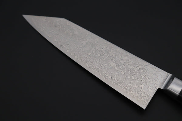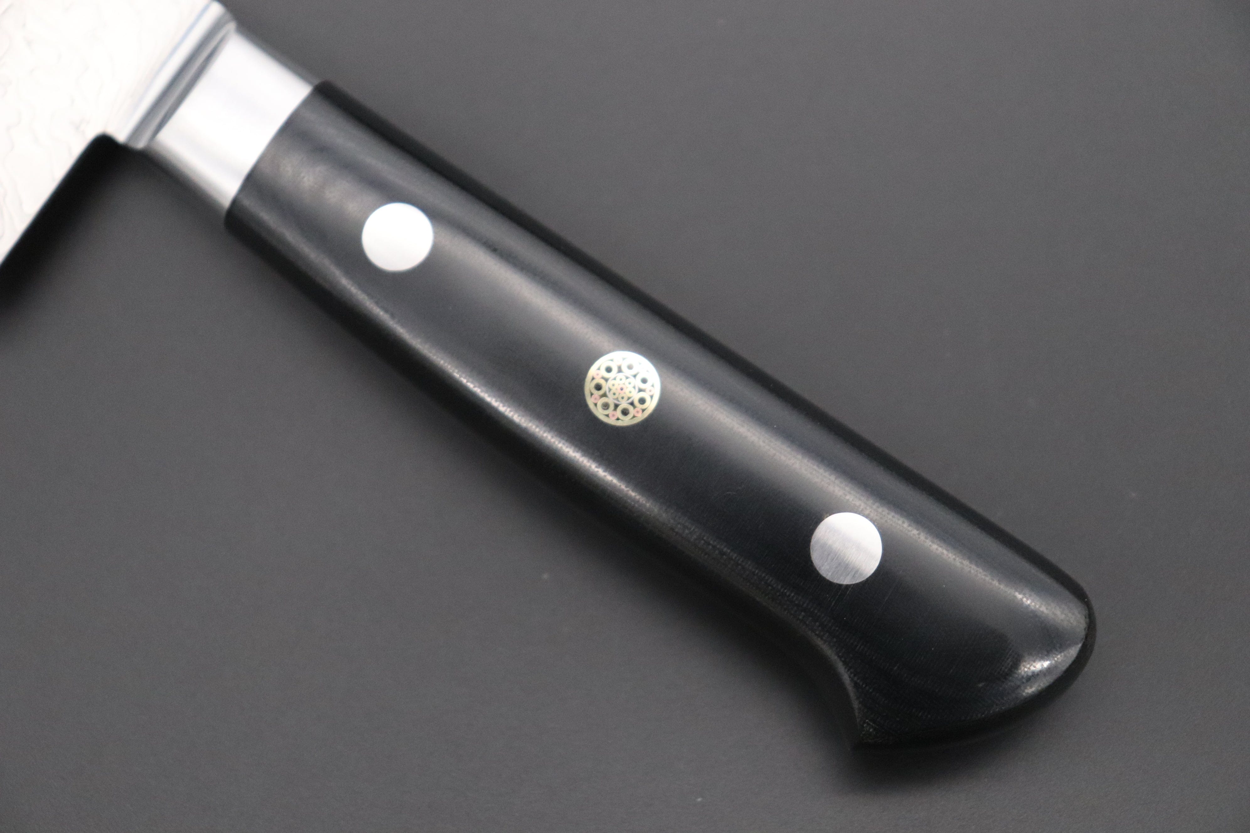 For the core steel of this Damascus knife, Master Craftsman Mr. Gotou selected a special Powdered Metallurgy High Speed Tool Steel called “R-2”, which he heat-treats to HRc. 63. R-2 is made by a highly reputable Japanese company called Kobelco, and the steel offers remarkable cutting performance and edge retention. The two outer layers of the blade are made from a unique and elegantly patterned Damascus steel, which is comprised of alternating layers of white-colored nickel steel and sparkling mirror polished layers of steel.