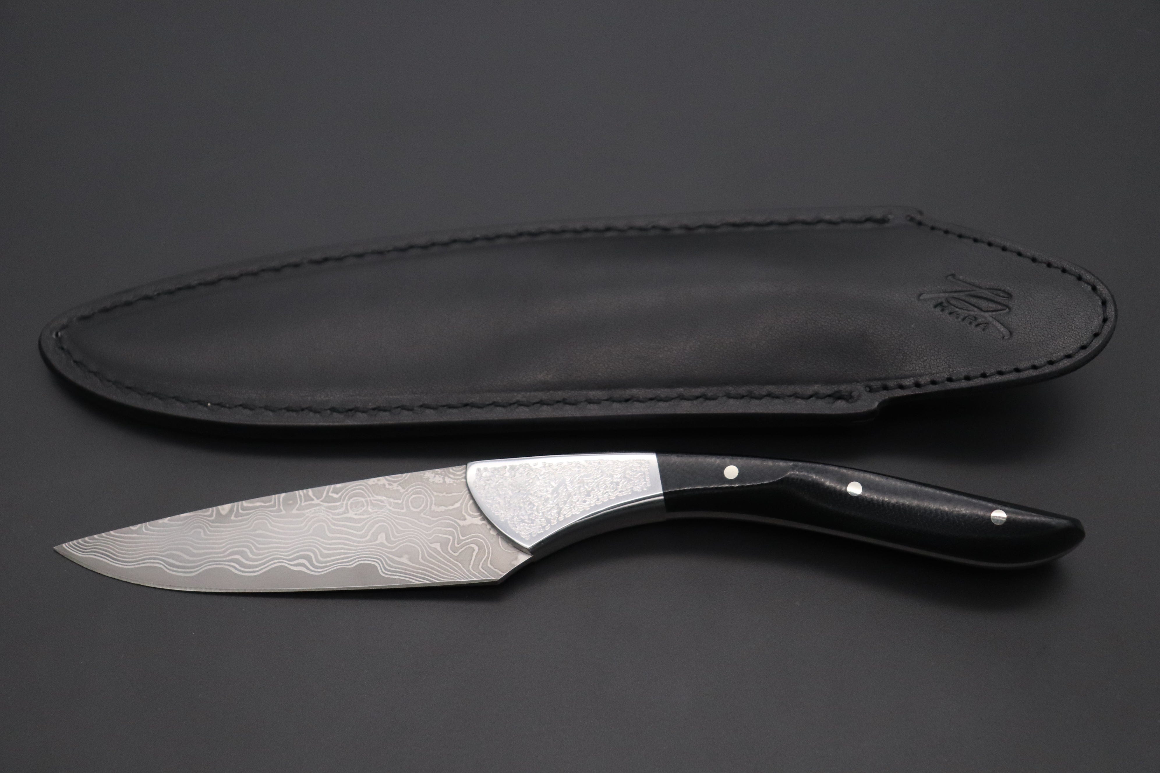 Koji Hara has thoughtfully included a handcrafted black leather sheath for carrying this utility table steak knife, perfect for dining at restaurants or using as an outdoor utility knife on your outdoor adventures.