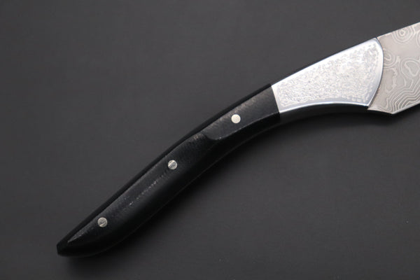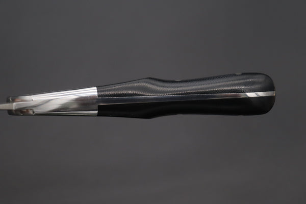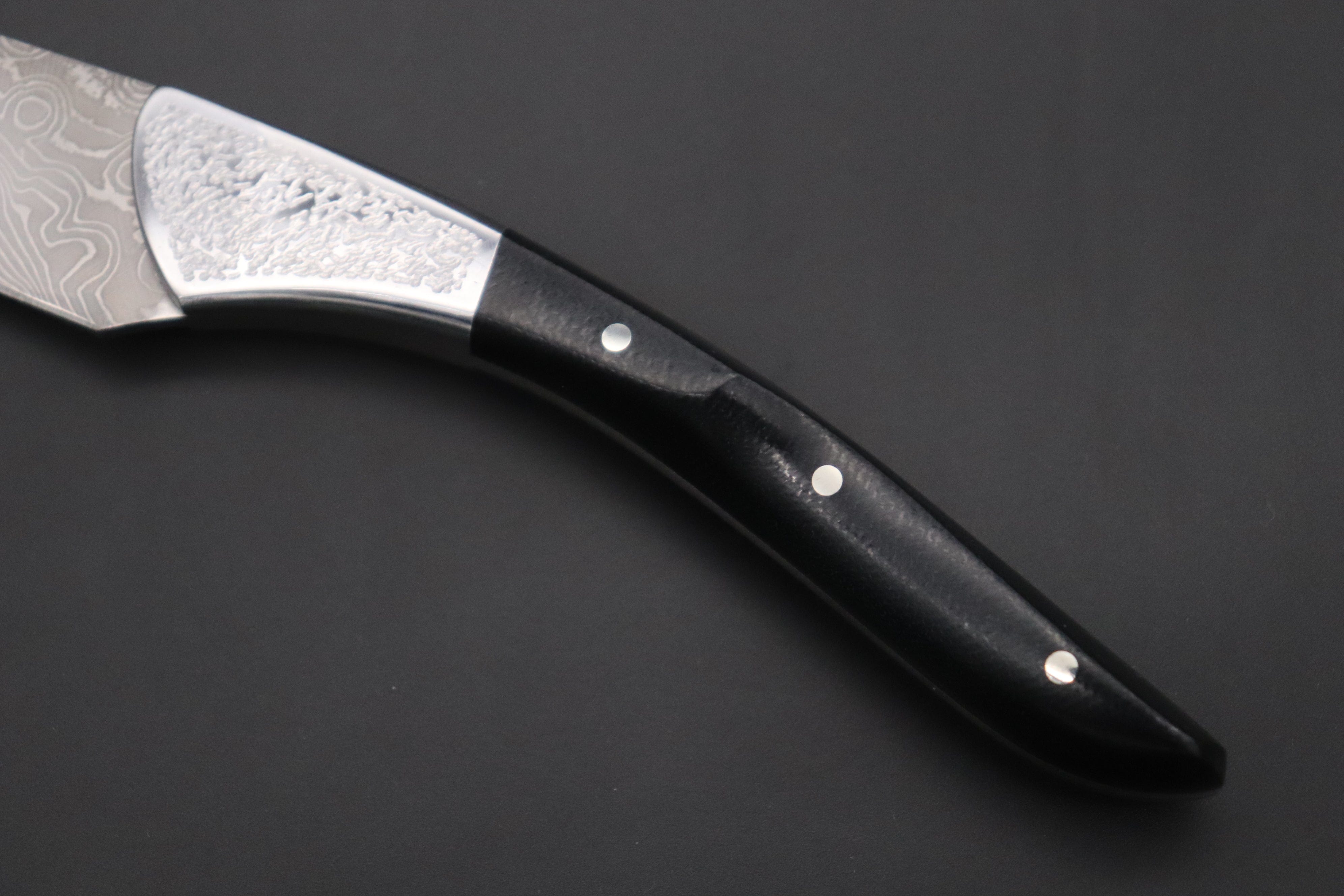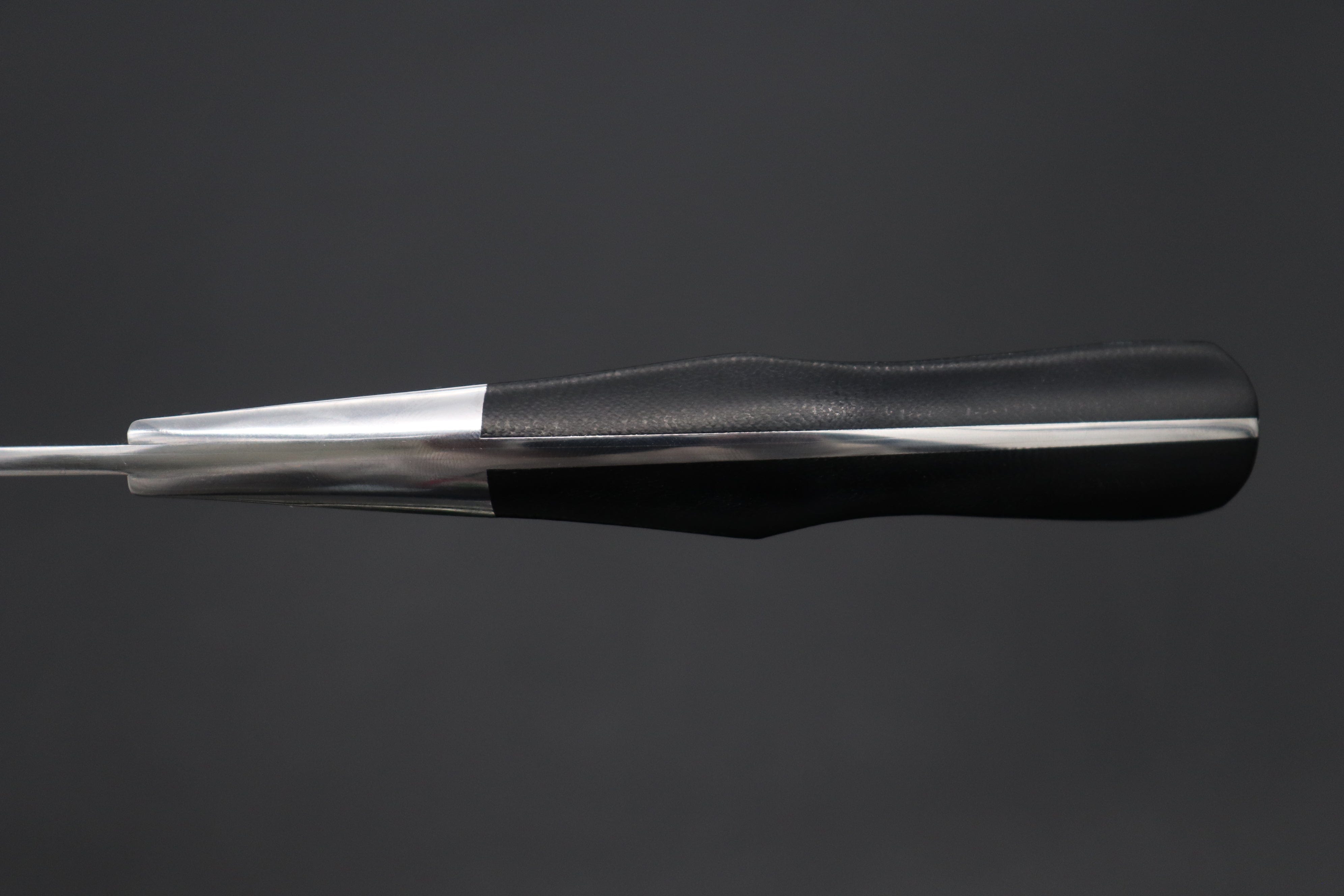 Koji Hara, renowned for his diverse skills and extensive experience, has crafted a new line of Custom Utility Steak knives, combining his experience of hammer forging skills and precise and detailed handcrafting process. Hammer forged R-2 nickel Damascus steel blade, with Elegant and Powerful yet practical, custom handmade Black Canvas Micarta Handle with the Stainless Steel bolster, its surface are coming detailed hammered texture which is produced from Koji's very detailed manual hammering process Stainless Steel Bolster.