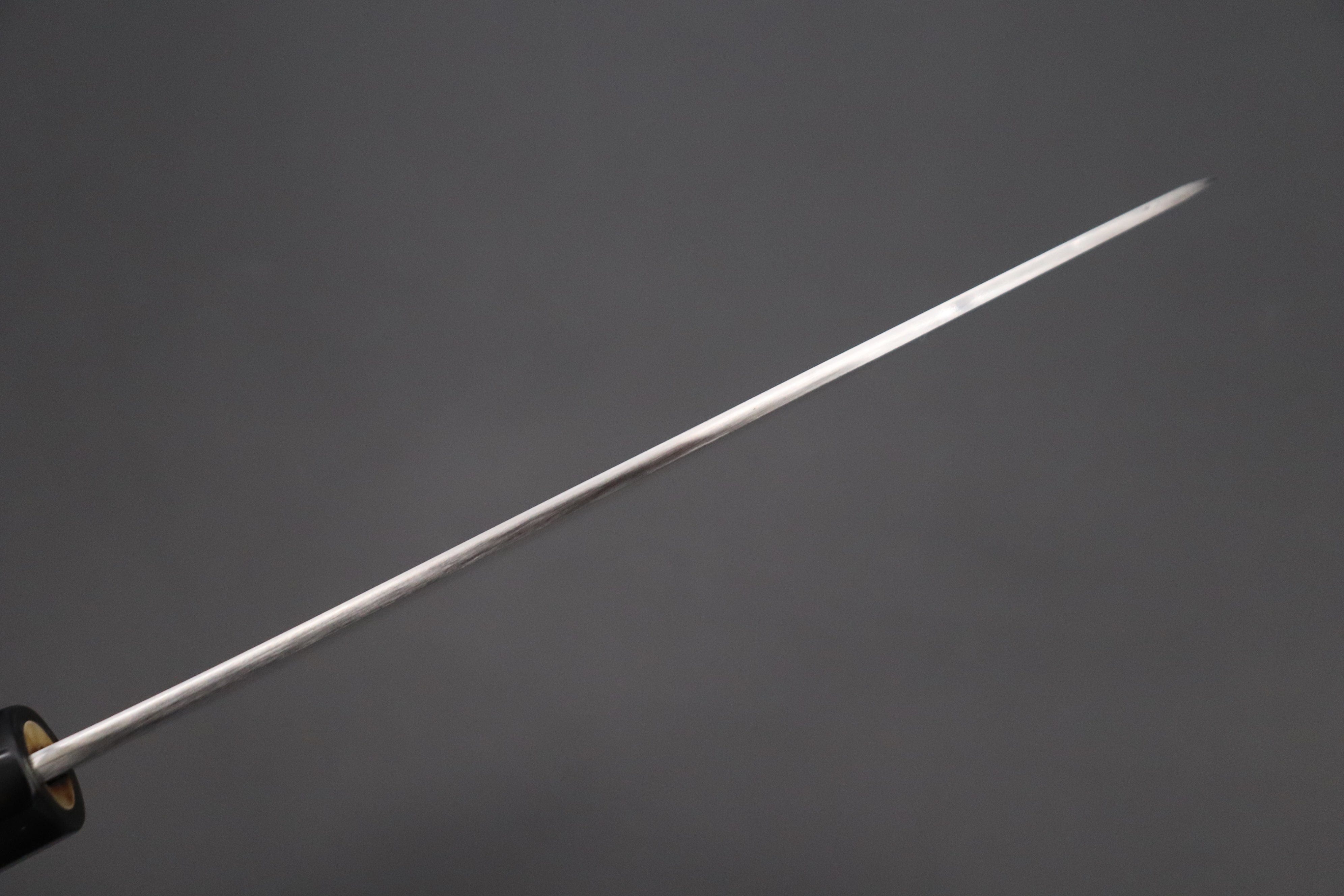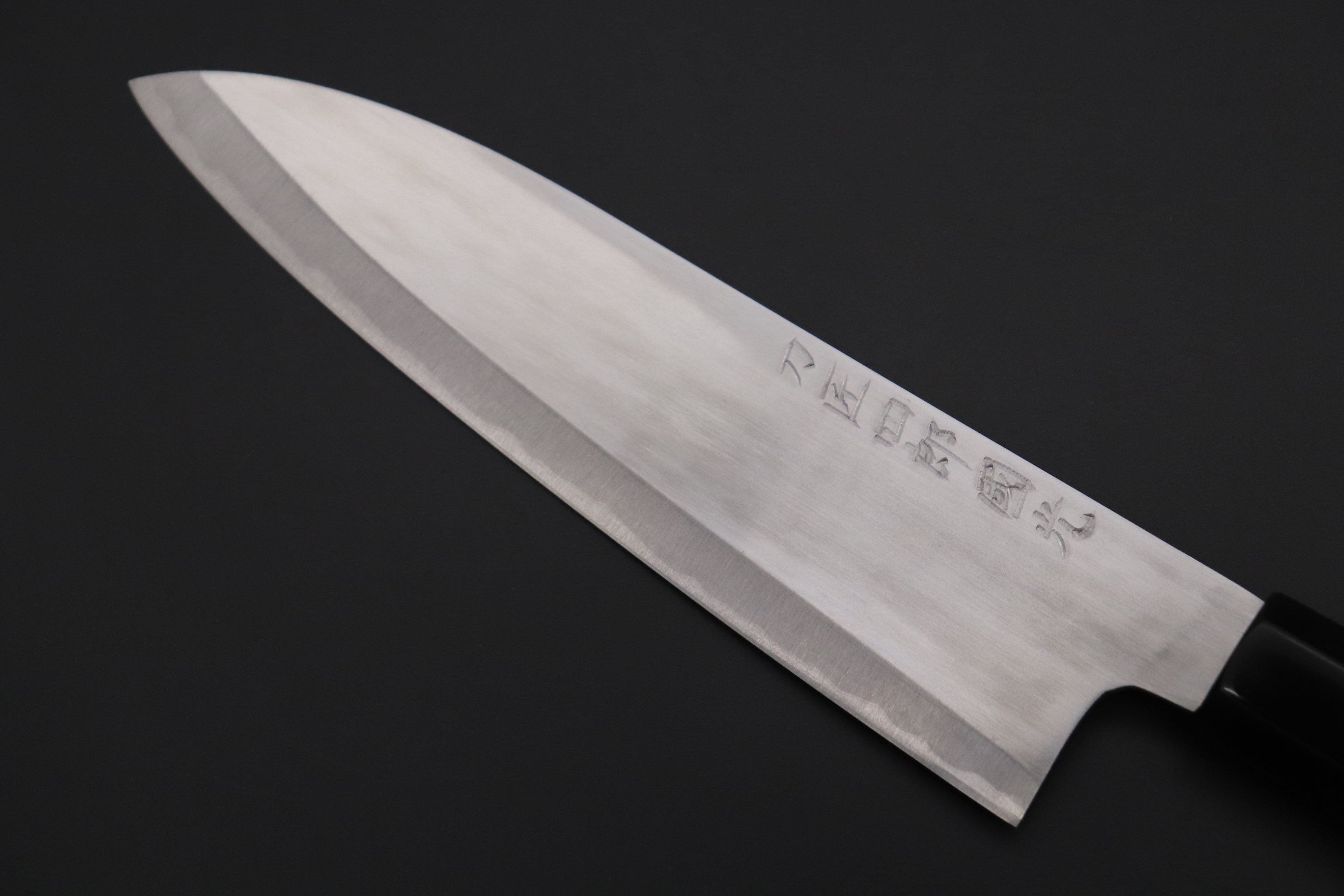 A Note About Sharpening Shiro-Kunimitsu Knives: Please do not add a micro-bevel, as this can lead to micro-chipping of the already fine, sharp cutting edge. To maintain the flat factory bevel and bevel angle, we recommend placing the whole bevel flat on the whetstone and applying finger pressure between the cutting edge and Shinogi (The line formed by the bevel and main blade face / cheek) during each sharpening stroke. Please use the same number of sharpening strokes on each side of the knife and de-burr the wire-edge using very light finger pressure, alternating between bevels every few strokes until it is removed.