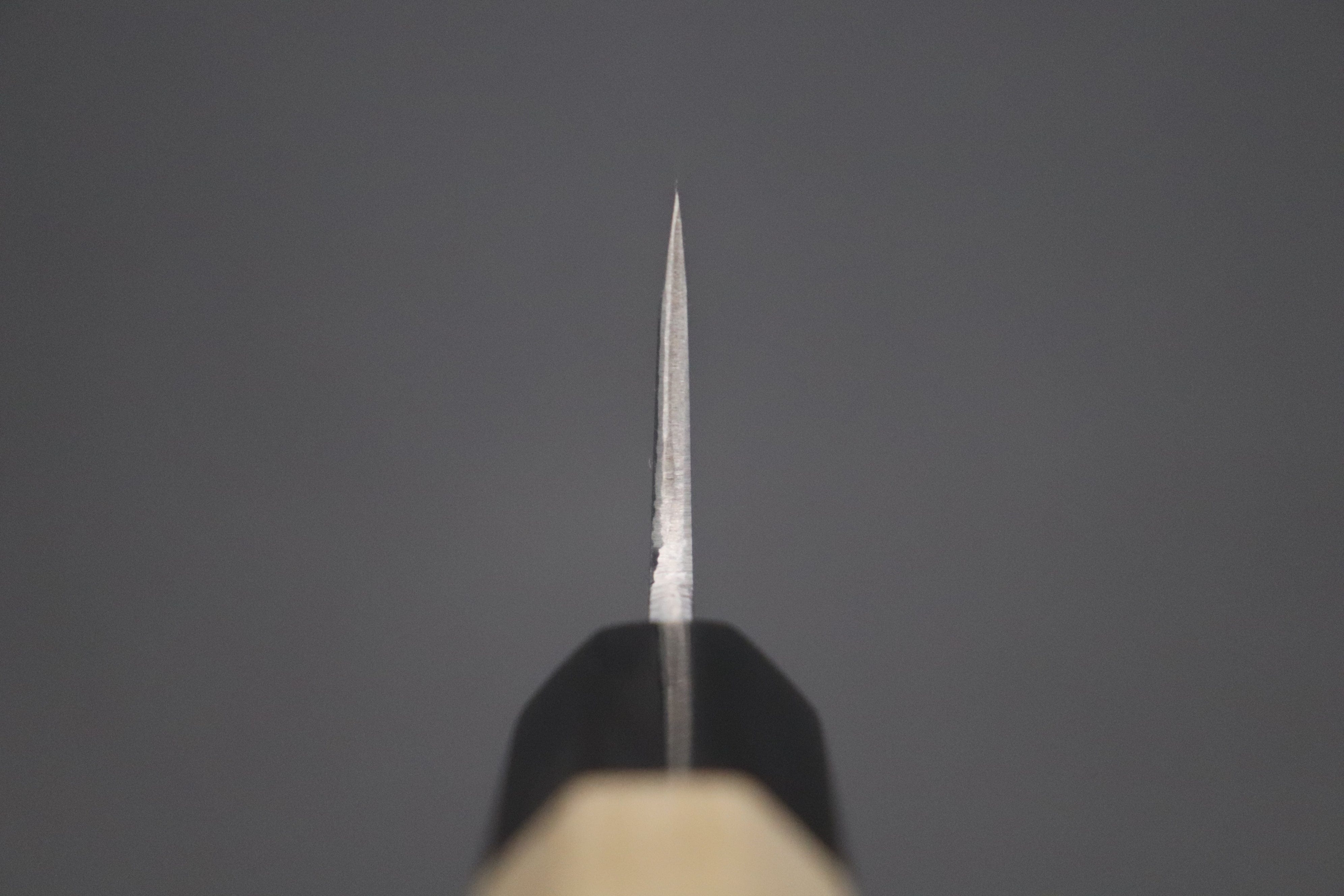 Shirou-Kunimitsu knives have a 50/50 blade grind and a simple edge shape. Each knife is carefully ground by hand and is then hand sharpened with a water-cooled whetstone wheel to create an even, natural and specially tapered 50/50 edge shape. Both sides of the blade have a SHINOGI line (The line that is created where the ground blade bevel and the blade face / side meet), below the SHINOGI you can see the expert hand grinding and hand sharpening of the specially tapered 50/50 blade bevels and the handcrafted, custom created edge shape.