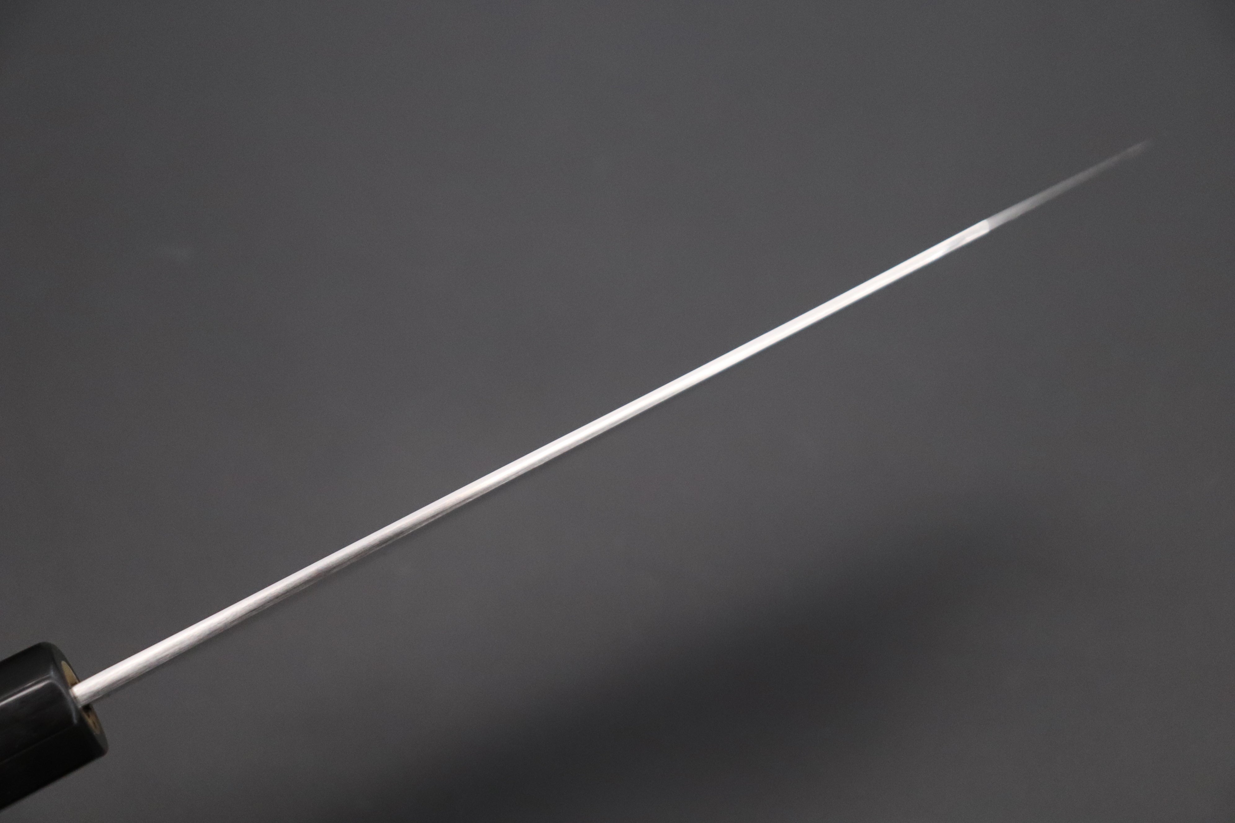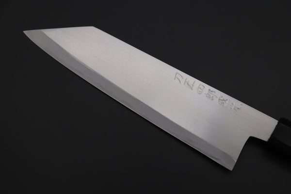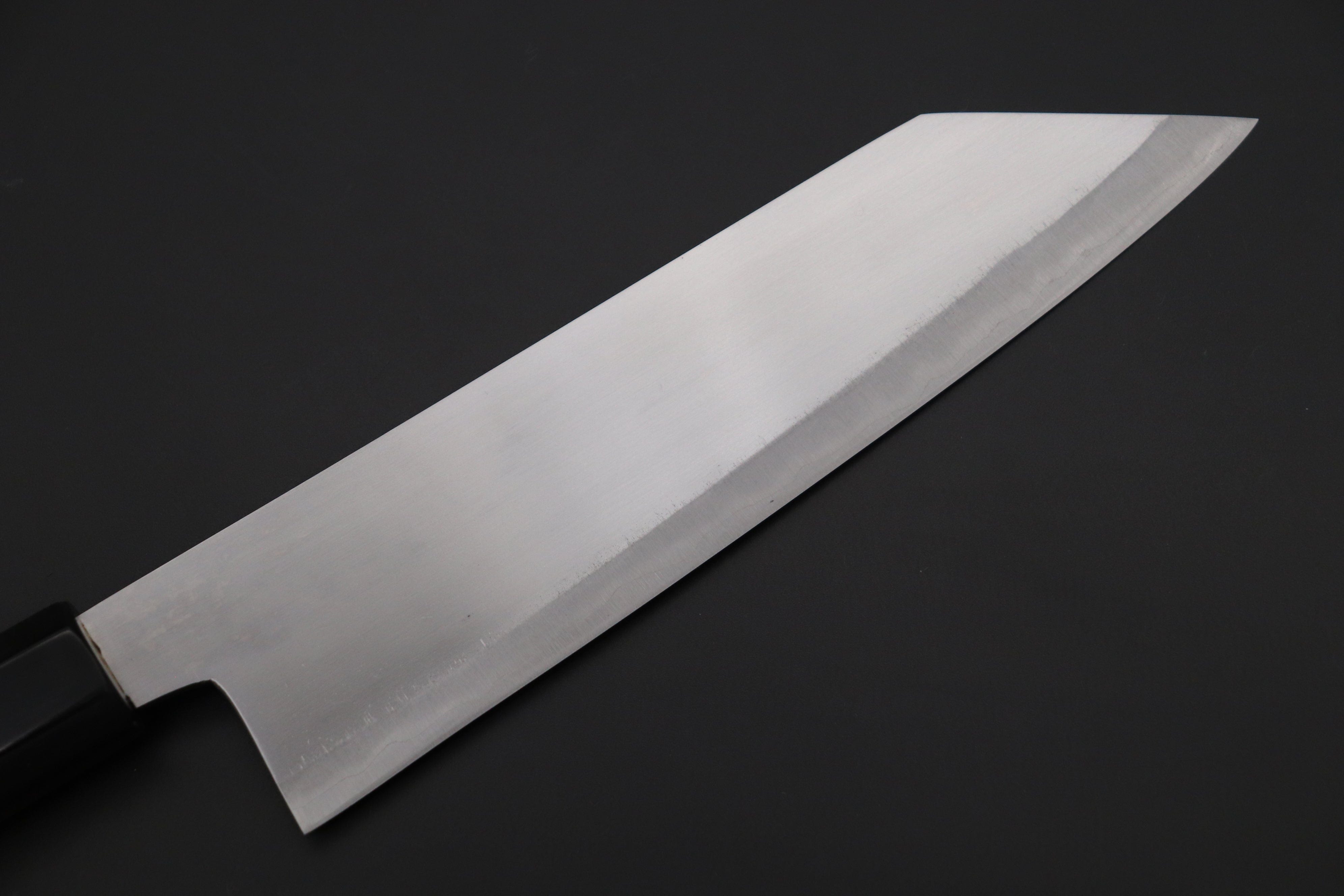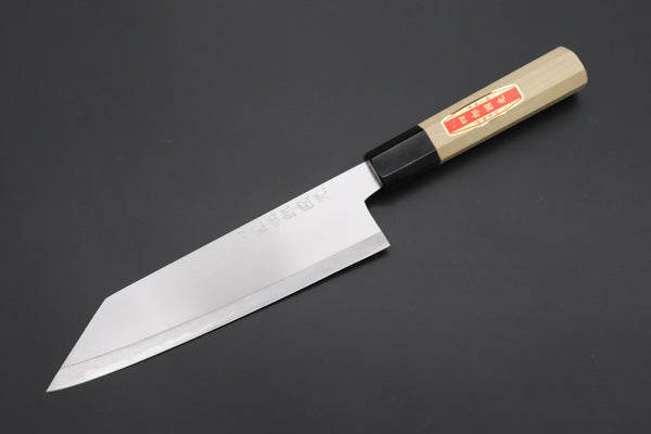 A Note About Sharpening Shiro-Kunimitsu Knives: Please do not add a micro-bevel, as this can lead to micro-chipping of the already fine, sharp cutting edge. To maintain the flat factory bevel and bevel angle, we recommend placing the whole bevel flat on the whetstone and applying finger pressure between the cutting edge and Shinogi (The line formed by the bevel and main blade face / cheek) during each sharpening stroke. Please use the same number of sharpening strokes on each side of the knife and de-burr the wire-edge using very light finger pressure, alternating between bevels every few strokes until it is removed.
