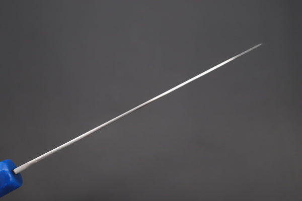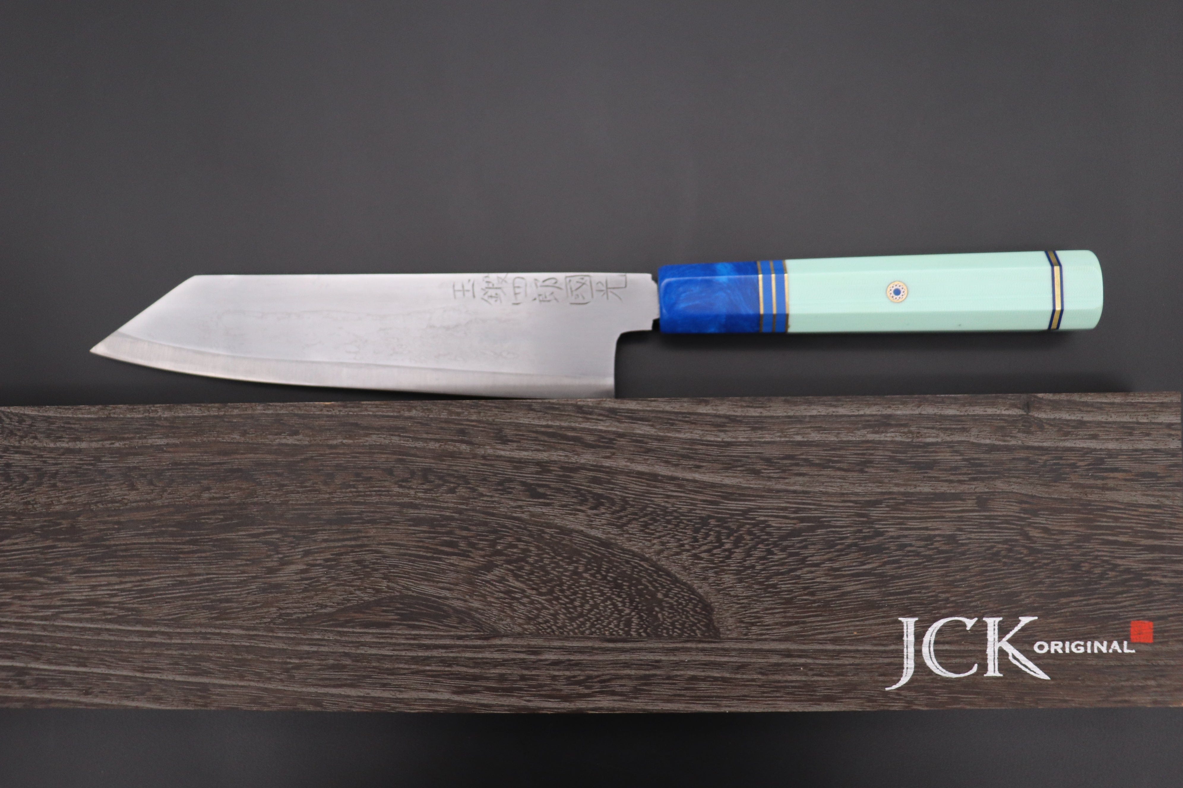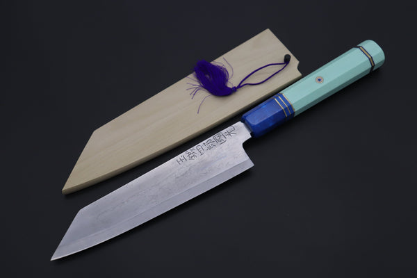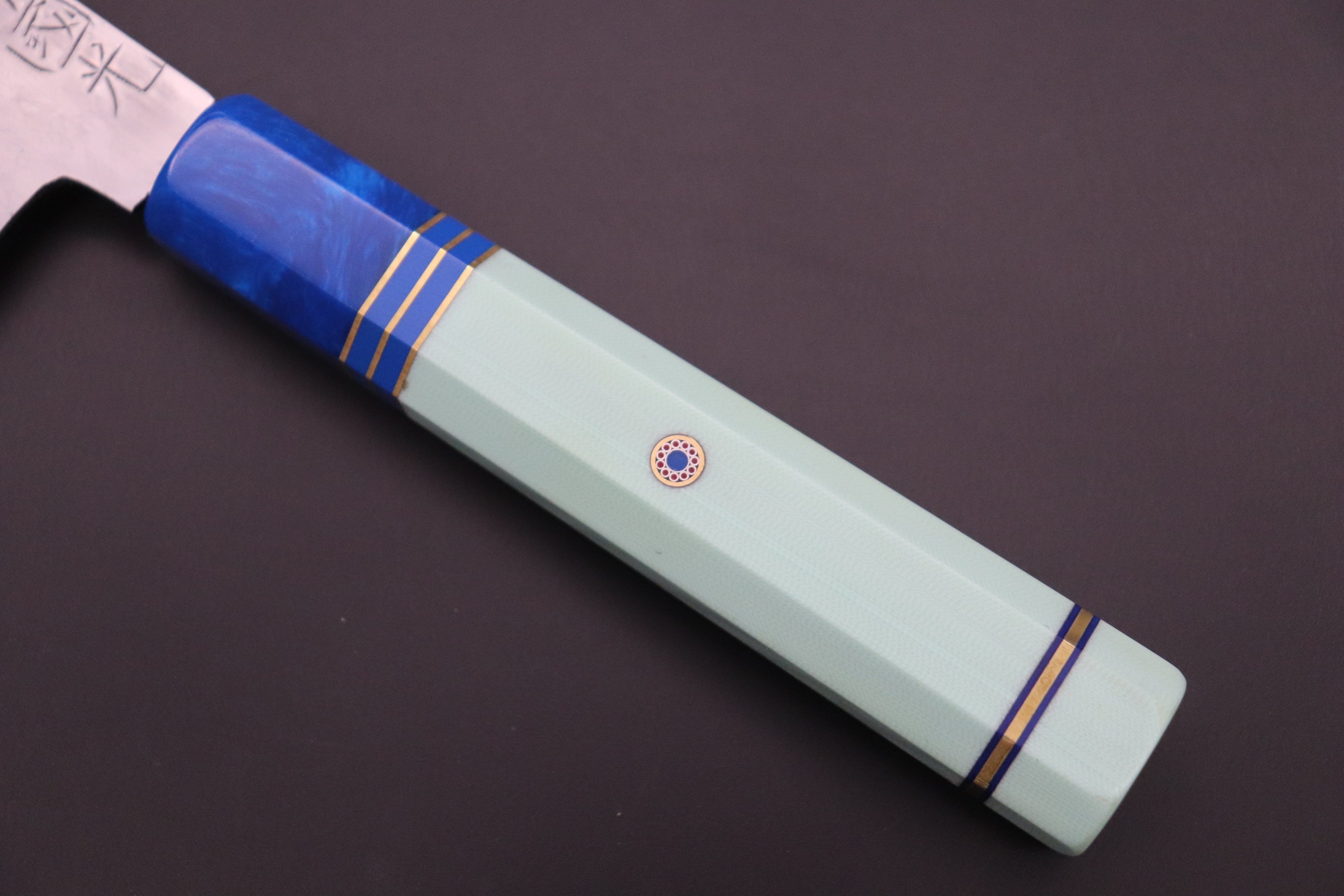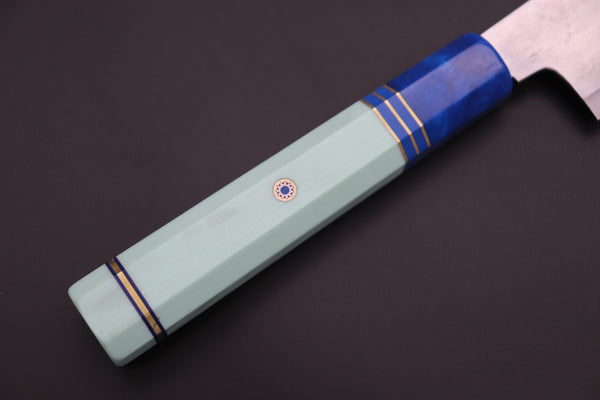 This Special Custom Order SHIROU-KUNIMITSU Bunka 190mm knife comes with a Custom Hand-Made Octagonal Handle (G10 body and endcap, Resin ferrule, g10 collar with Nickel Silver and Blue line spacers and Mosaic Pin)