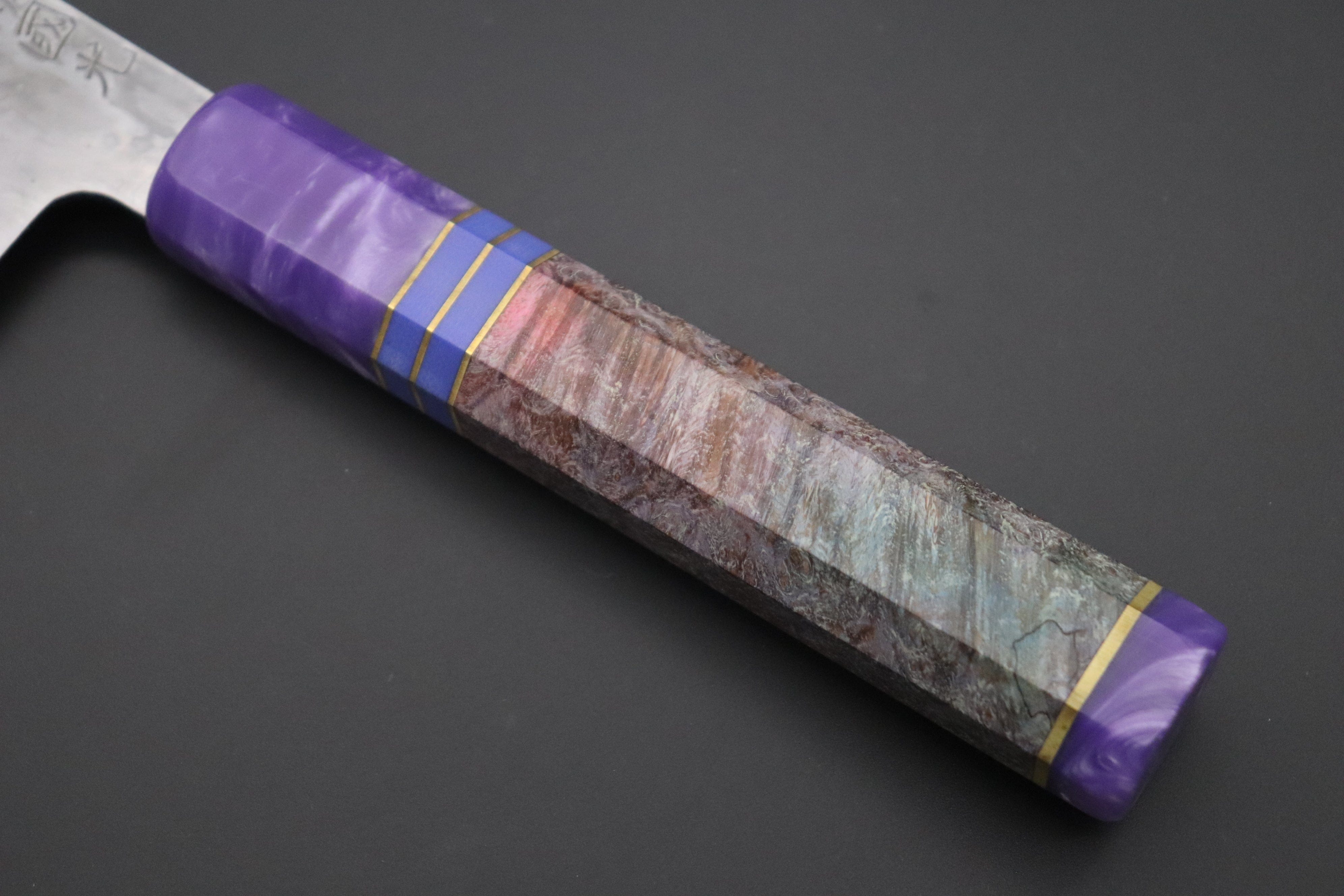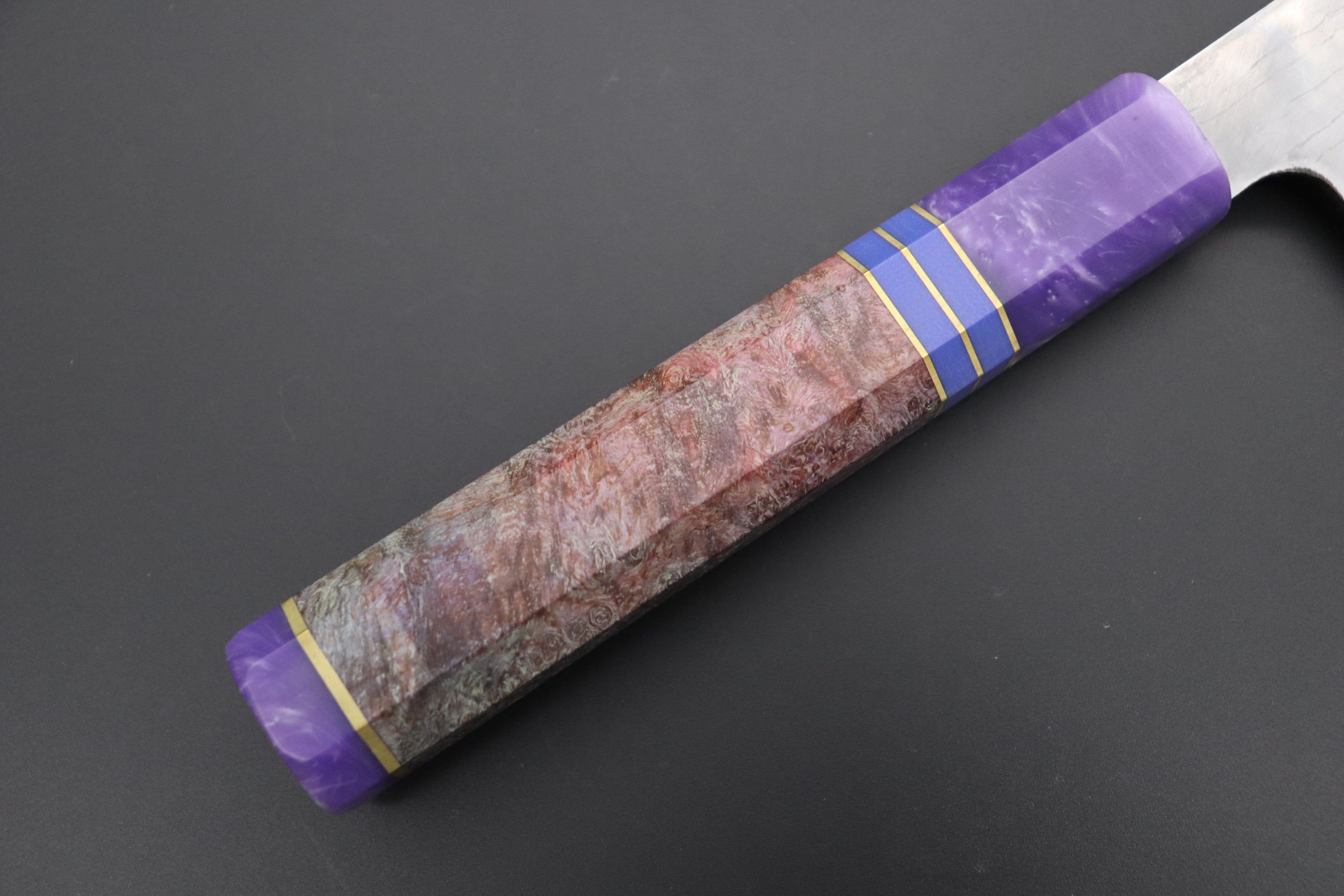 This Special Custom Order SHIROU-KUNIMITSU Bunka 190mm knife comes with a Custom Hand-Made Octagonal Handle (Stabilized and Dyed Maple Burl body, Resin ferrule and endcap with G10 collar and Brass spacers).