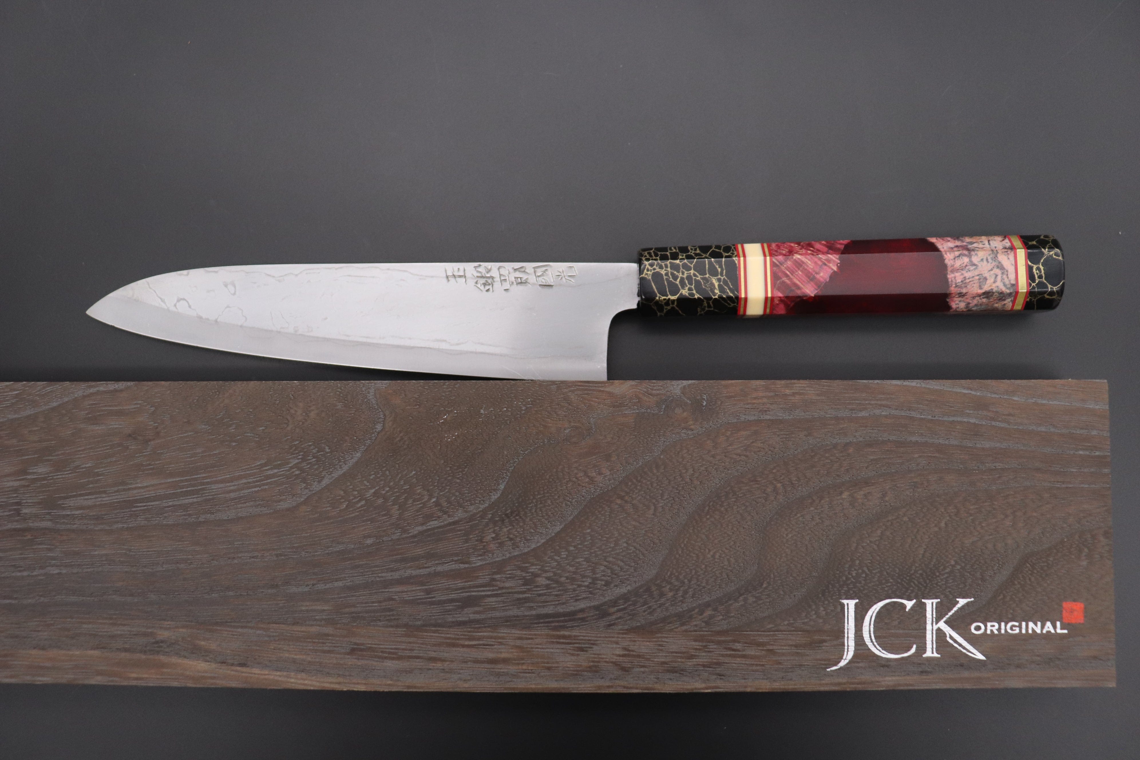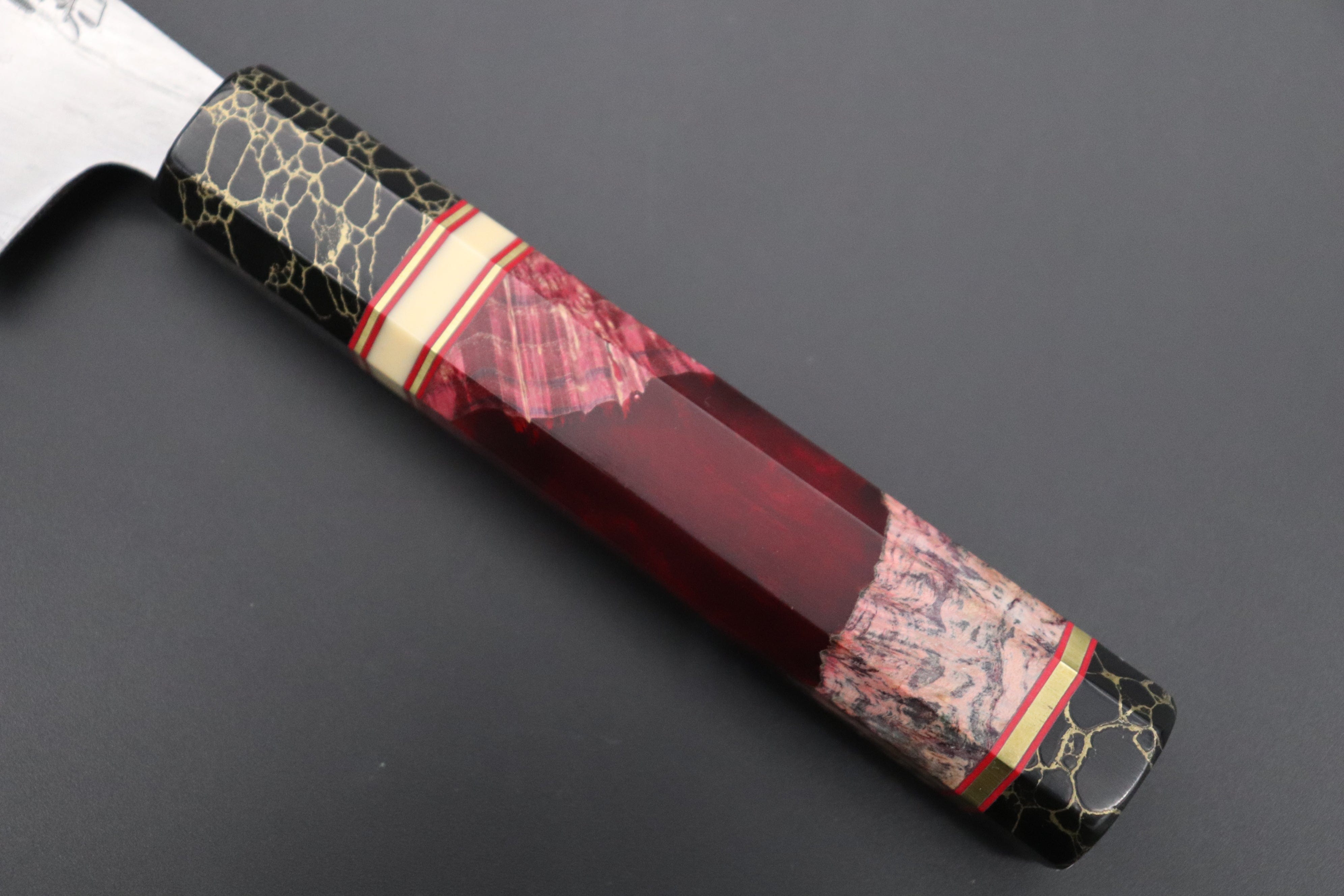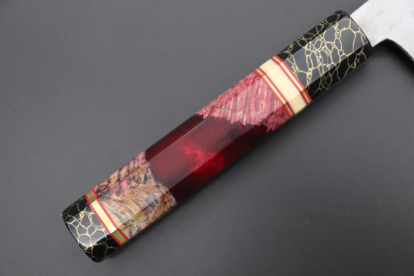 This Special Custom Order SHIROU-KUNIMITSU Wa-Gyuto 210mm knife comes with a Custom Handmade Octagonal Handle (Wood Resin Hybrid body, Composite Stone ferrule and endcap, Resin collar with Brass and Red Liner spacers).