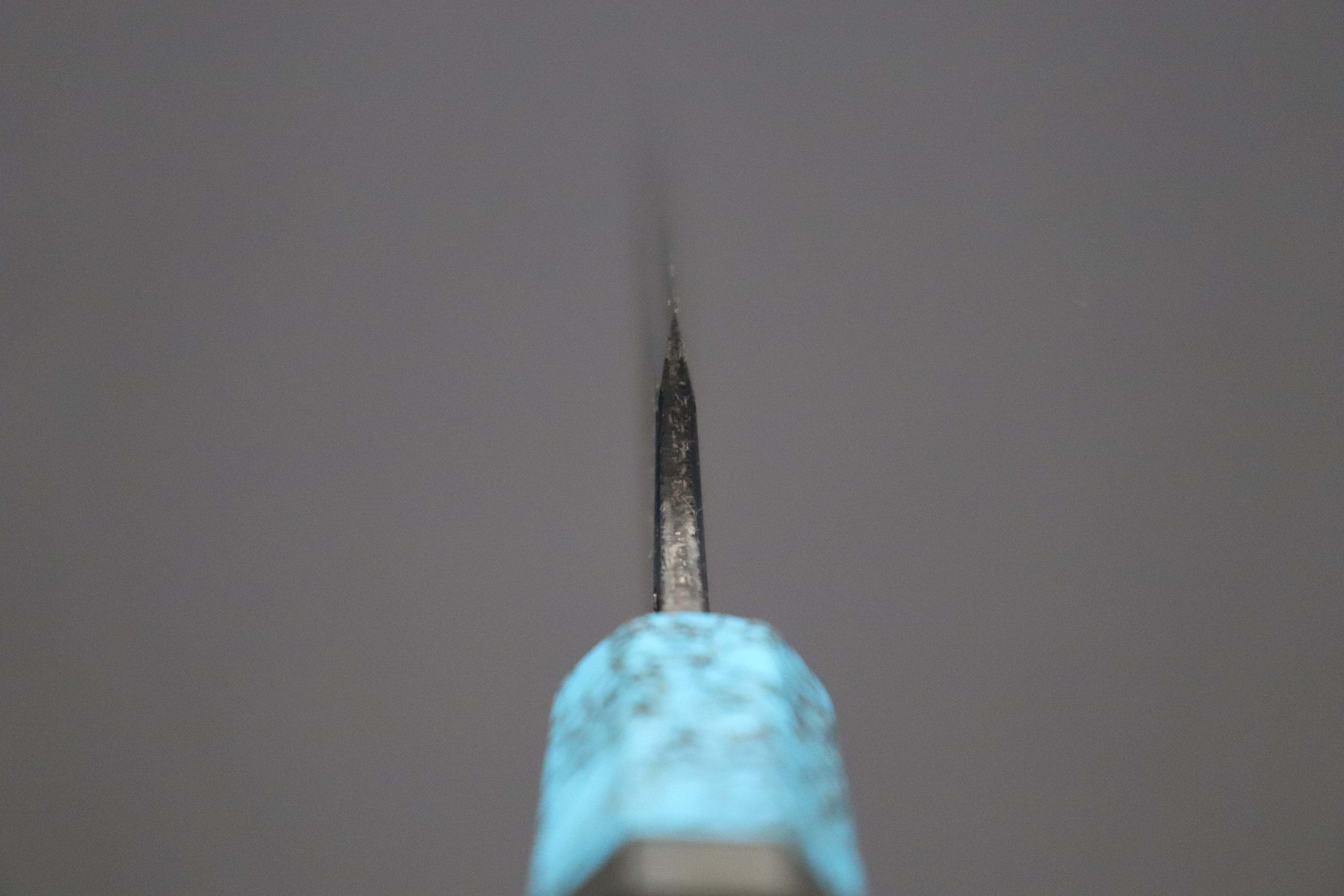 A Note About Sharpening Shiro-Kunimitsu Knives: Please do not add a micro-bevel, as this can lead to micro-chipping of the already fine, sharp cutting edge. To maintain the flat factory bevel and bevel angle, we recommend placing the whole bevel flat on the whetstone and applying finger pressure between the cutting edge and Shinogi (The line formed by the bevel and main blade face / cheek) during each sharpening stroke. Please use the same number of sharpening strokes on each side of the knife and de-burr the wire-edge using very light finger pressure, alternating between bevels every few strokes until it is removed.