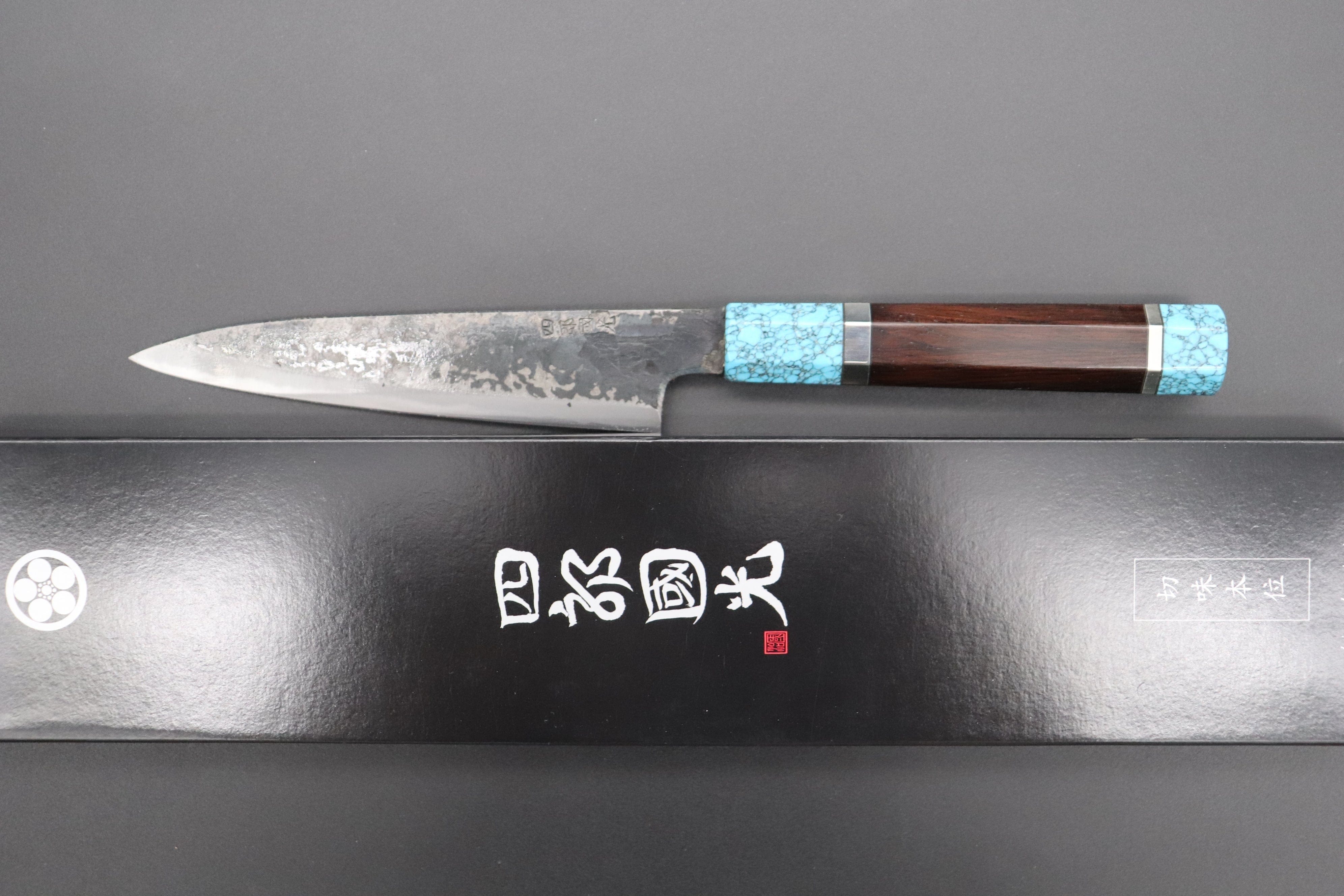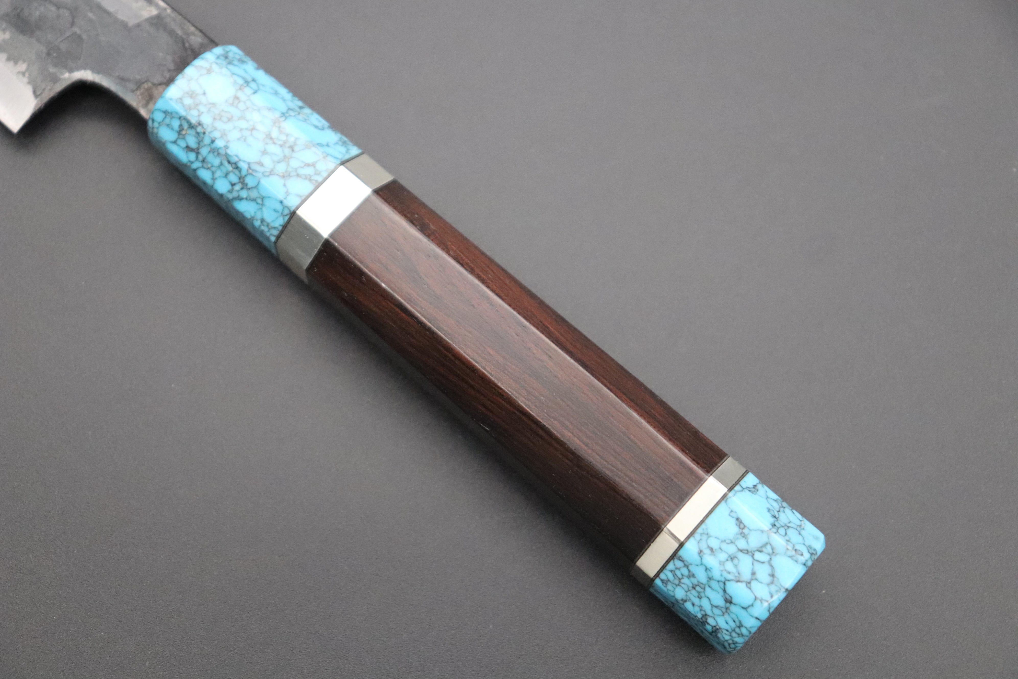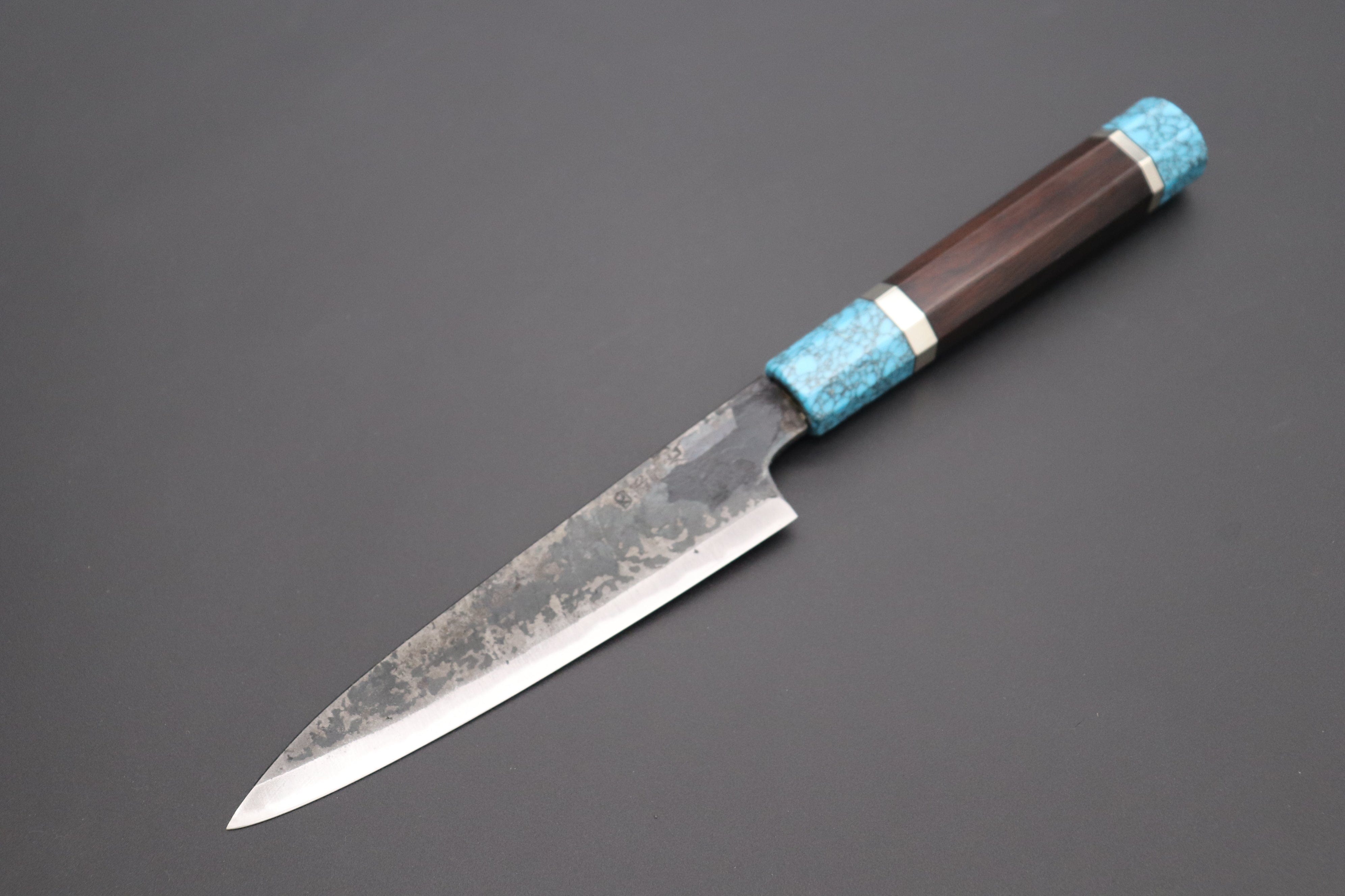 This Special Edition Wa Petty Knife with Contemporary, Stylish Wa Handle. The Innovative Octagonal Ebonywood handle with Turquoise Gem-Composite Stone Ferrule & Butt with Nickel Silver Spacers.