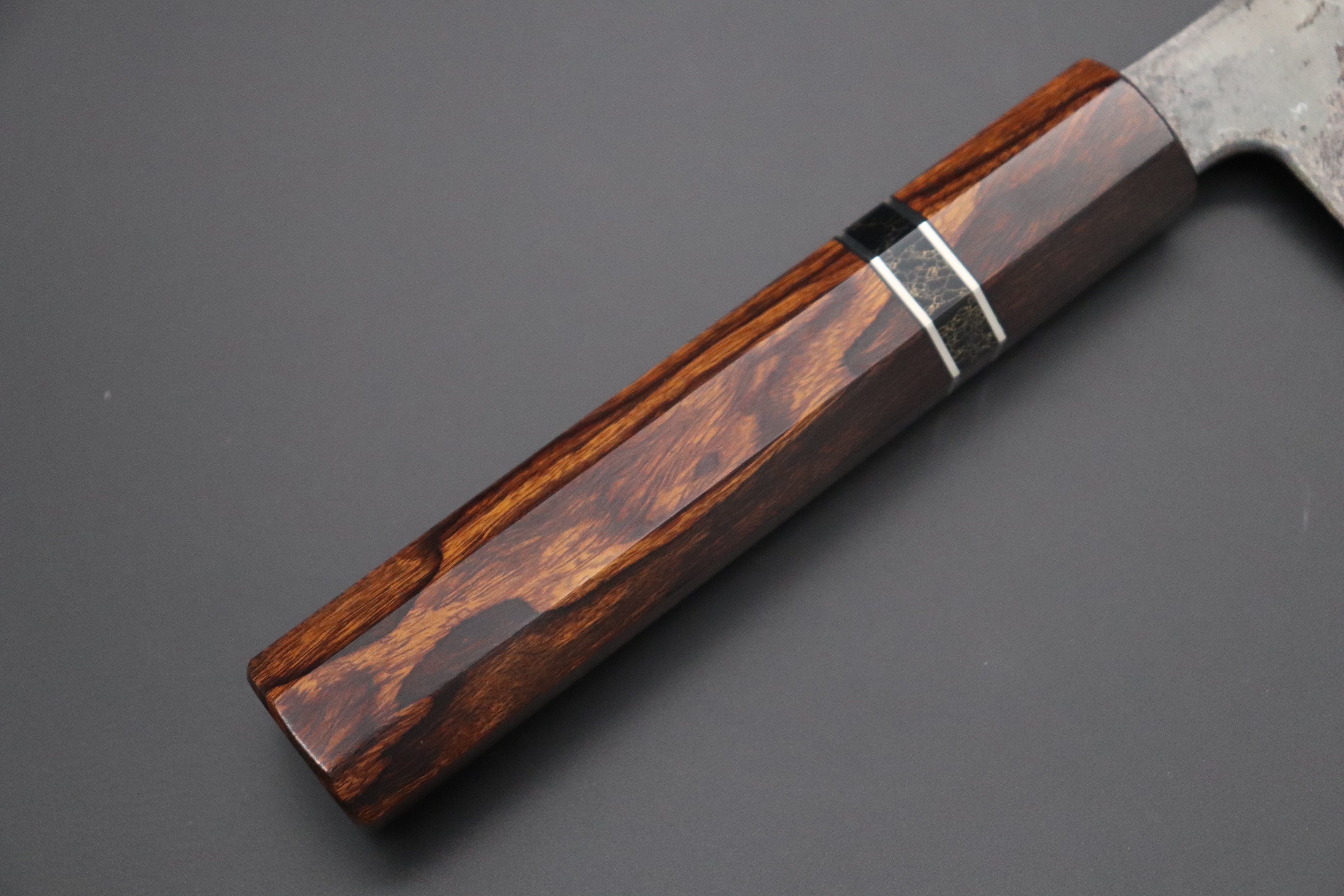 This Special Edition Wa Gyuto Knife with Contemporary, Stylish Wa Handle. The Innovative Octagonal Desert Ironwood Handle with Composite Black Color Turquoise Gemstone Ring and Nickel Silver Spacers.