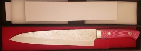 The attractive shiny SRS-13 blade core of these knives contrasts strongly against the textured, soft stainless steel outer cladding layers. The hand-contoured Red&White Linen Micarta Handle provides a secure grip and extra durability. Unlike the bland machine-produced handles of regular Western-style knives, when we grip the handles of Takeshi Saji’s knives, we can feel the warmth of the craftsman’s vision for his entire handle making process - They are truly something special to own, hold and use. The custom handcrafted handles perfectly match his handcrafted, Traditional hammer forged blades, which have much more ‘soul”. Master Saji’s knives are also fitted with a polished stainless steel bolster for improved handle durability and blade balance. So, taken as a complete package, these knives are not only visually striking, they are also highly practical and easy to care for.