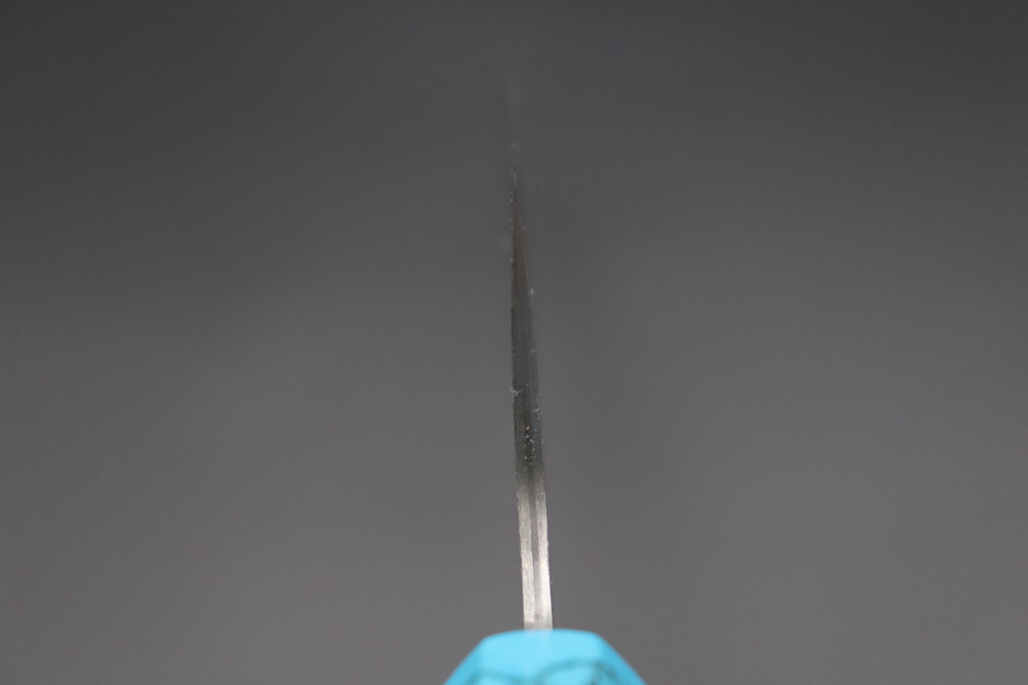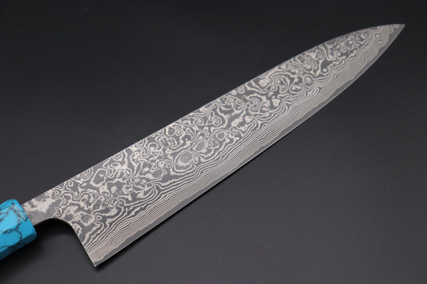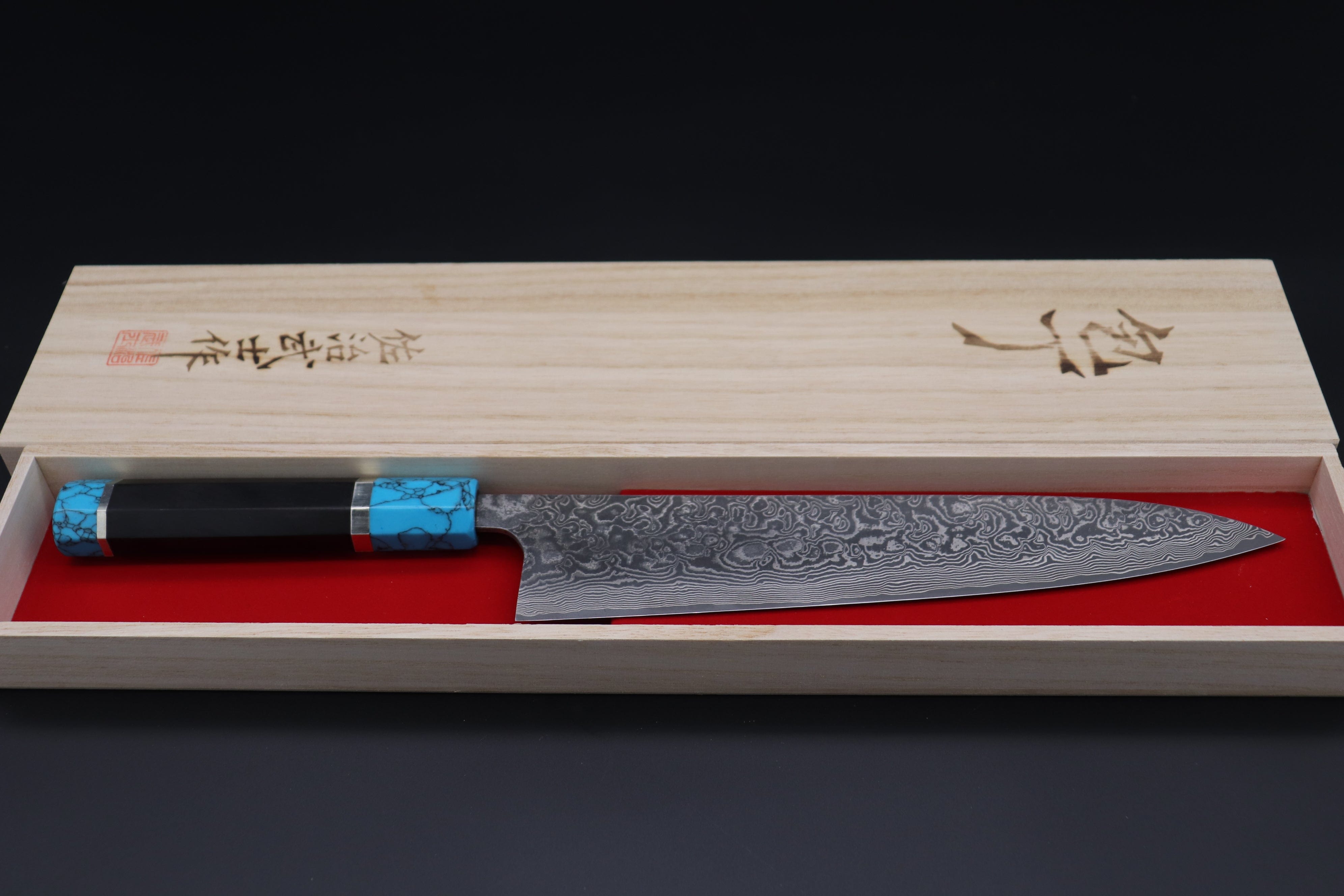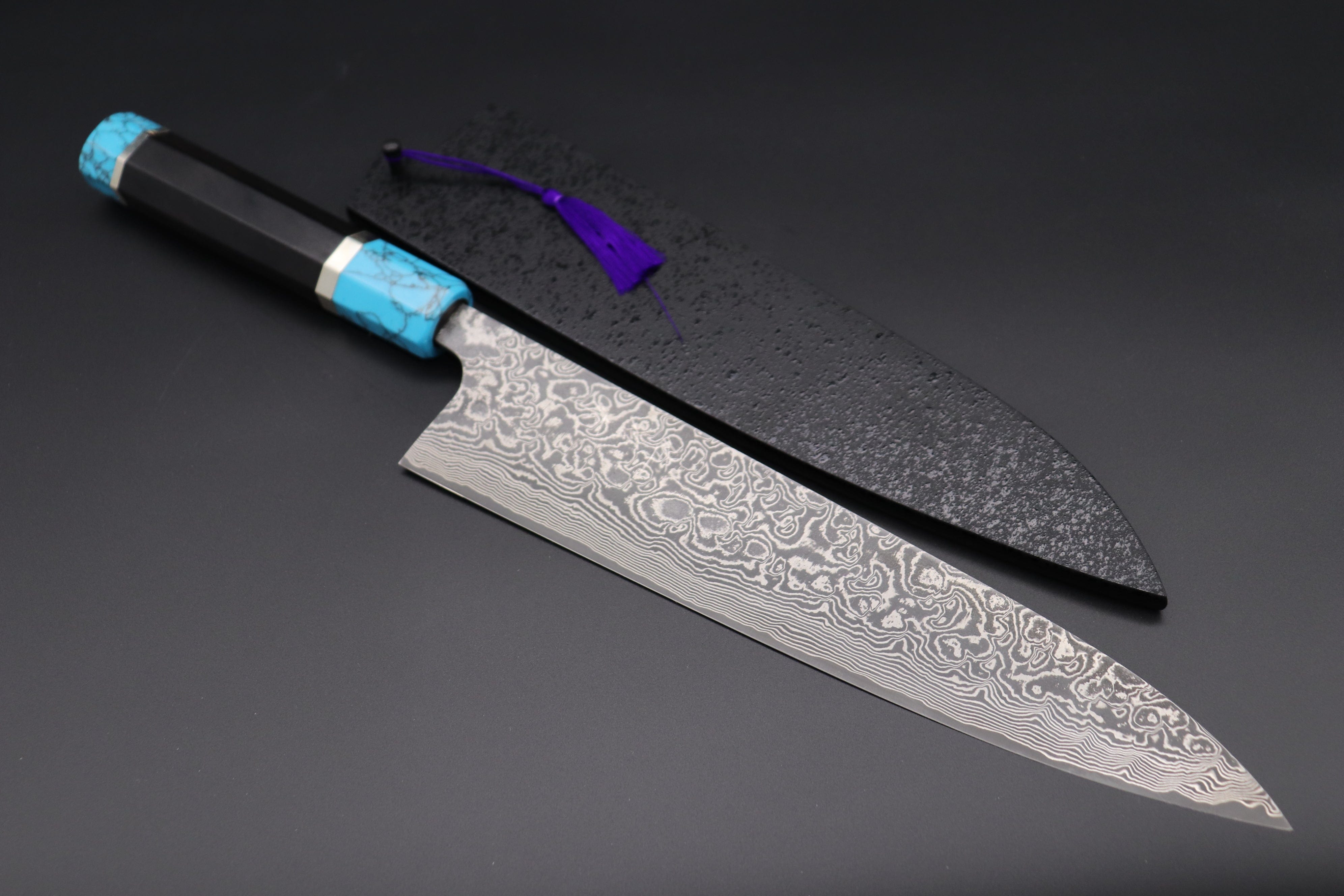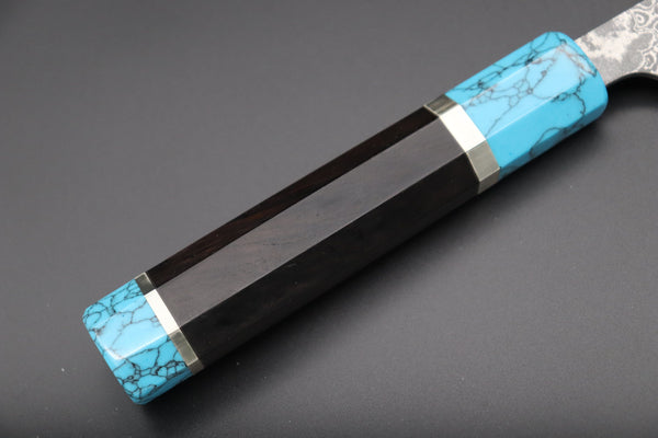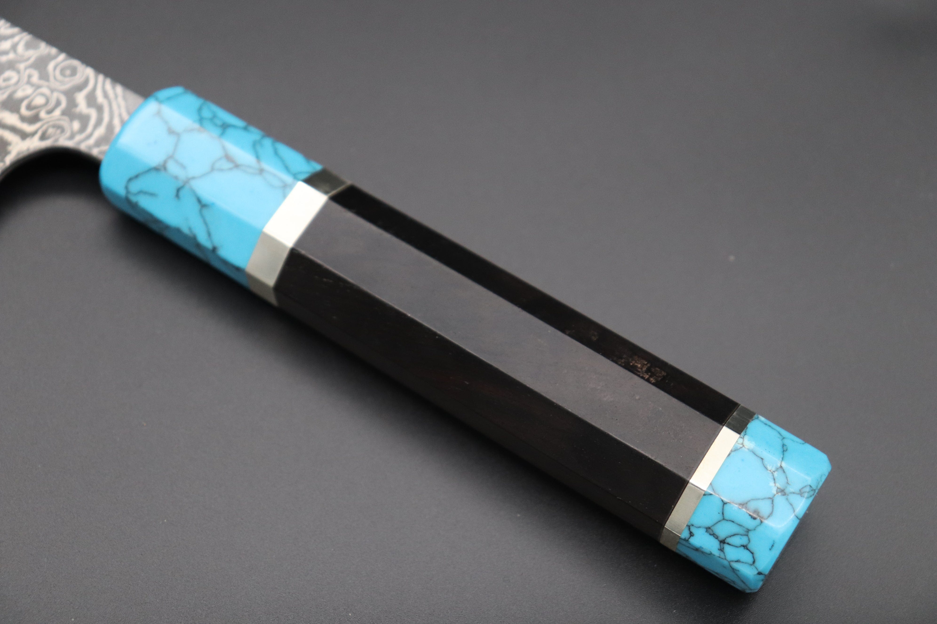 This Custom Limited Edition Takeshi Saji R-2 Damascus Wa-Gyuto Knife with Contemporary, Stylish Wa Handle and a matching Black Lacquered wood Saya (Sheath) with a black pakkawood Saya pin. The Innovative a Innovative Octagonal Ebony wood handle with a Turquoise Composite Stone Ferrule & Butt with Nickel Silver Spacers.