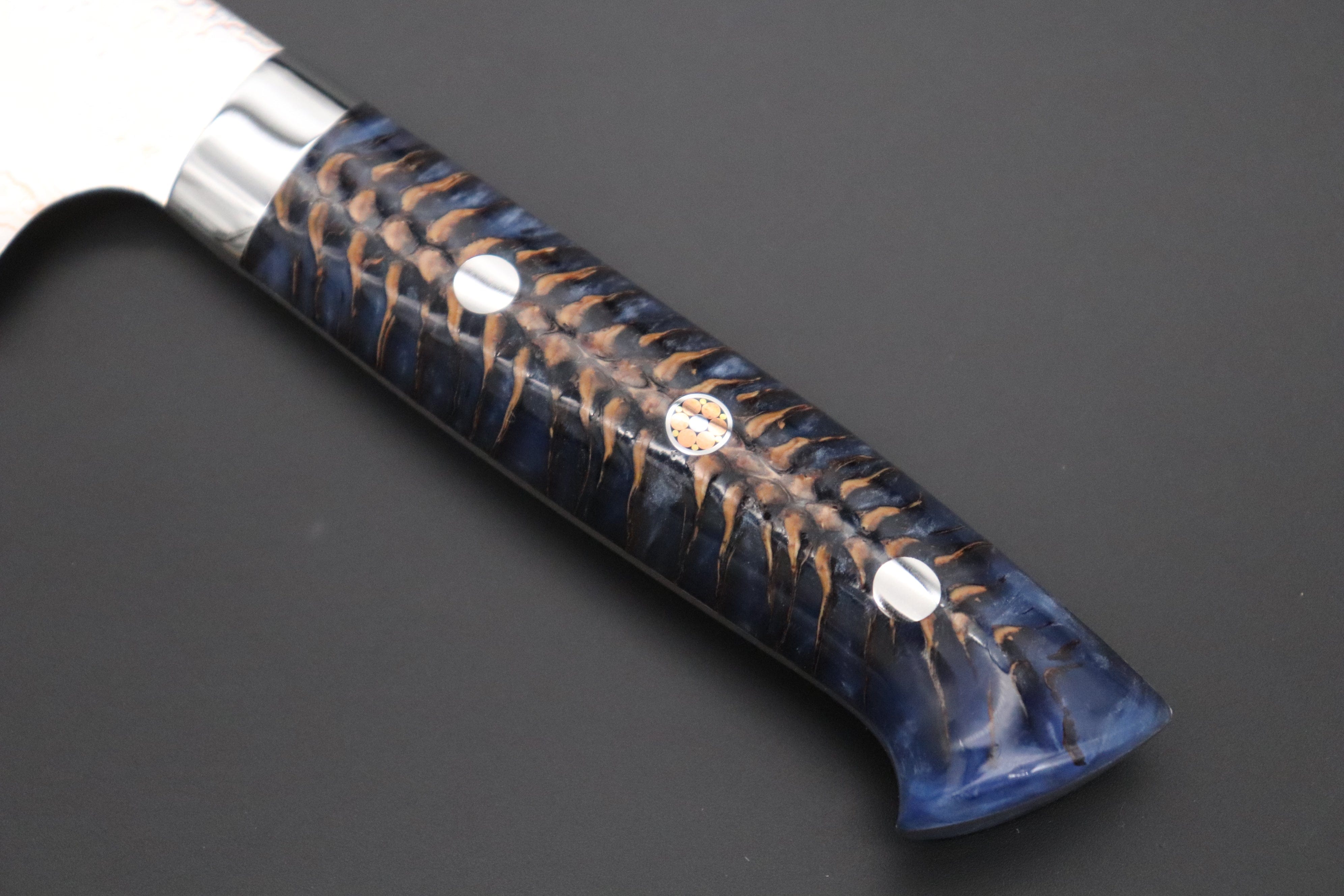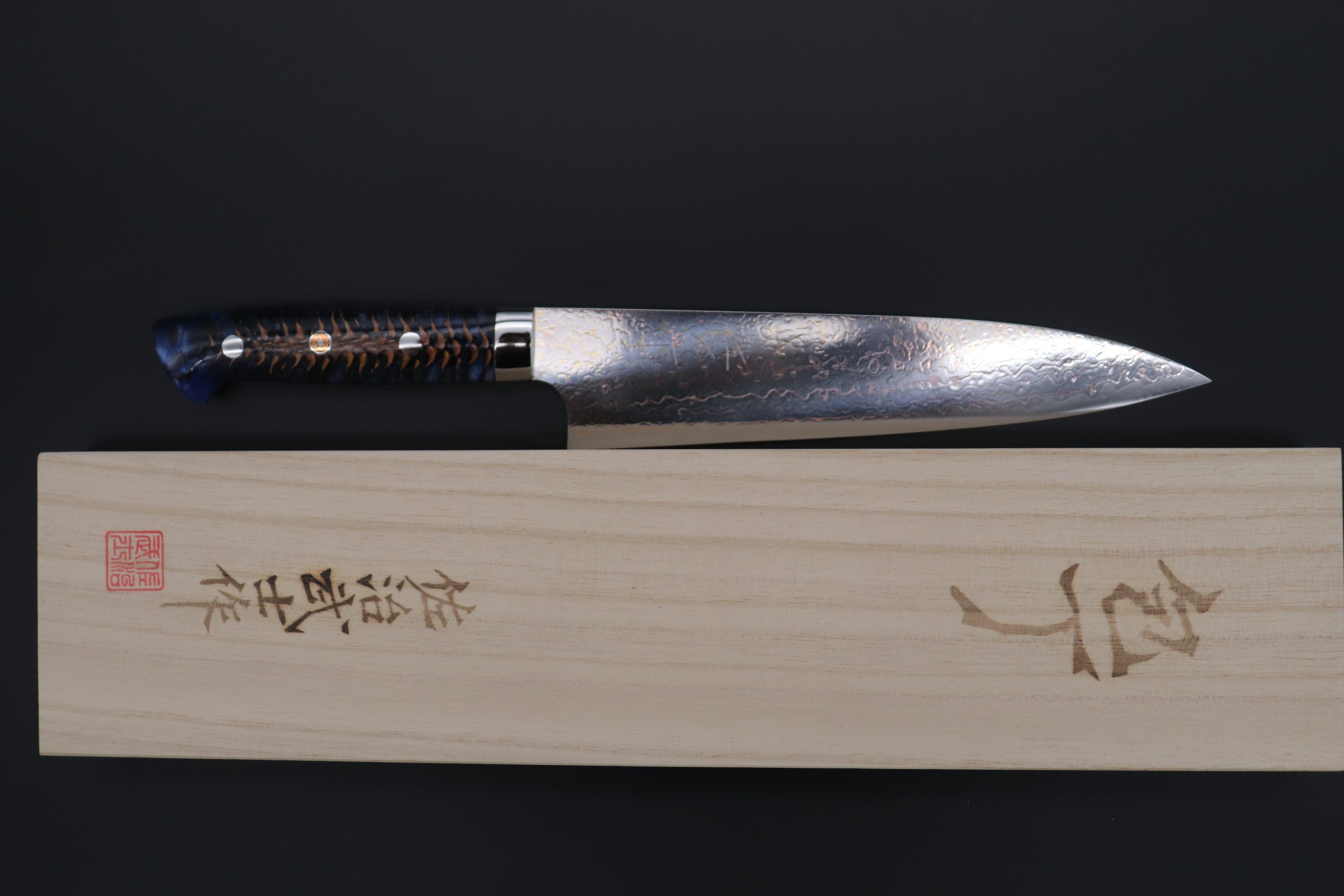 Master Saji has just completed a fresh new batch of traditional hammer forged custom kitchen knives that, once again, feature his unique multi-colored Damascus. The blades have a core of VG-10W Cobalt-Tungsten Stainless steel (HR.c 61 to 62), which has been clad with multiple layers of rust-resistant stainless steel, brass and copper.