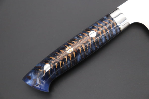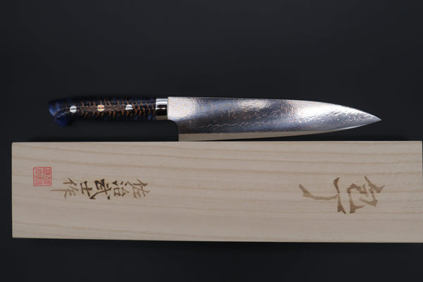 Takeshi Saji is a very well respected Master Smith, who specializes in making traditional hammer forged Japanese knives. We are often surprised by the variety of ideas he has and the very distinctive materials and rare steel that he uses for his custom knives.