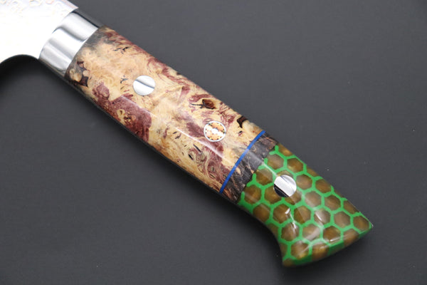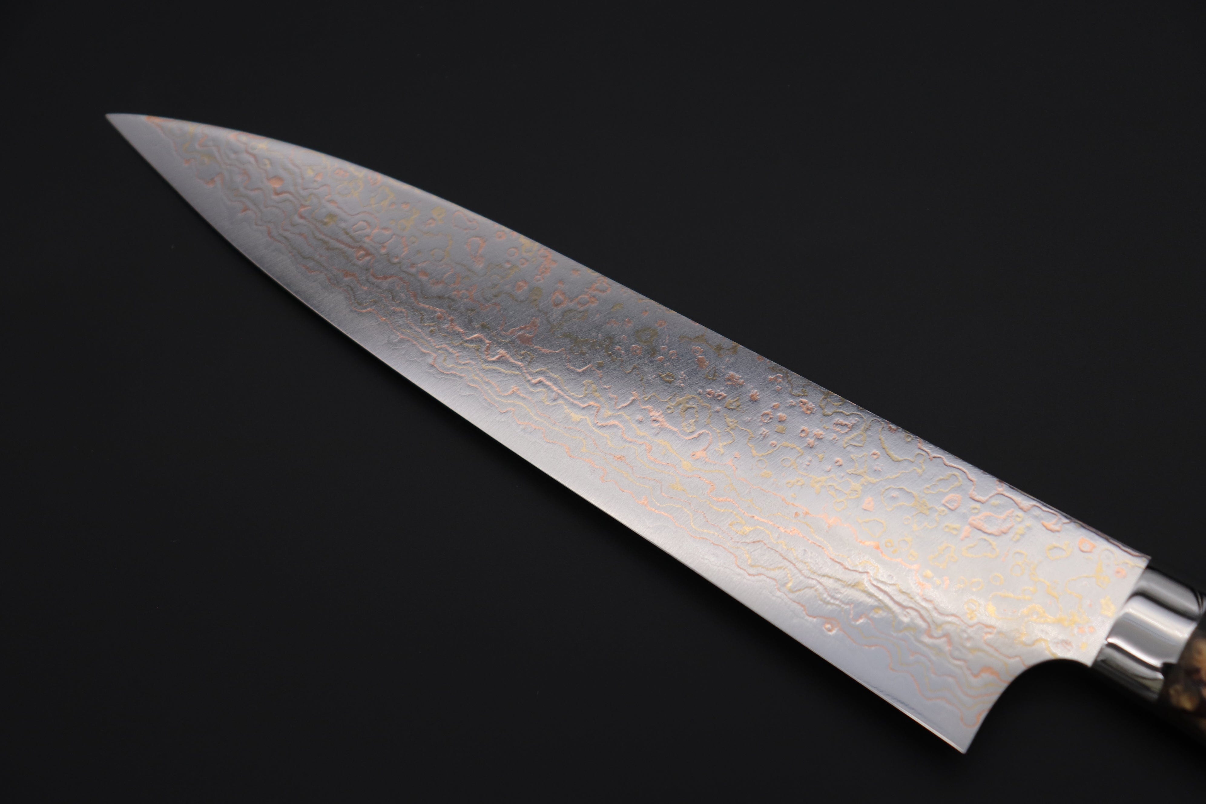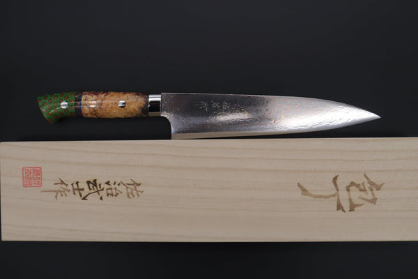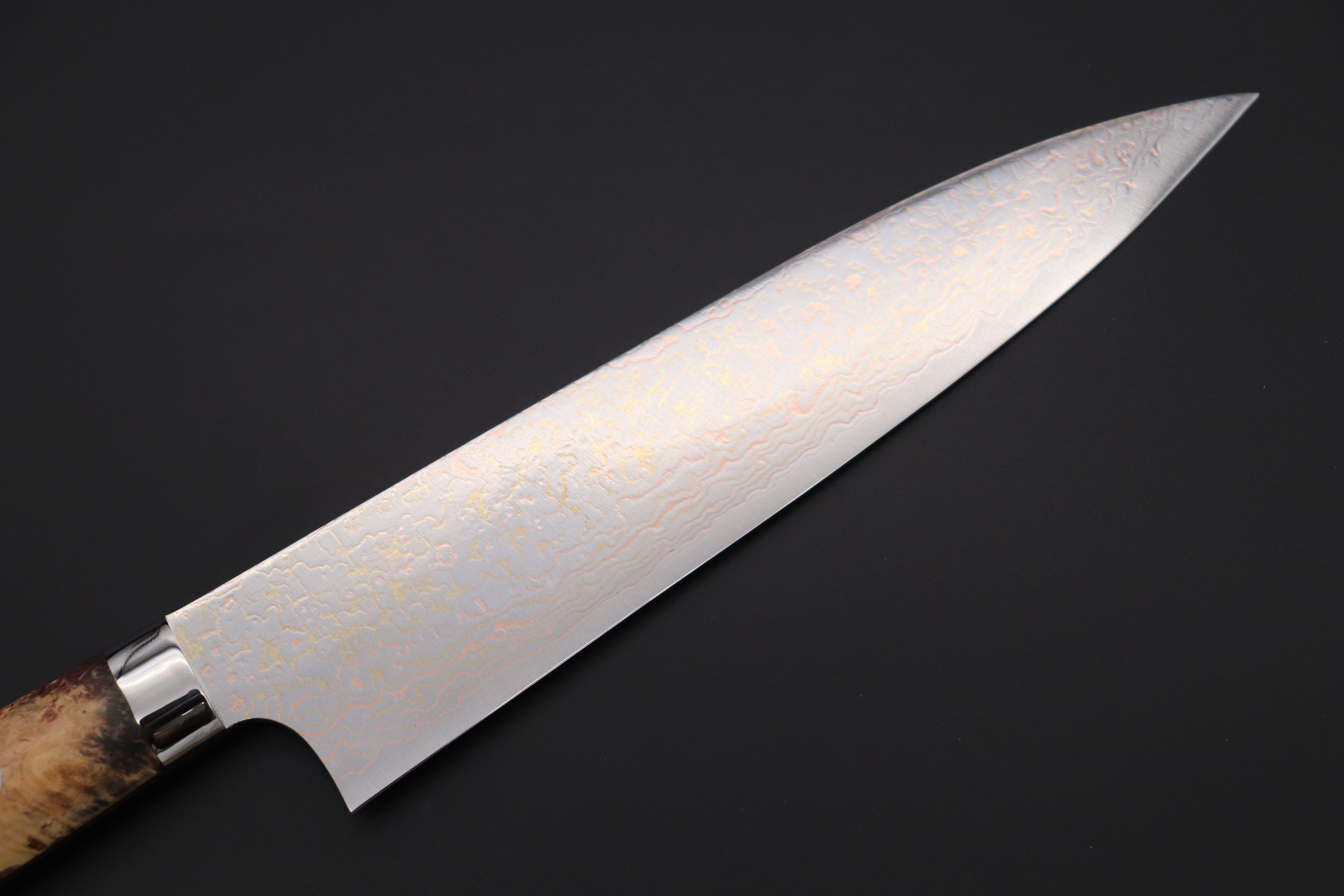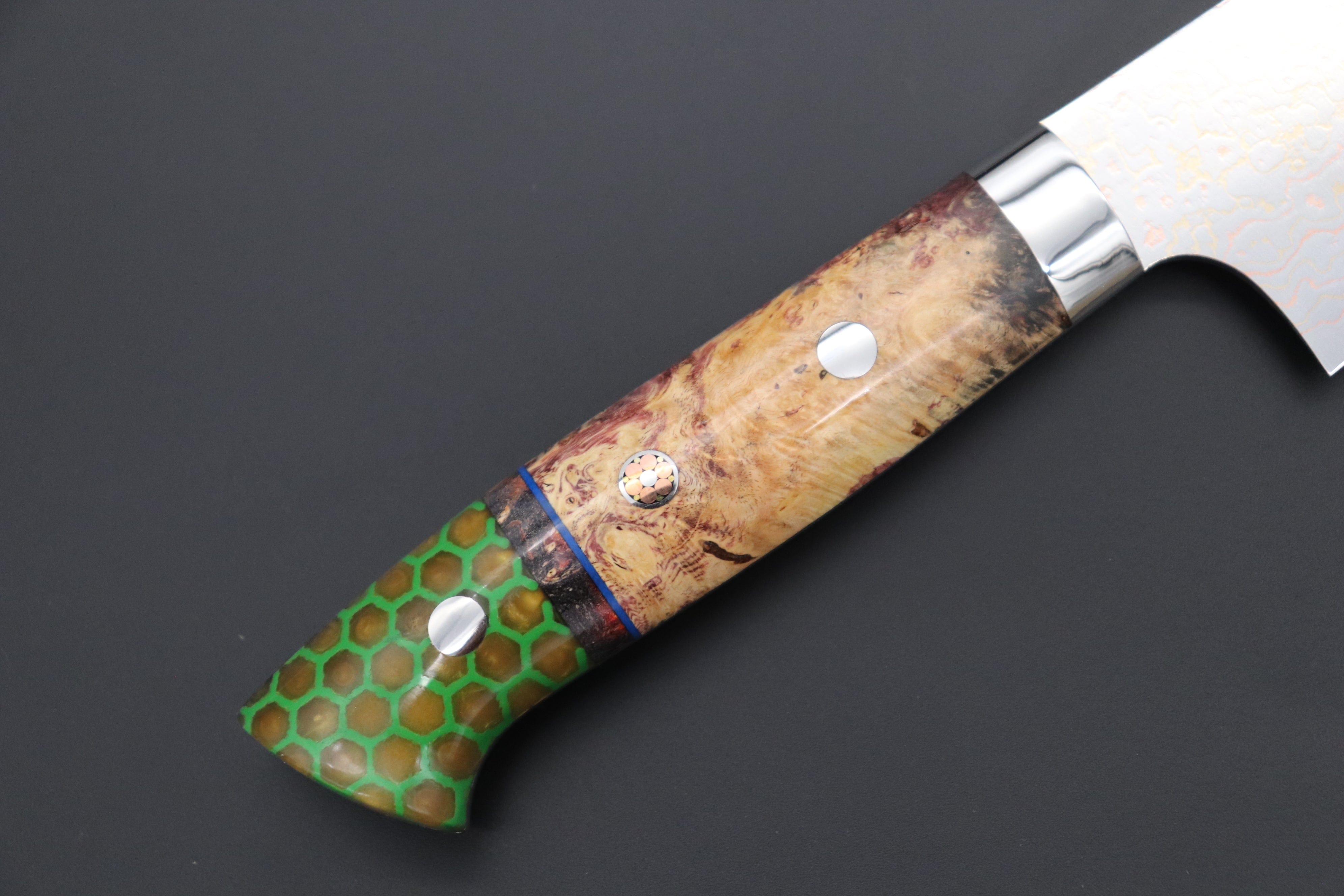 Knife Model: Takeshi Saji SUMMIT ― Limited Edition Custom Series SMT-1004 VG-10W磨 Multi-Colored Golden-Rainbow Damascus Gyuto 210m