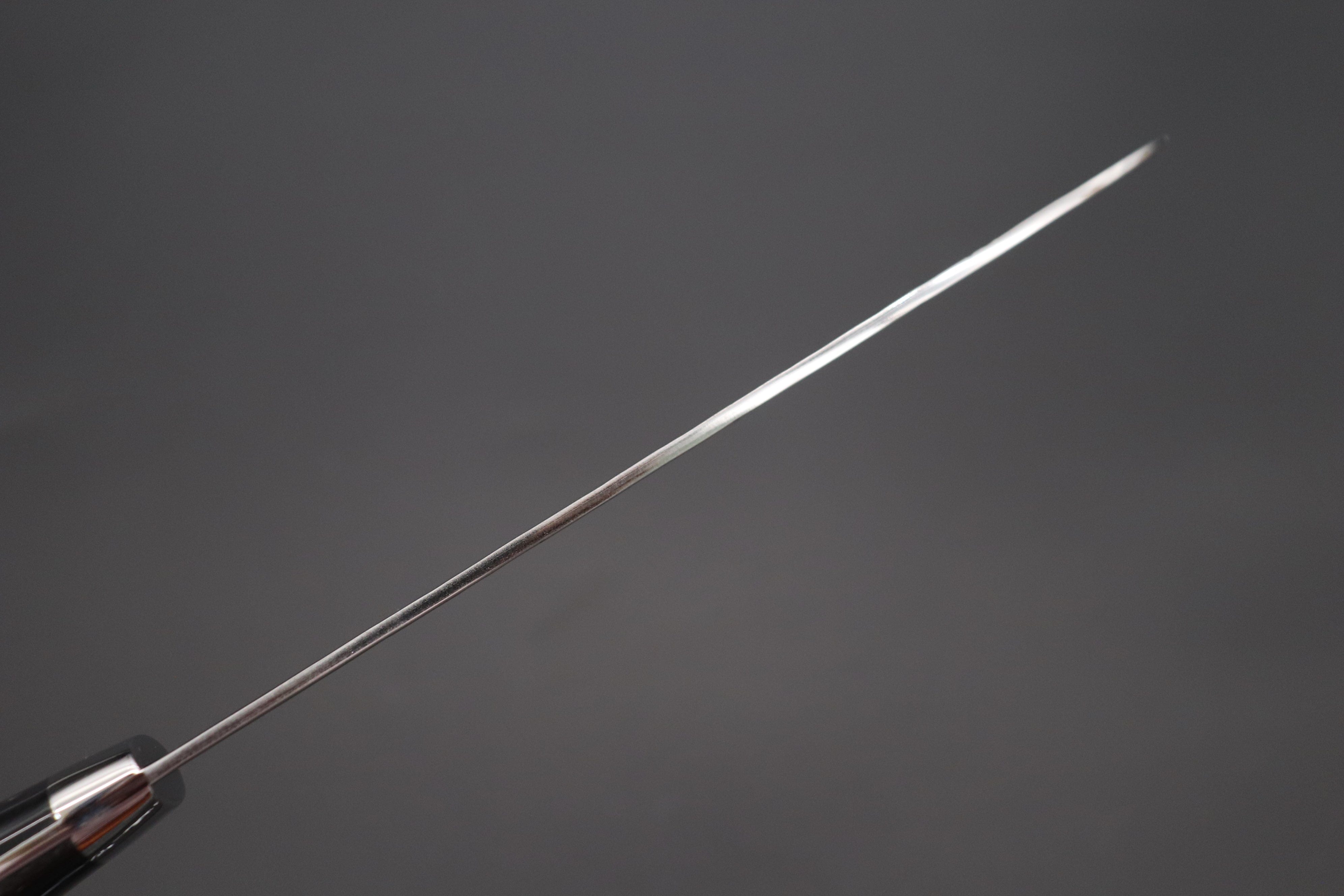 The tall blade and rounded nose / tip of the Santoku make it a versatile knife that is well suited to cutting meat, fish, or vegetables; Hence it’s name, which literally means “Three-purpose”. The Santoku is often recommended as a multi-purpose kitchen knife.