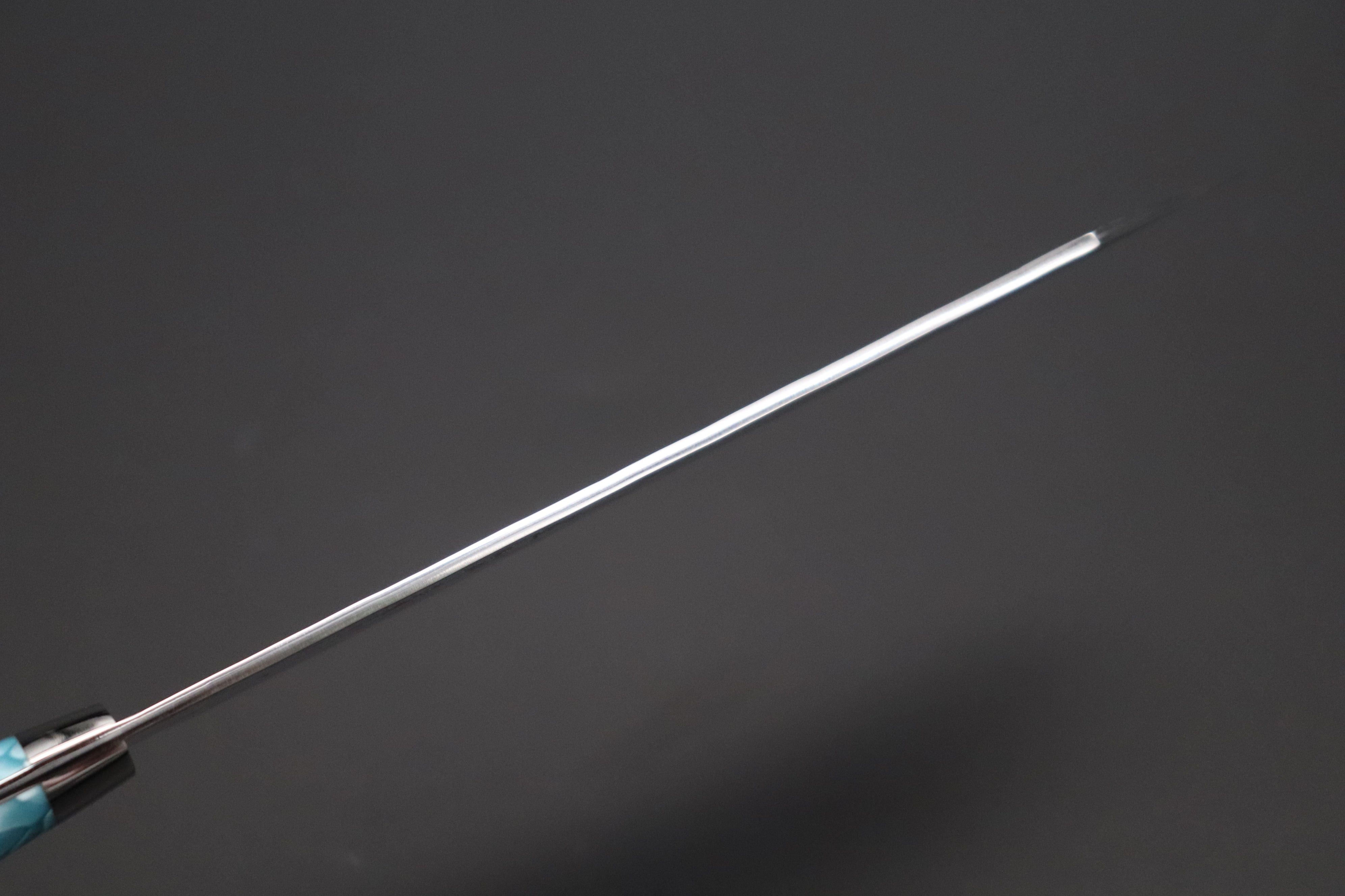 One day at the US Knife Show, we accidentaly met with this rare and stylish, "JUMA Turquoise Blue Color Material. JUMA is a high grade, modern raw material for handcrafted works of art. JUMA is a resin based material has great durability and makes very beautiful & attractive appearance (like the Dragon's Scale) We promptly requested Master Saji to use this special material for his very limited edition knife and now another masterpiece of Saji SUMMIT- Limited Edition Custom Series knife is available.