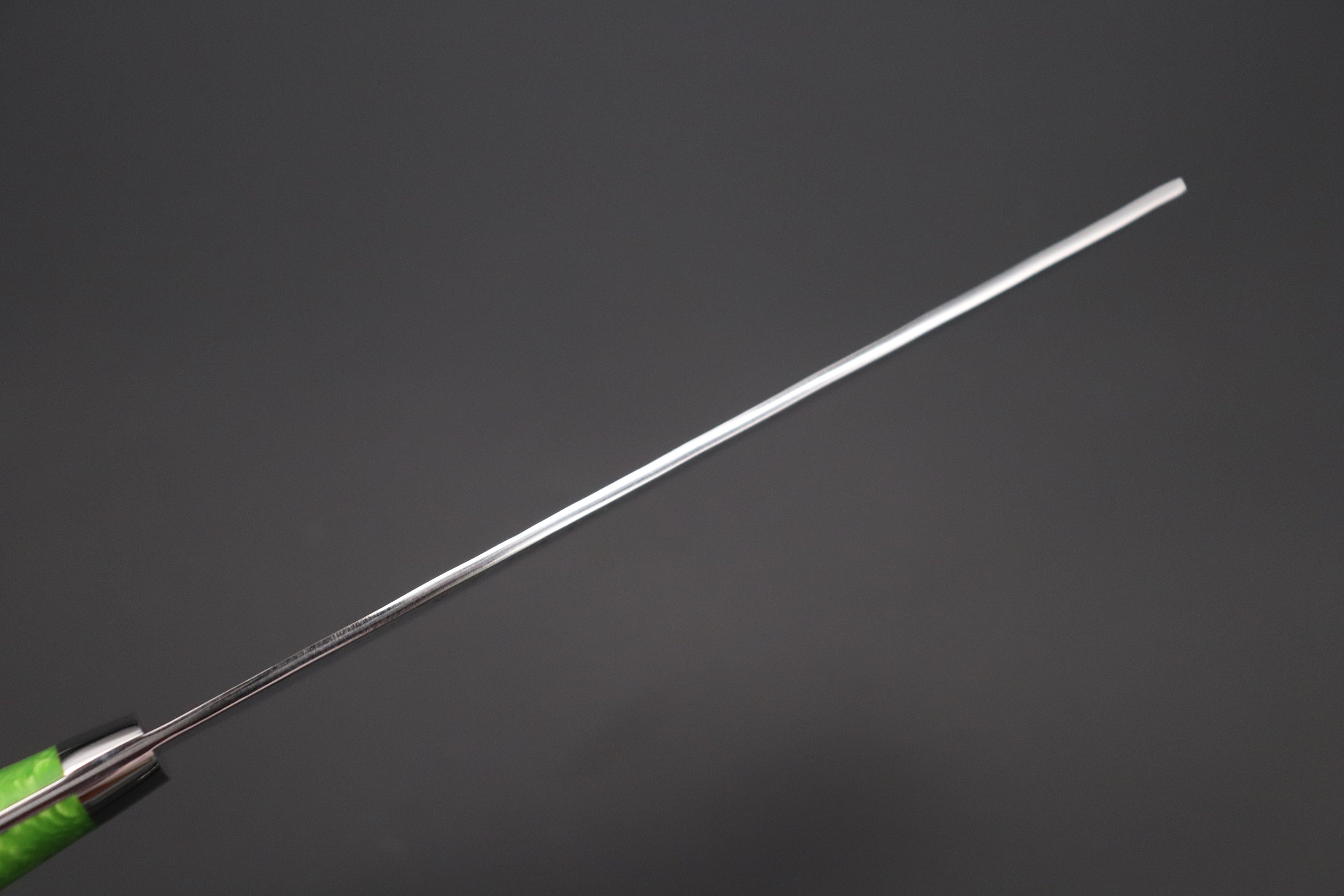 The Unique Custom Handmade JUMA "Emerald Green Color" Custom Handle has a beautiful appearance and to ensure that it can be gripped comfortably, it has been carefully contoured and polished by hand. A stainless steel bolster has been fitted to improve the durability and blade balance of the knife.
