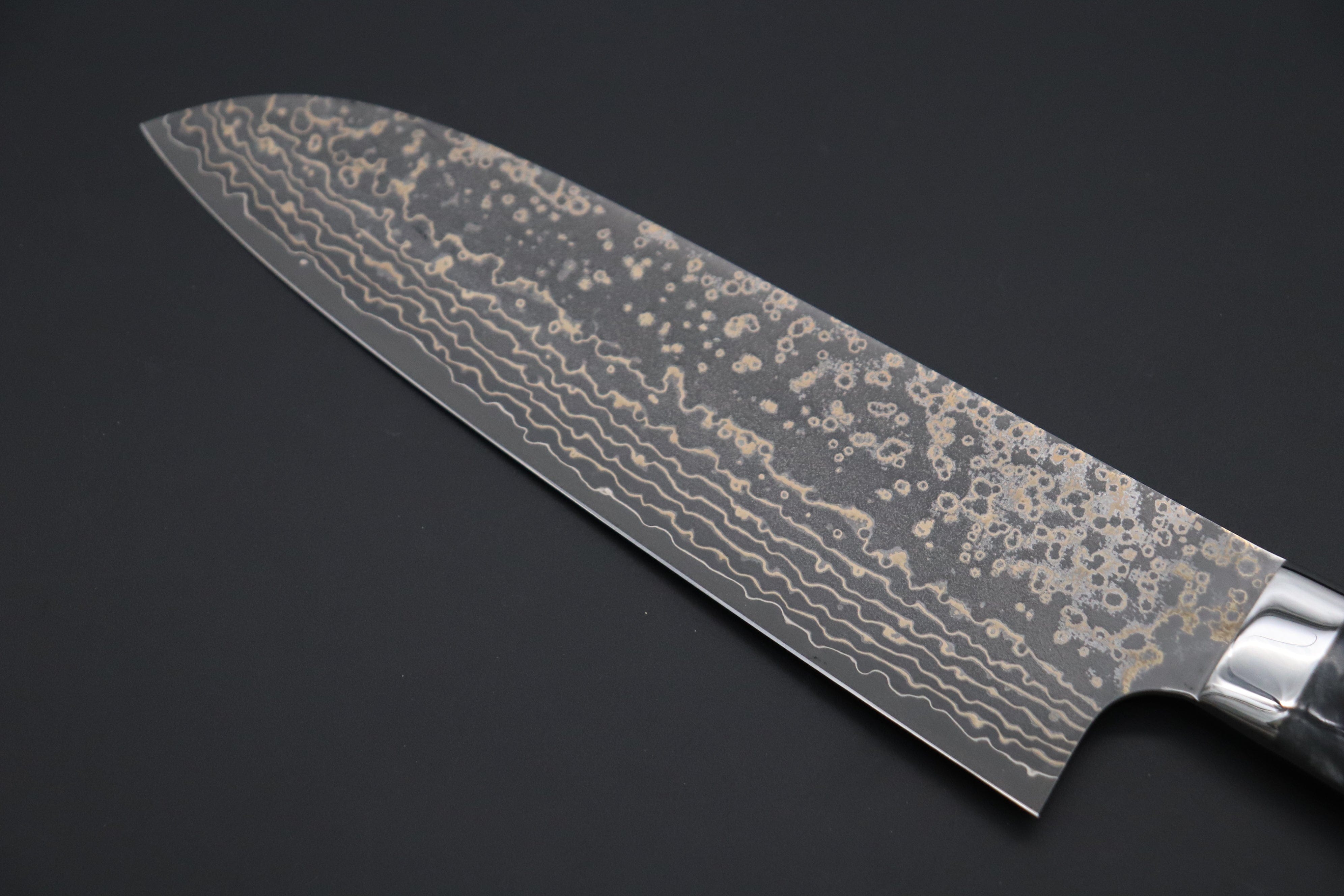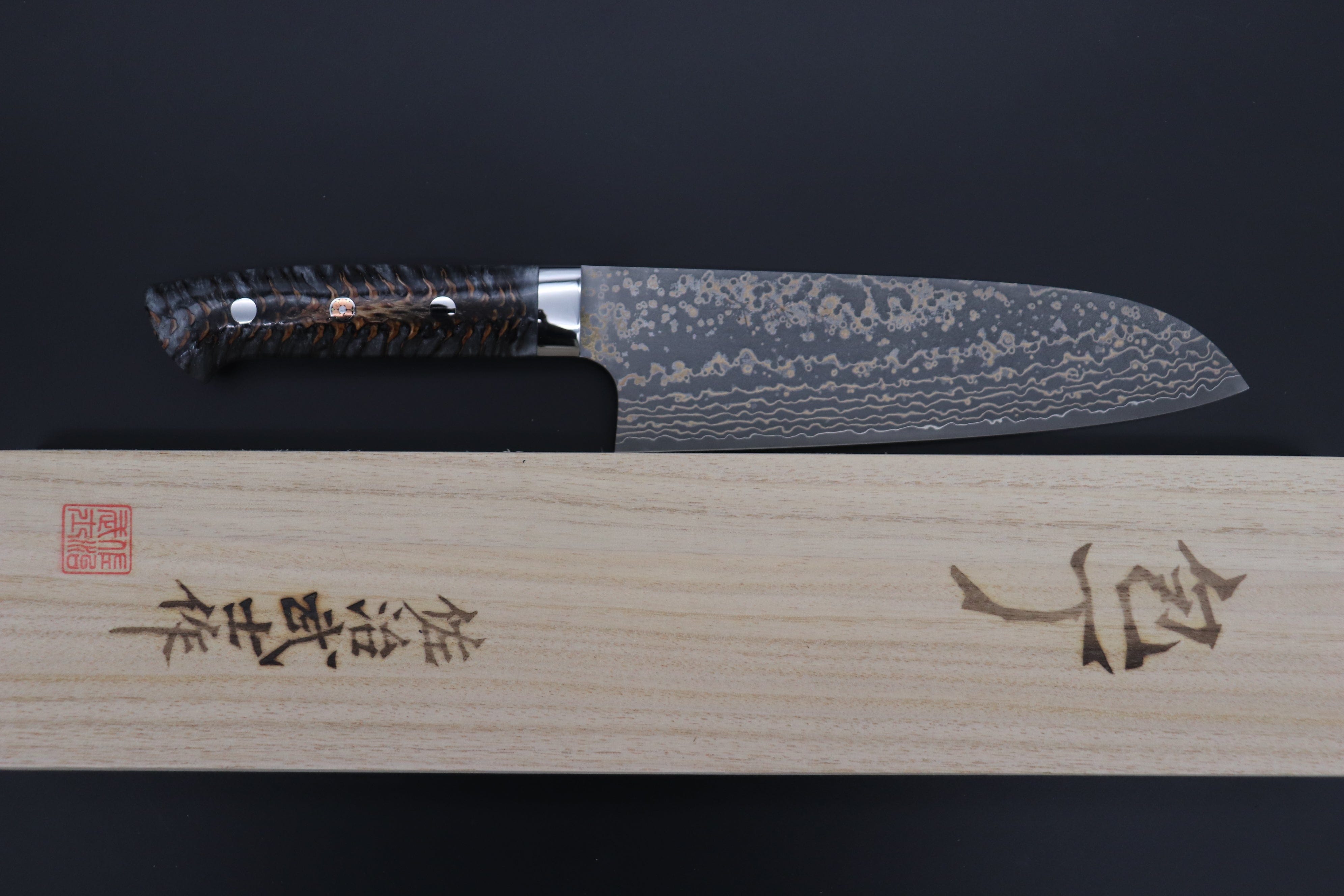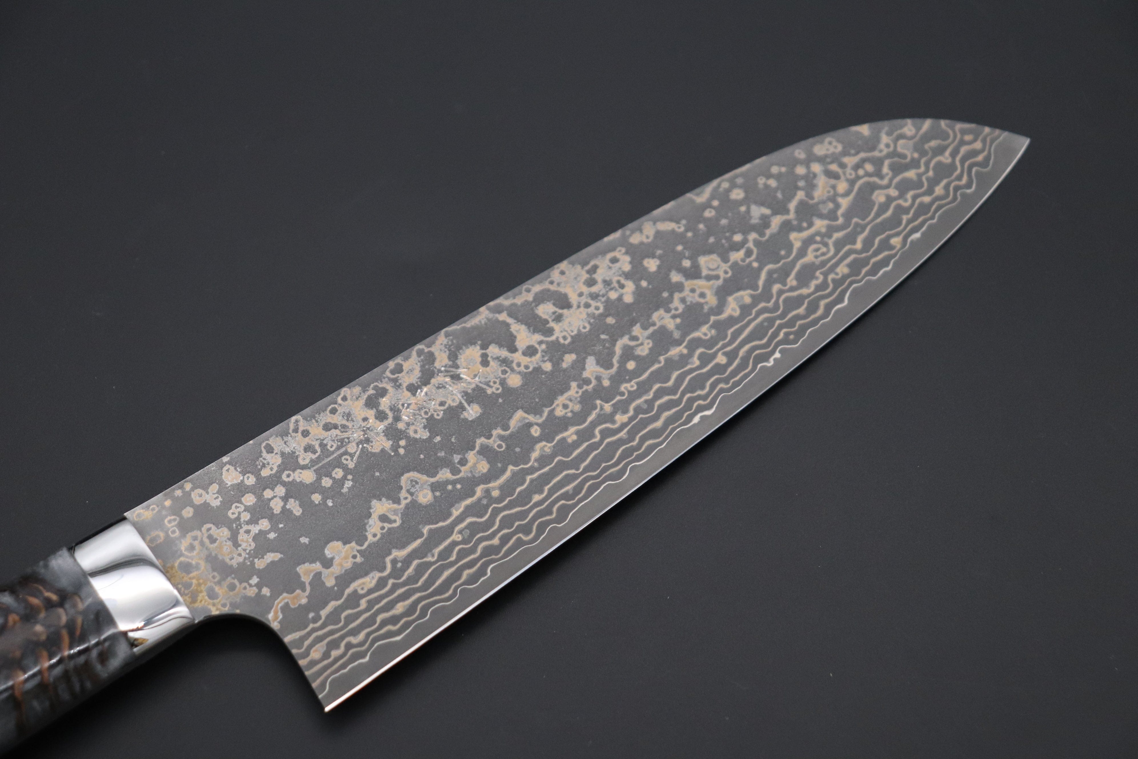 Knife Model: Takeshi Saji SUMMIT ― Limited Edition Custom Series SMT-1037 VG-10W Multi-Colored Golden-Rainbow Damascus Santoku 180mm