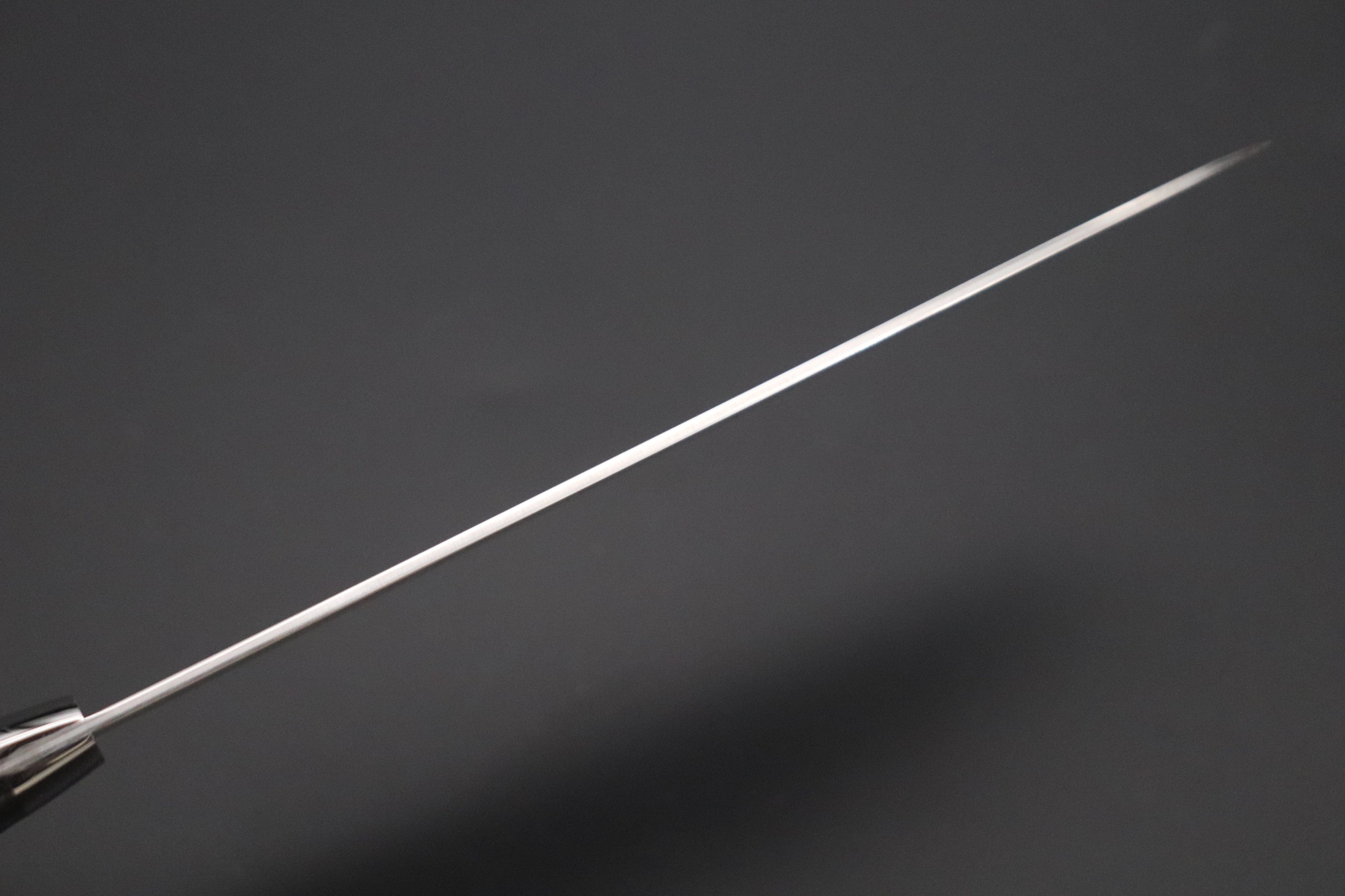 Takeshi Saji is a very well respected Master Smith, who specializes in making traditional hammer forged Japanese knives. We are often surprised by the variety of ideas he has and the very distinctive materials and rare steel that he uses for his custom knives.