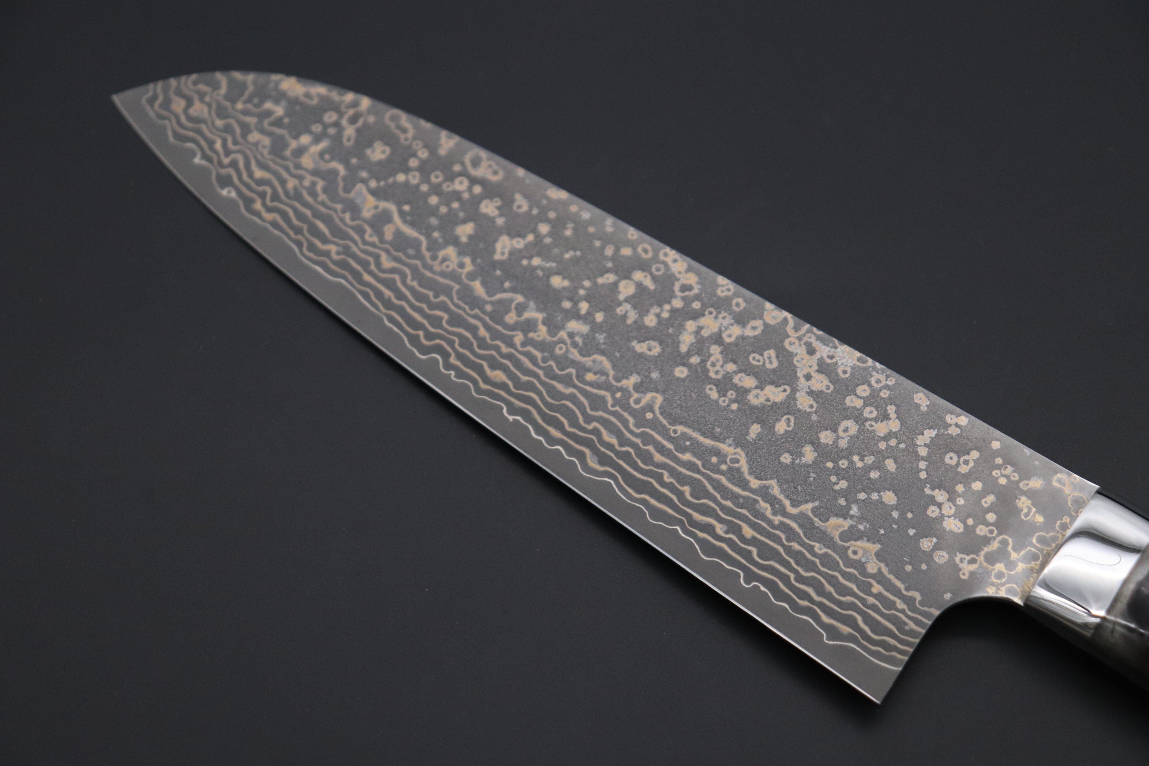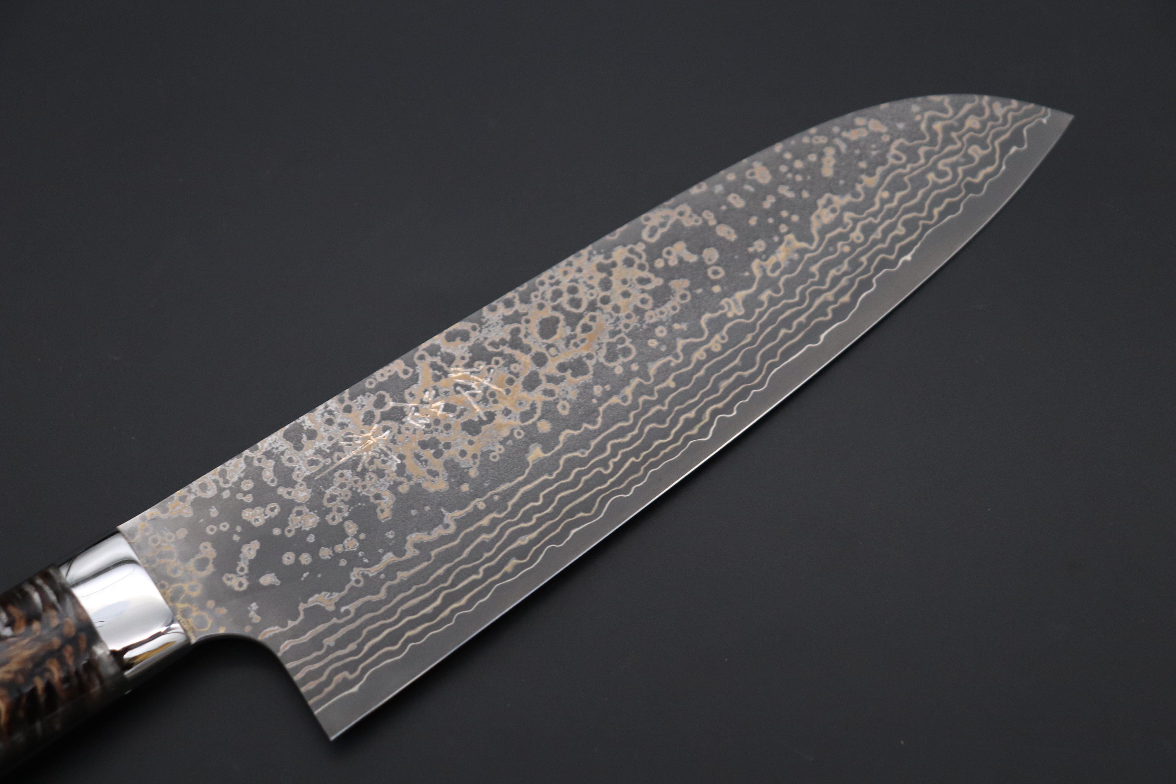 Knife Model: Takeshi Saji SUMMIT ― Limited Edition Custom Series SMT-1038 VG-10W Multi-Colored Golden-Rainbow Damascus Santoku 180mm