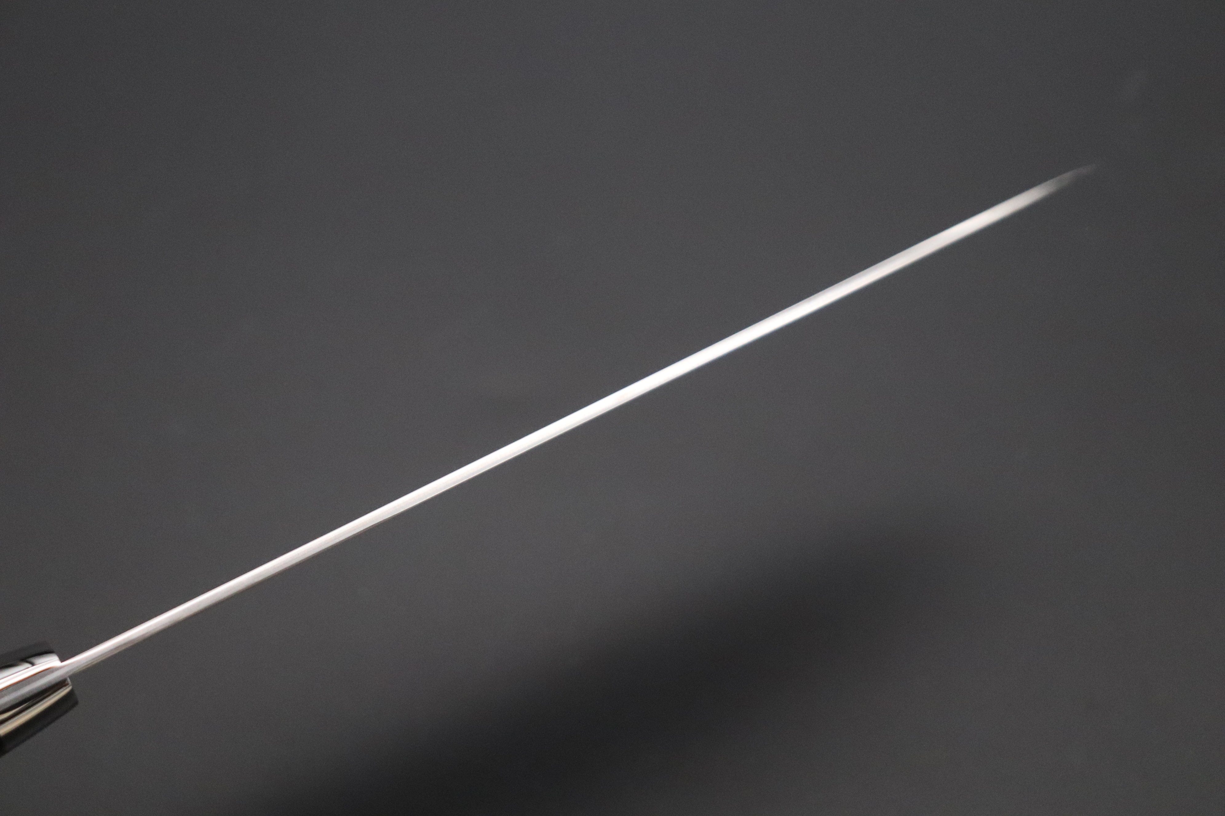 The tall blade and rounded nose / tip of the Santoku make it a versatile knife that is well suited to cutting meat, fish, or vegetables; Hence it’s name, which literally means “Three-purpose”. The Santoku is often recommended as a multi-purpose kitchen knife.