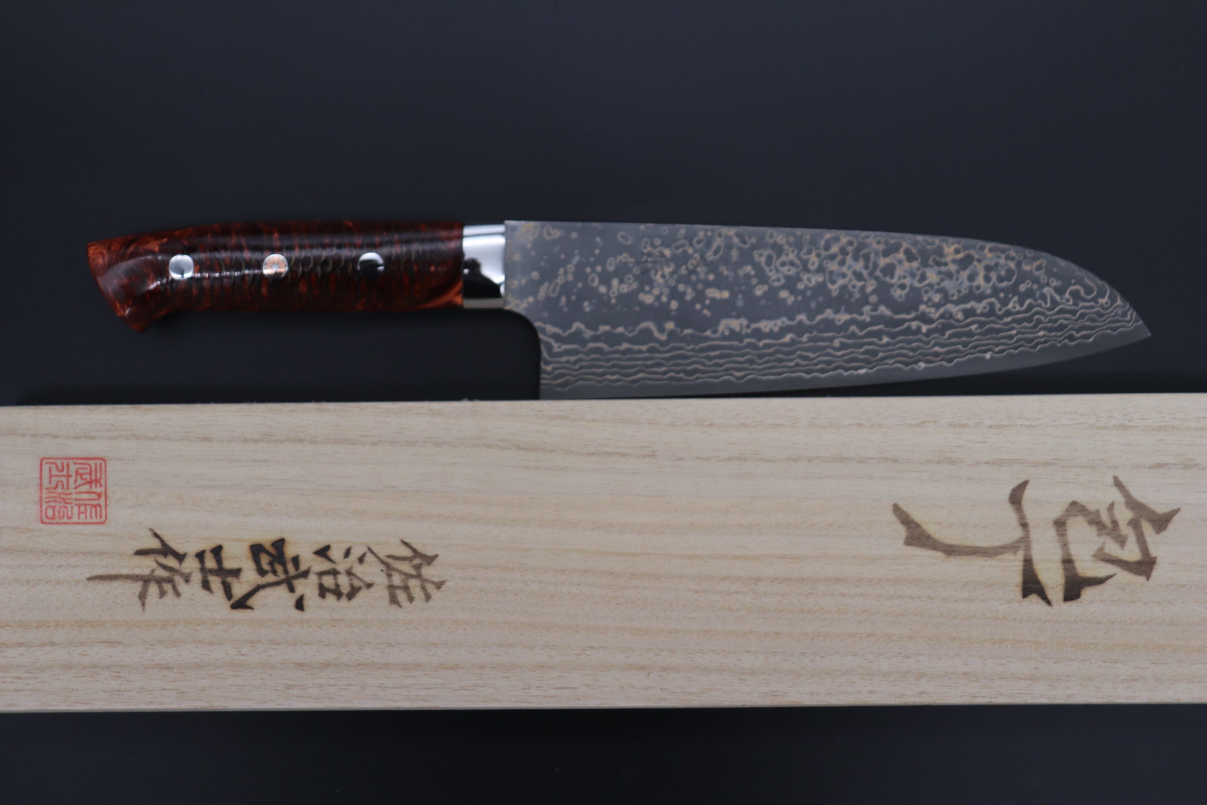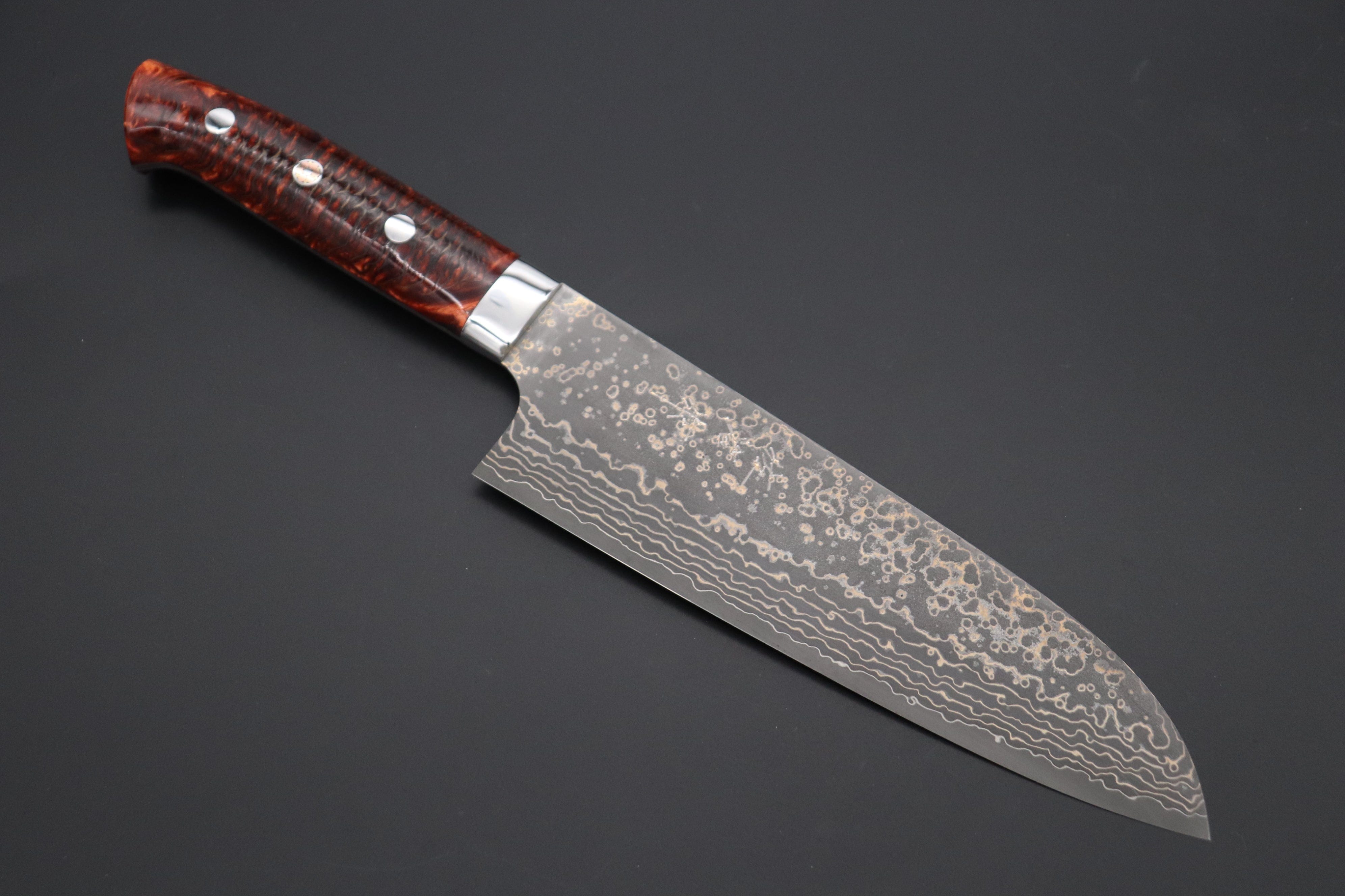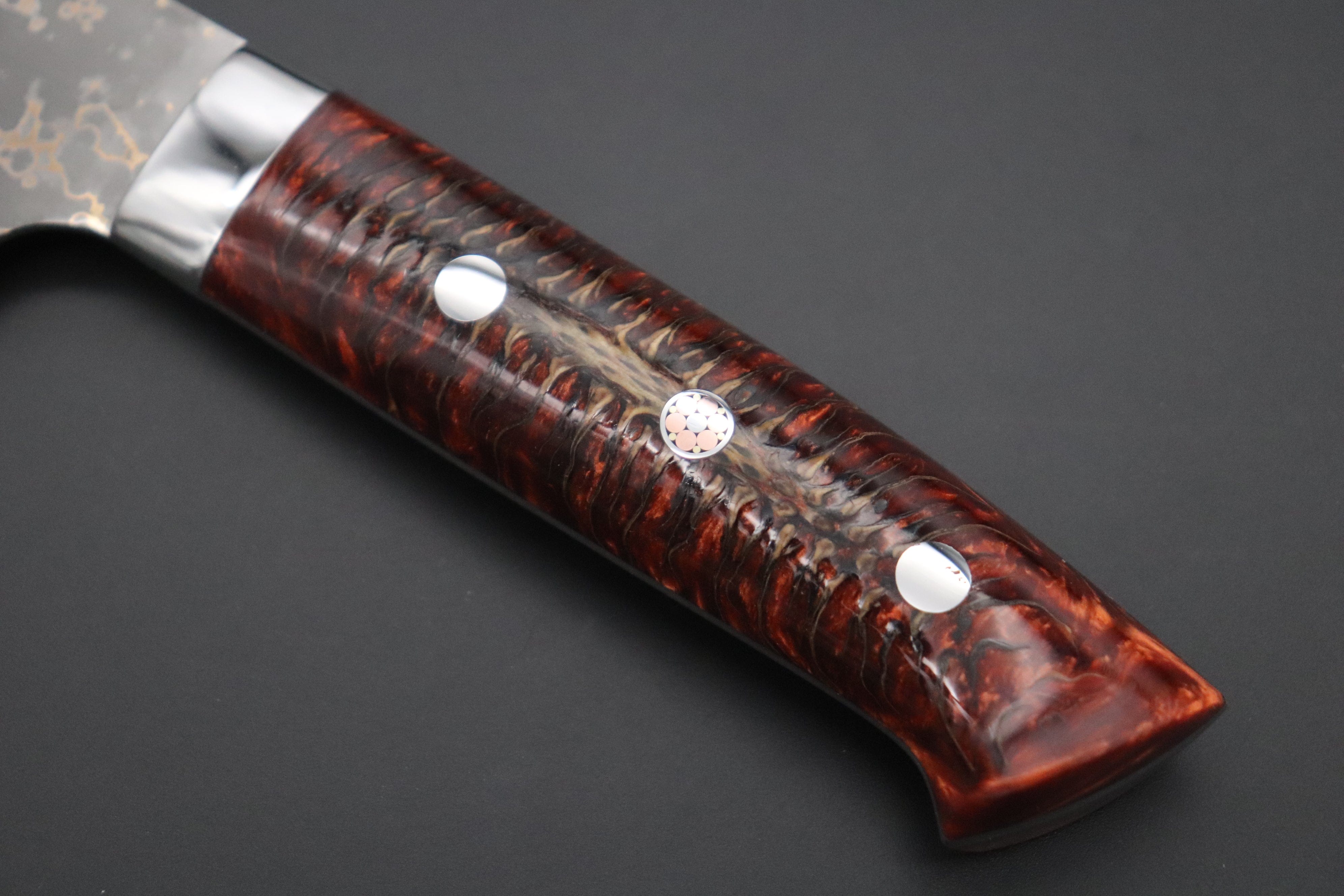 Knife Model: Takeshi Saji SUMMIT ― Limited Edition Custom Series SMT-1040 VG-10W Multi-Colored Golden-Rainbow Damascus Santoku 180mm