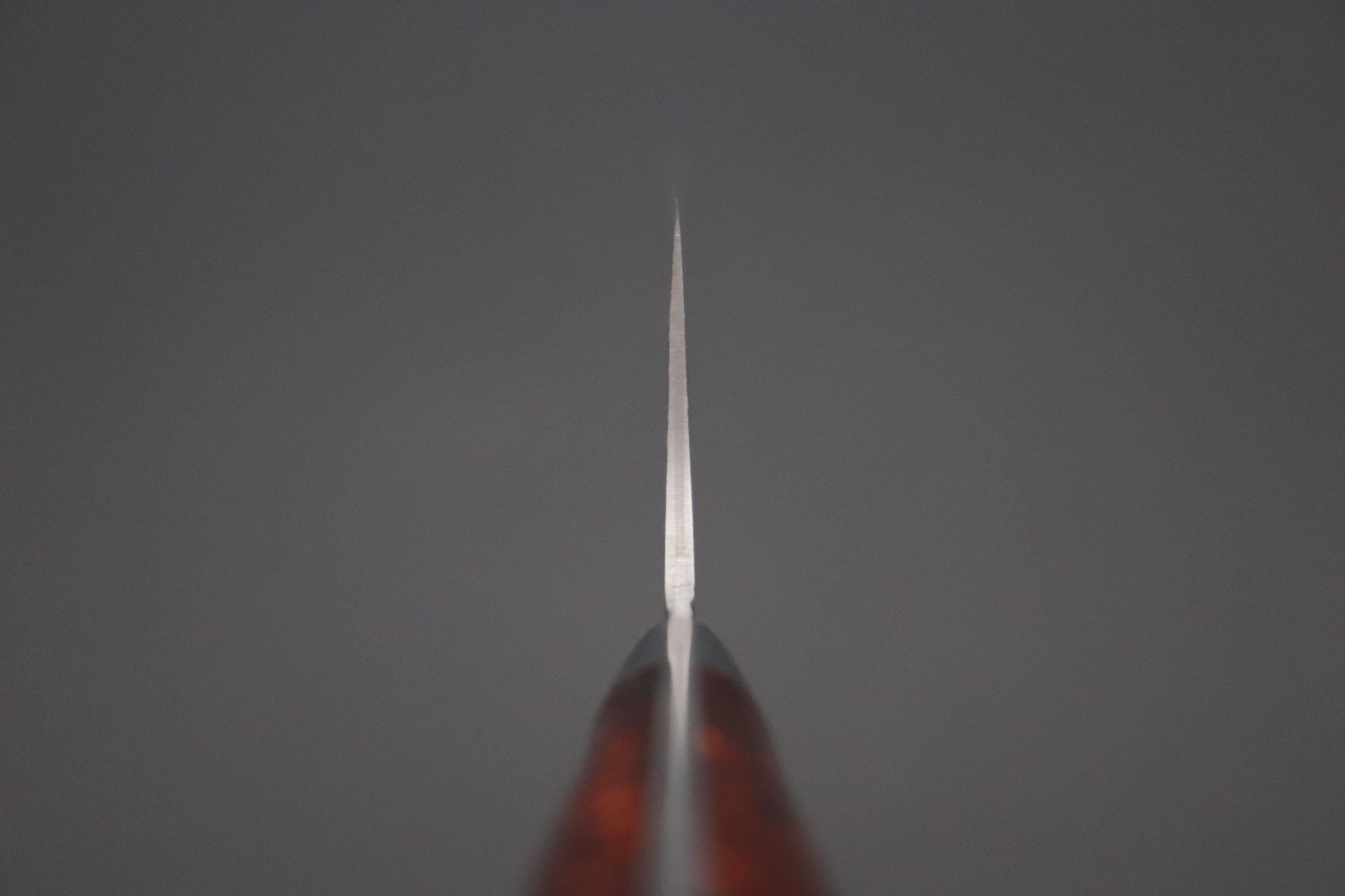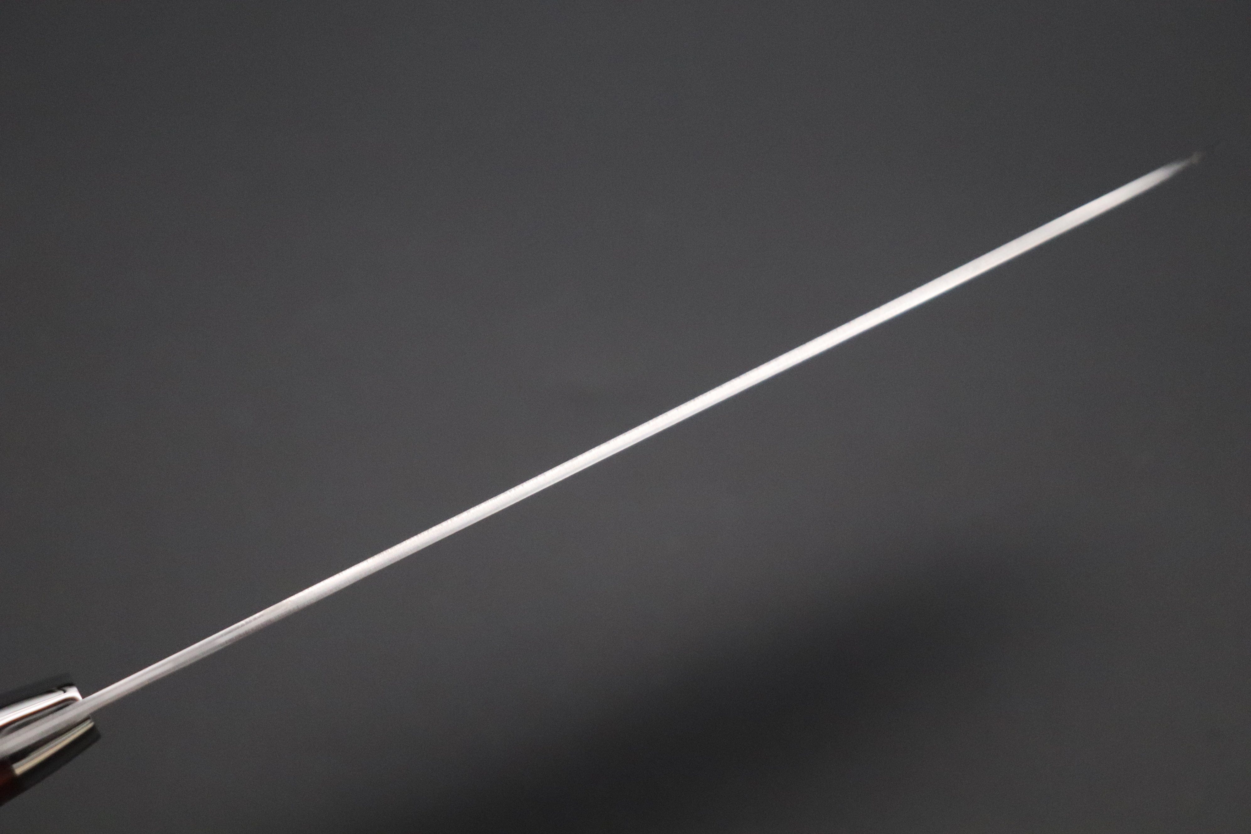 Takeshi Saji is a very well respected Master Smith, who specializes in making traditional hammer forged Japanese knives. We are often surprised by the variety of ideas he has and the very distinctive materials and rare steel that he uses for his custom knives.