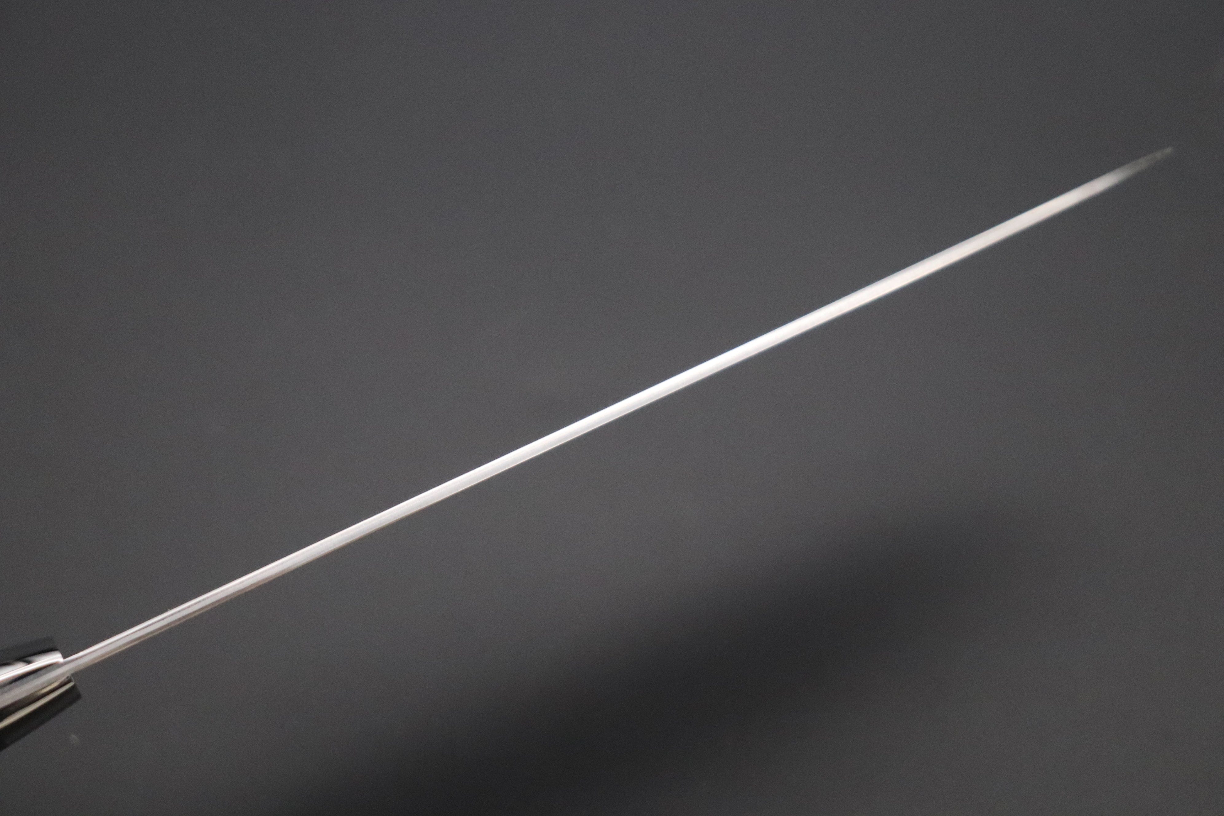 Takeshi Saji is a very well respected Master Smith, who specializes in making traditional hammer forged Japanese knives. We are often surprised by the variety of ideas he has and the very distinctive materials and rare steel that he uses for his custom knives.
