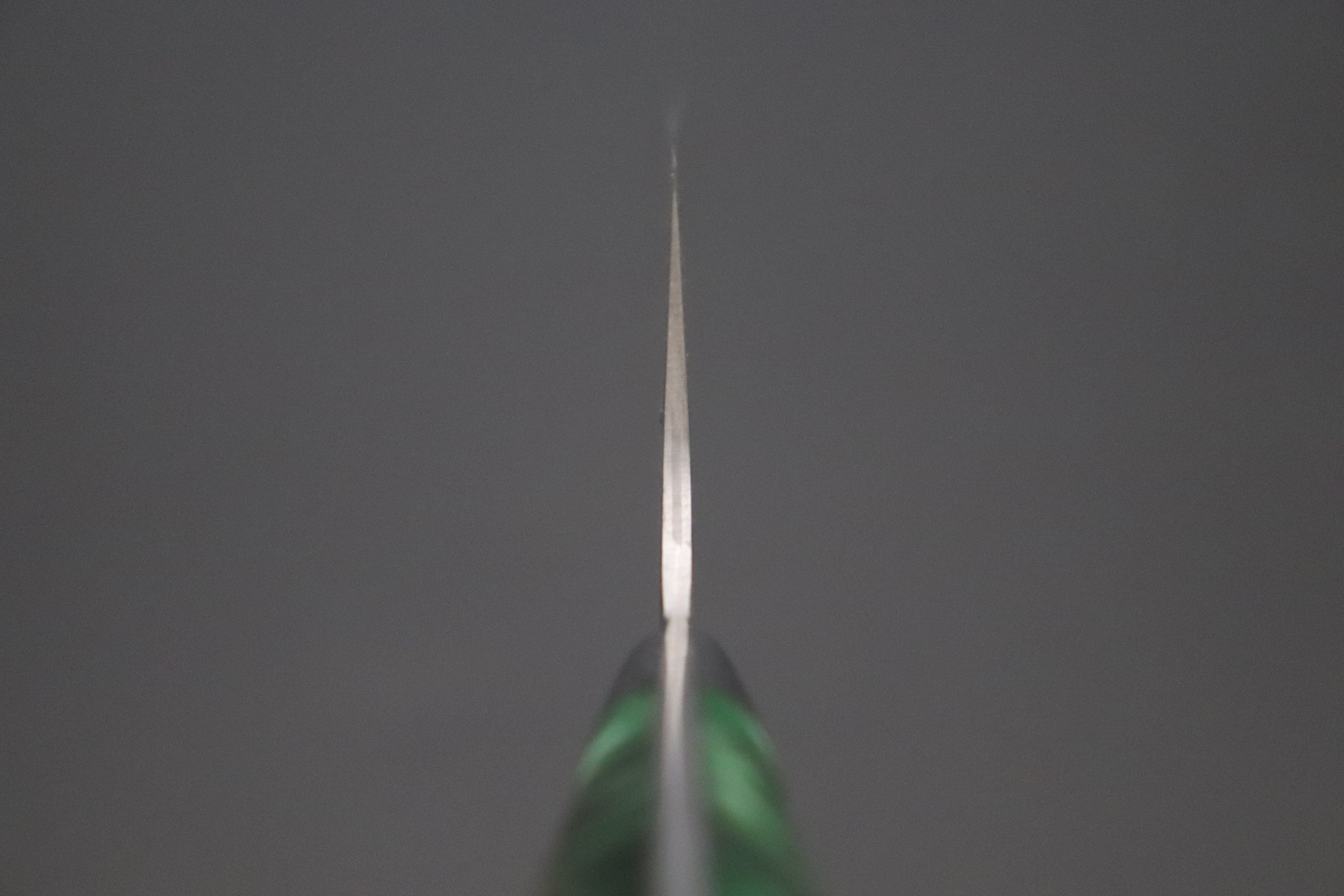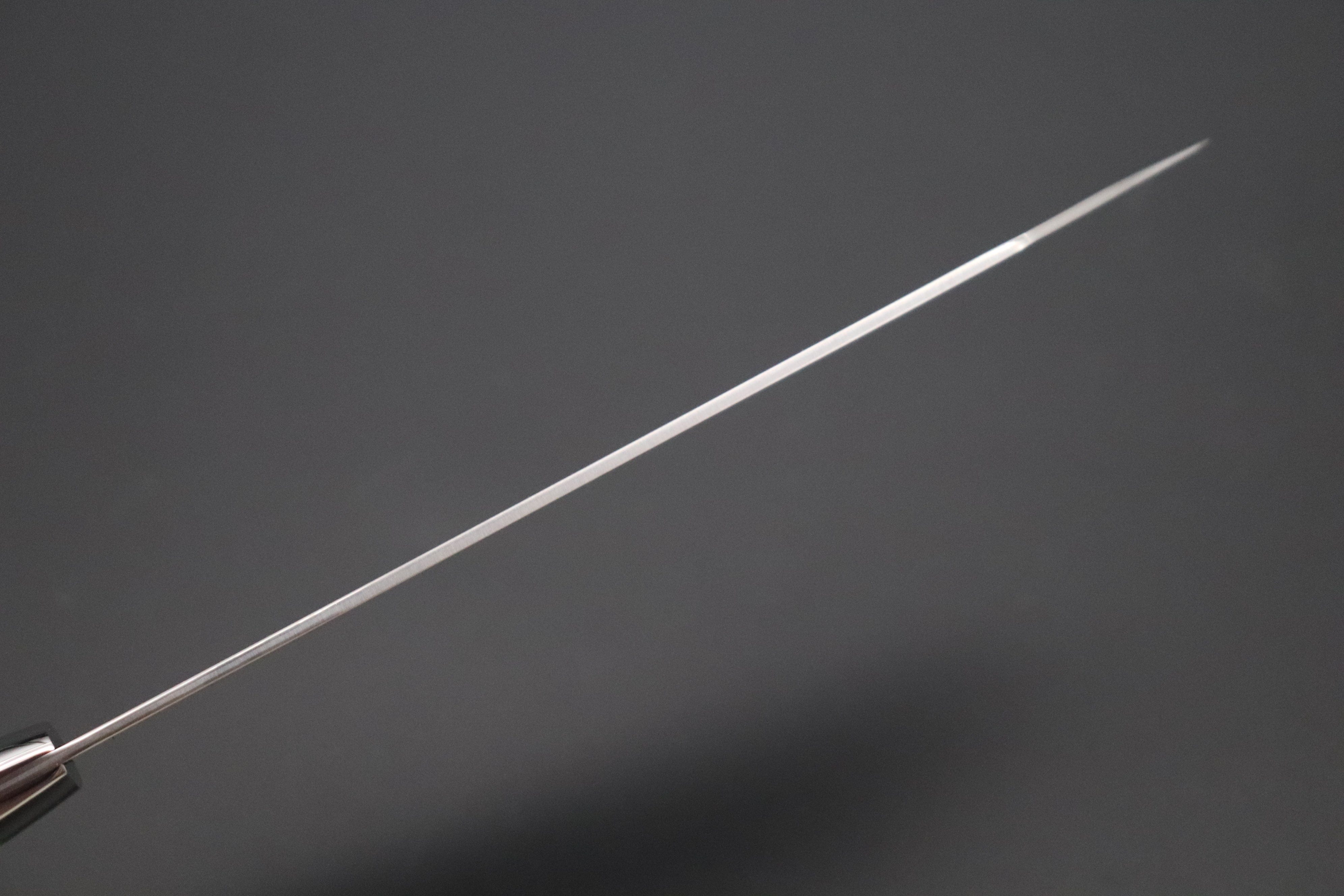 Takeshi Saji is a very well respected Master Smith, who specializes in making traditional hammer forged Japanese knives. We are often surprised by the variety of ideas he has and the very distinctive materials and rare steel that he uses for his custom knives.