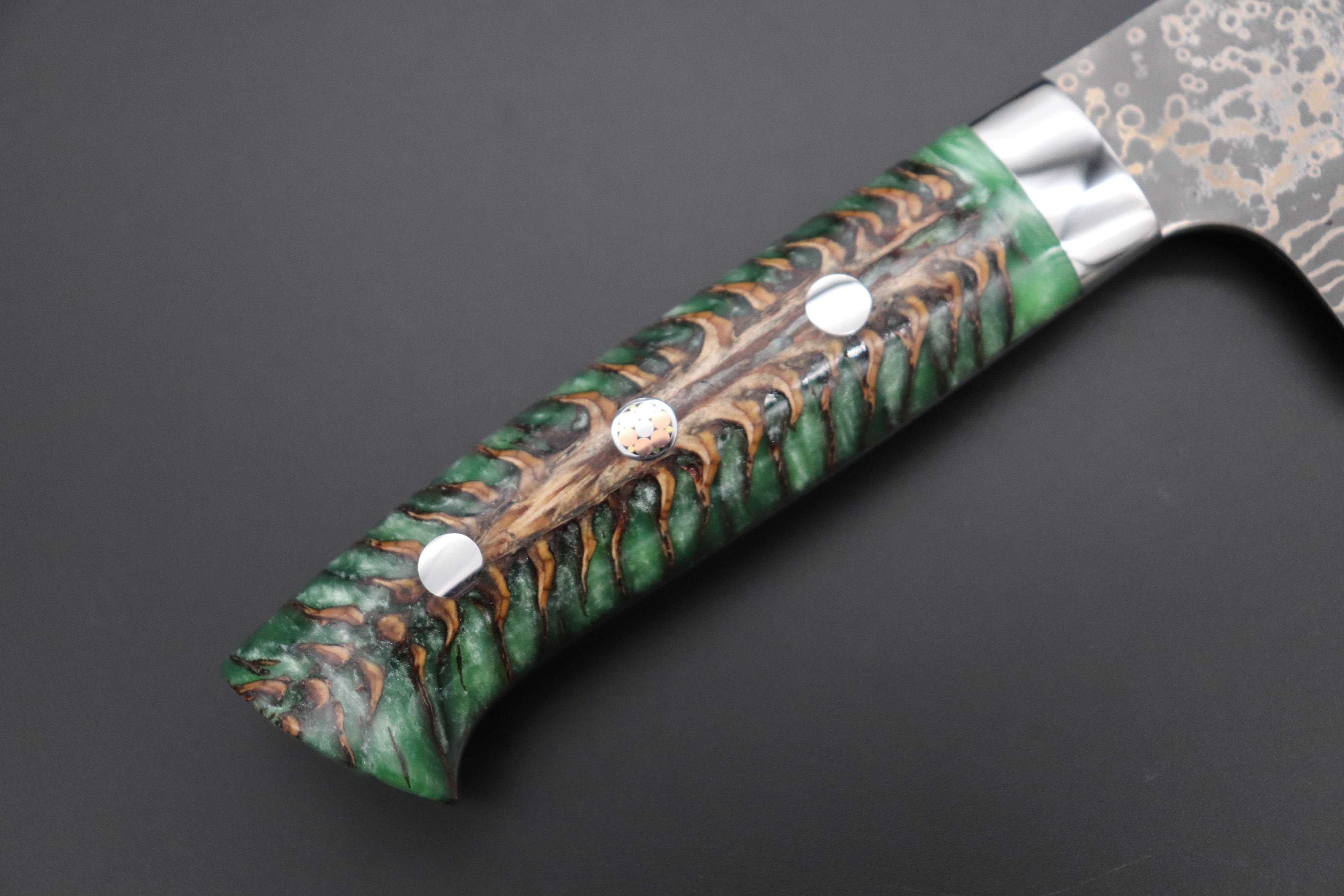 Takeshi Saji's Custom Handmade "Stabilized Spruce Cones Hybrid Wood Handle" perfectly complements the Beautiful and Wild Custom Damascus Blade. This handle blends the allure of spruce cones with durability and ergonomic design.