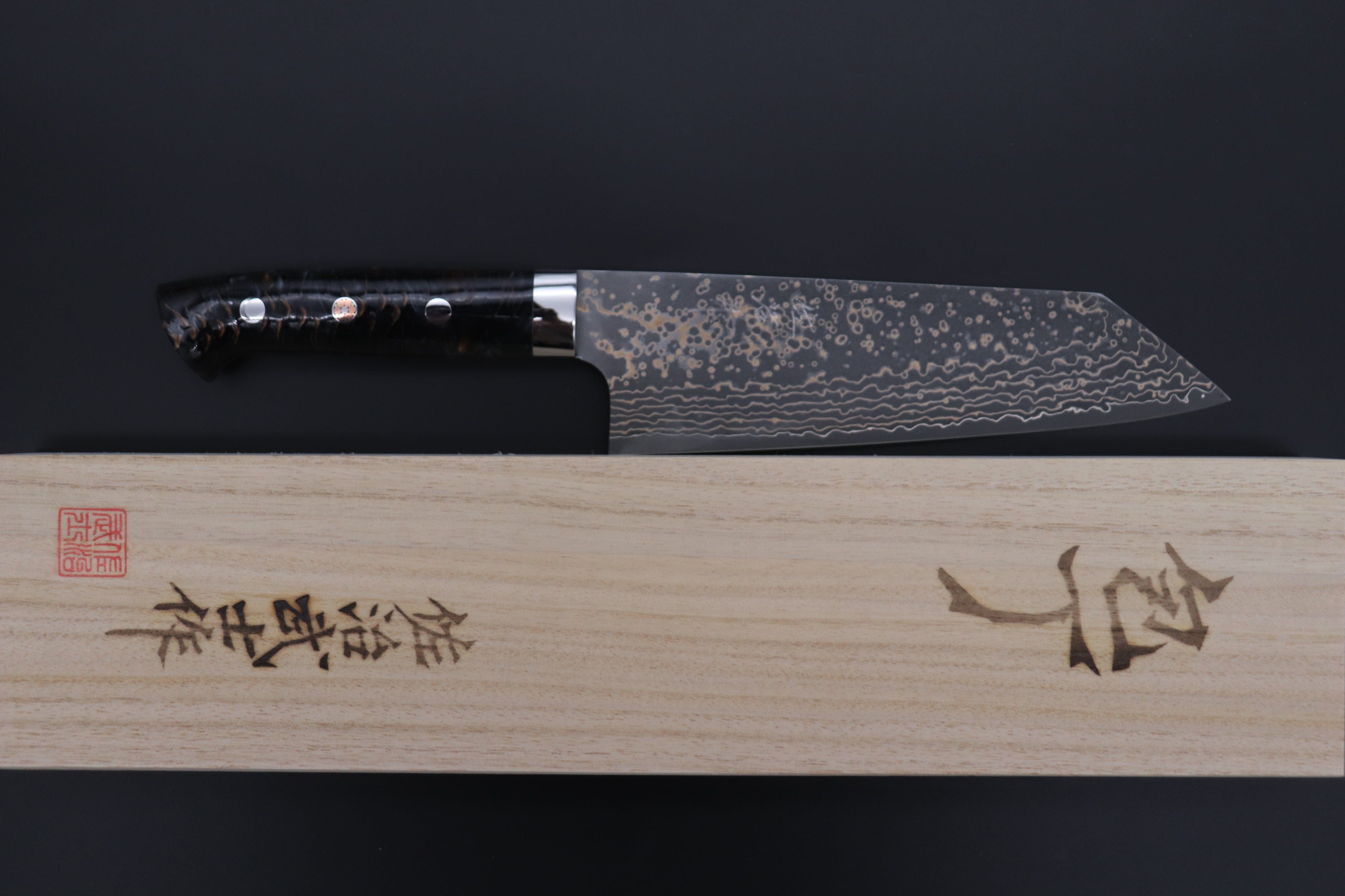 Each knife comes with a traditional Wooden Presentation Box that is inscribed with Takeshi Saji’s name.