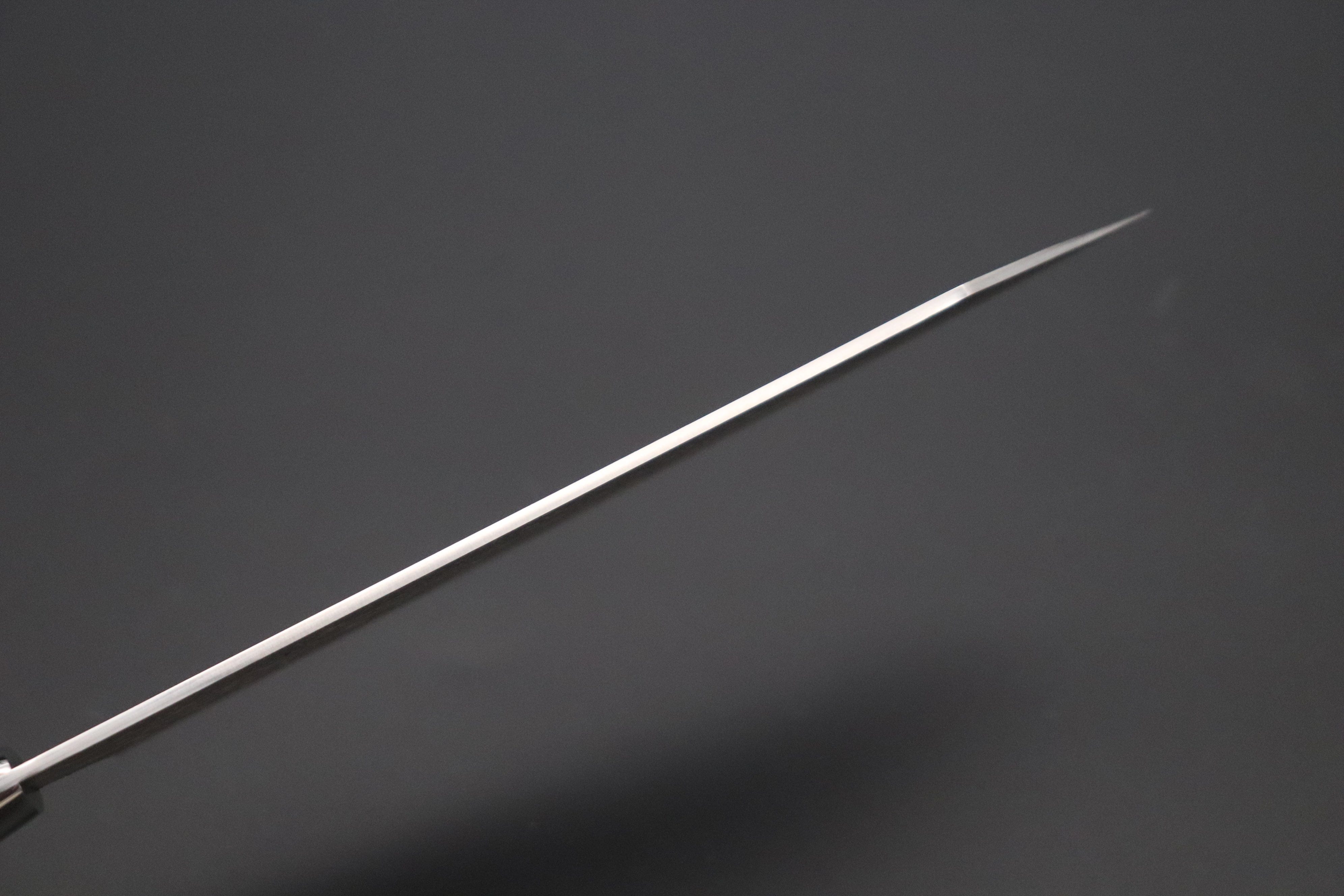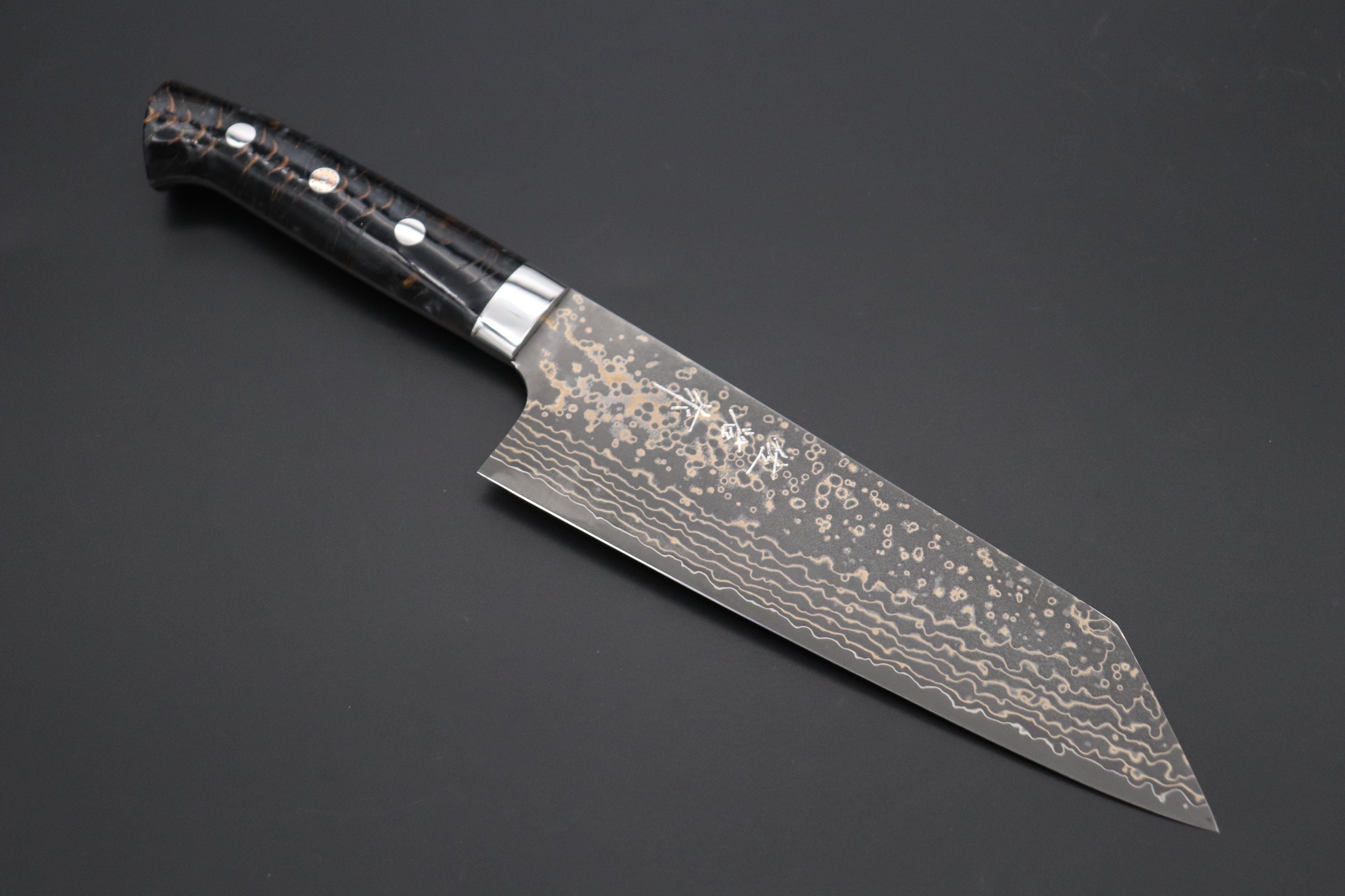 Takeshi Saji is a very well respected Master Smith, who specializes in making traditional hammer forged Japanese knives. We are often surprised by the variety of ideas he has and the very distinctive materials and rare steel that he uses for his custom knives.