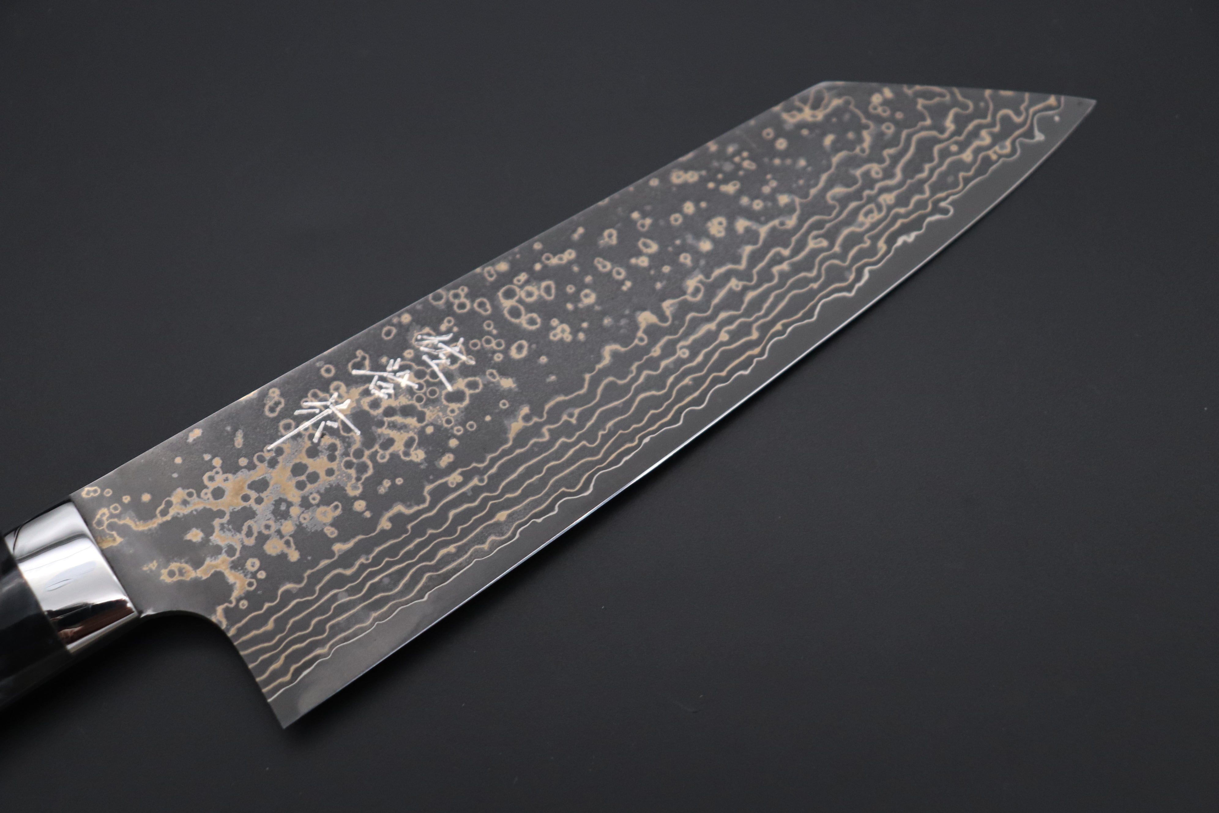 Master Saji has just completed a fresh new batch of traditional hammer forged custom kitchen knives that, once again, feature his unique multi-colored Damascus. The blades have a core of VG-10W Cobalt-Tungsten Stainless steel (HR.c 61 to 62), which has been clad with multiple layers of rust-resistant stainless steel, brass and copper.