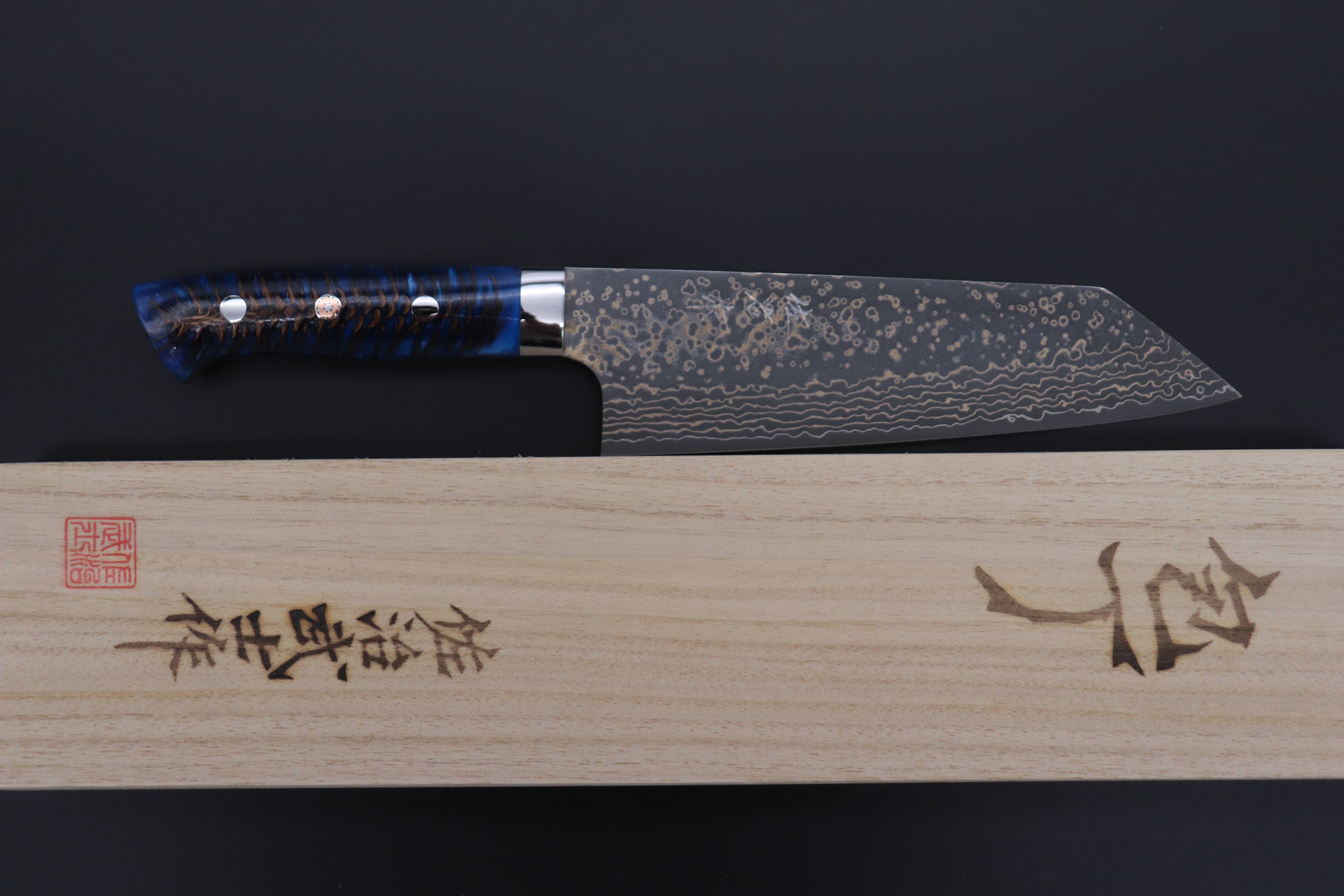 Master Saji has just completed a fresh new batch of traditional hammer forged custom kitchen knives that, once again, feature his unique multi-colored Damascus. The blades have a core of VG-10W Cobalt-Tungsten Stainless steel (HR.c 61 to 62), which has been clad with multiple layers of rust-resistant stainless steel, brass and copper.