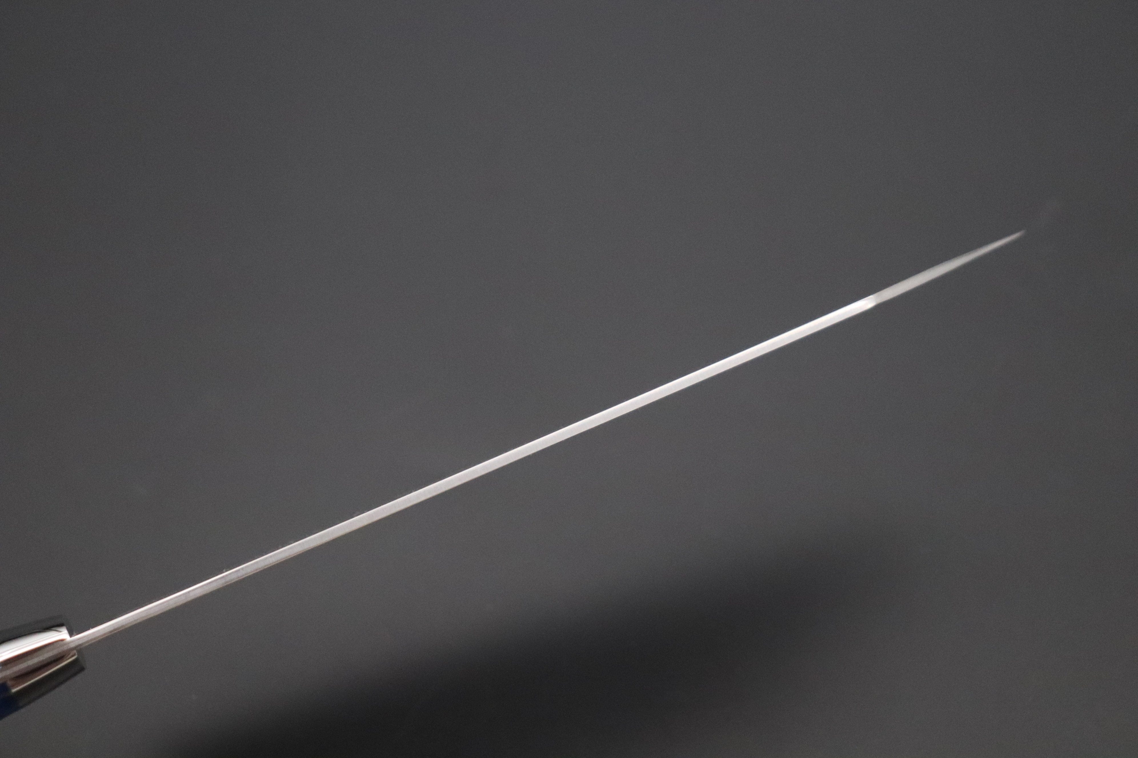 Takeshi Saji is a very well respected Master Smith, who specializes in making traditional hammer forged Japanese knives. We are often surprised by the variety of ideas he has and the very distinctive materials and rare steel that he uses for his custom knives.