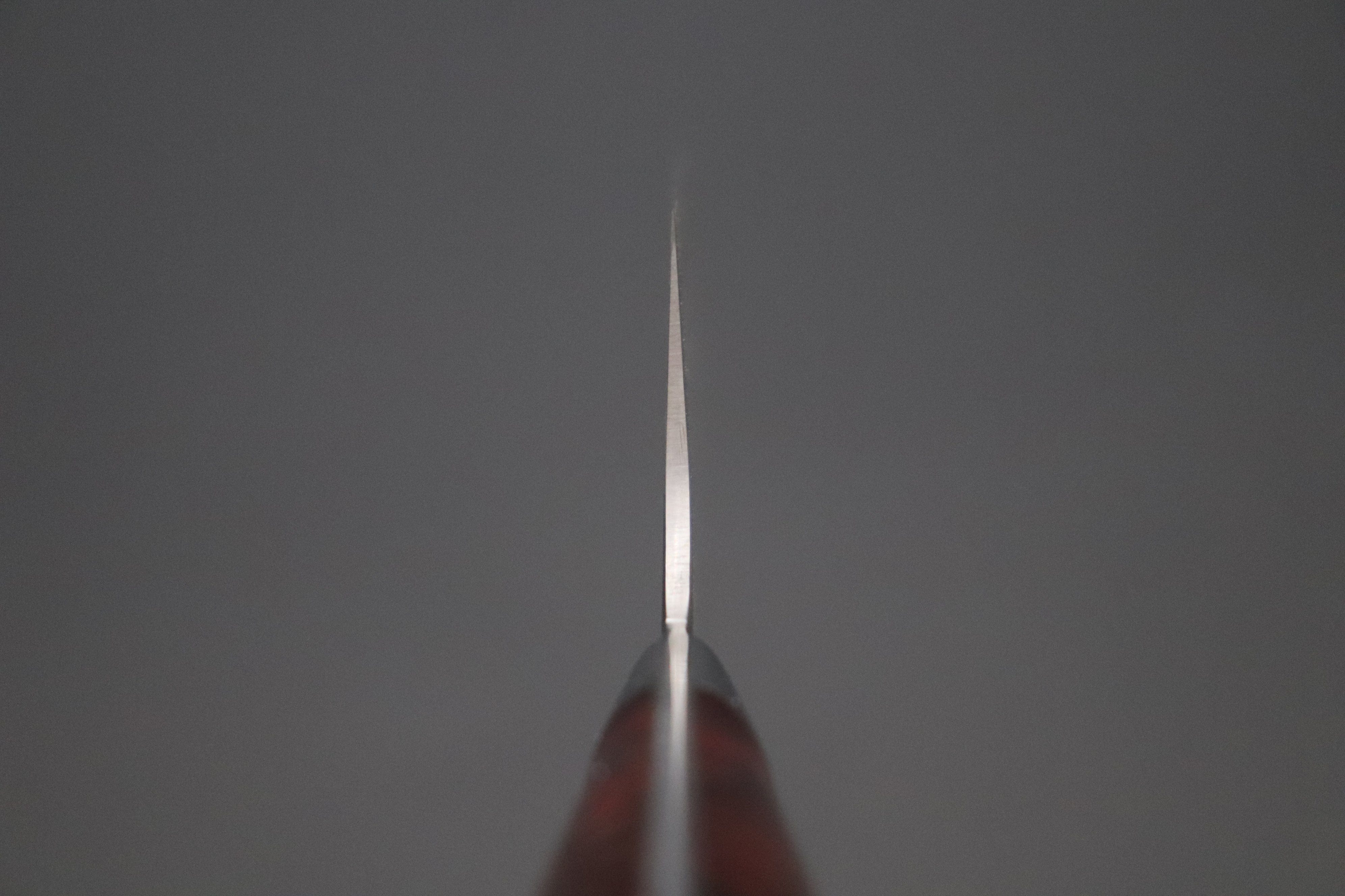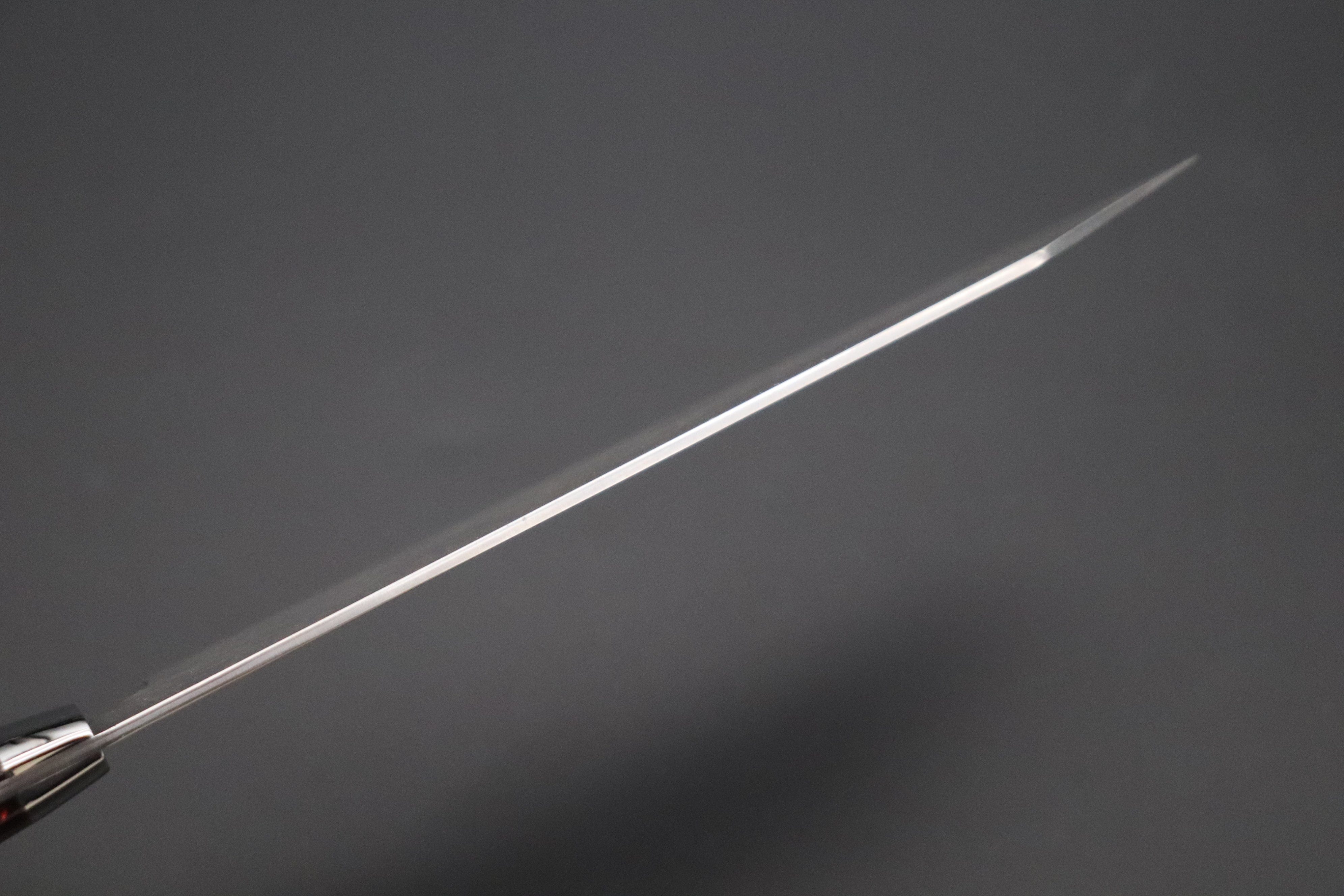 Takeshi Saji is a very well respected Master Smith, who specializes in making traditional hammer forged Japanese knives. We are often surprised by the variety of ideas he has and the very distinctive materials and rare steel that he uses for his custom knives.