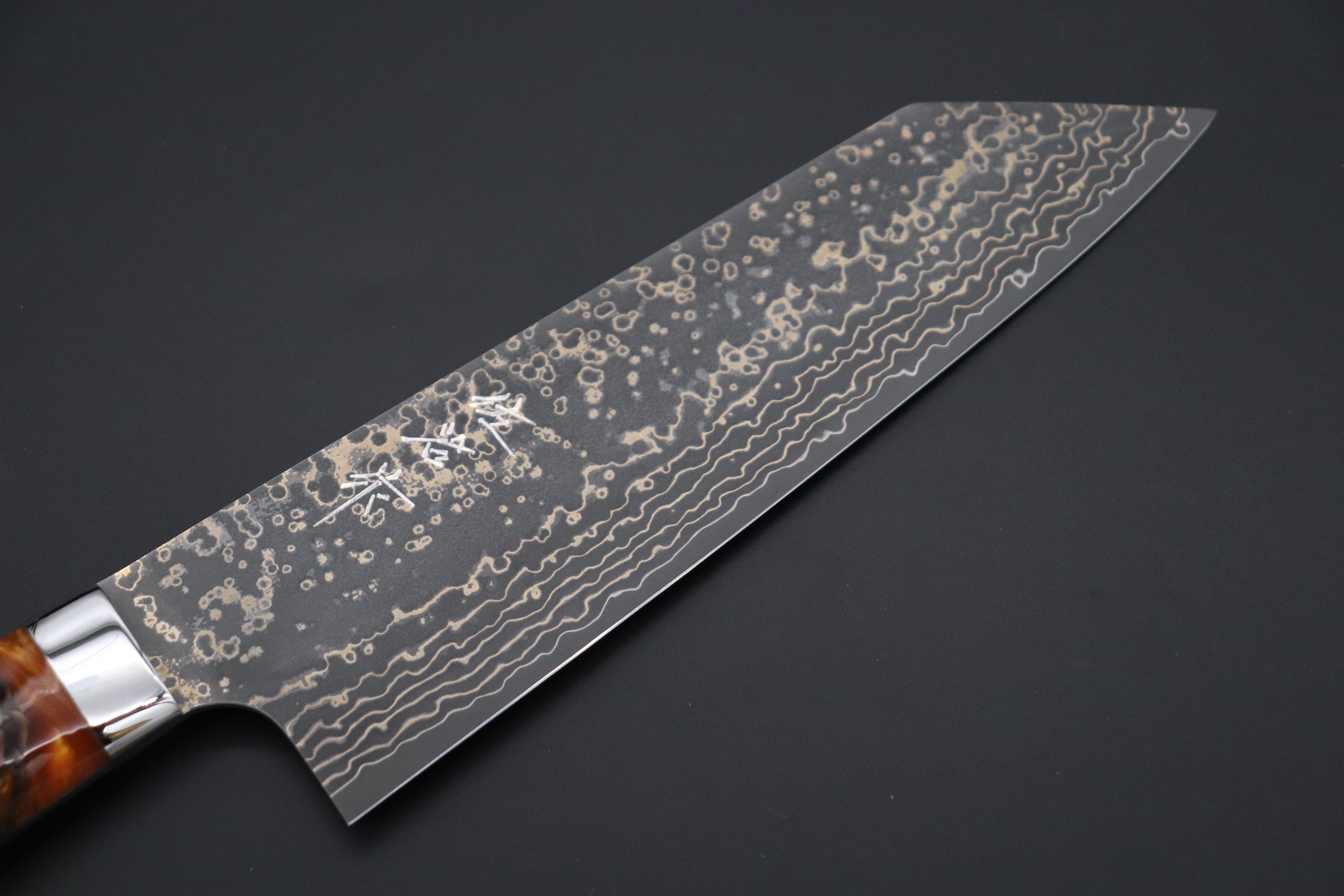 Master Saji has just completed a fresh new batch of traditional hammer forged custom kitchen knives that, once again, feature his unique multi-colored Damascus. The blades have a core of VG-10W Cobalt-Tungsten Stainless steel (HR.c 61 to 62), which has been clad with multiple layers of rust-resistant stainless steel, brass and copper.