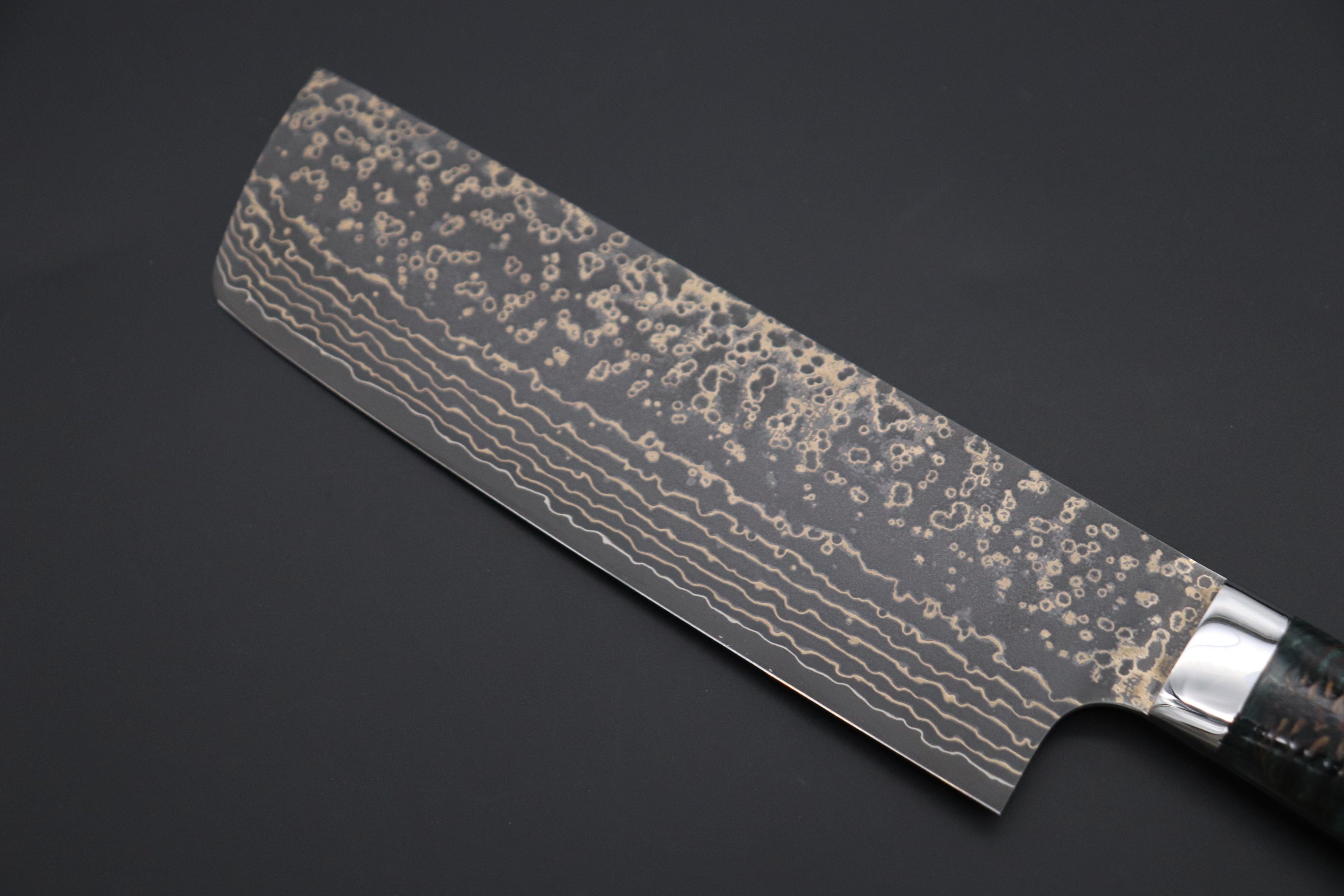 Knife Model: Takeshi Saji SUMMIT ― Limited Edition Custom Series SMT-1053 VG-10W Multi-Colored Golden-Rainbow Damascus Nakiri 165mm