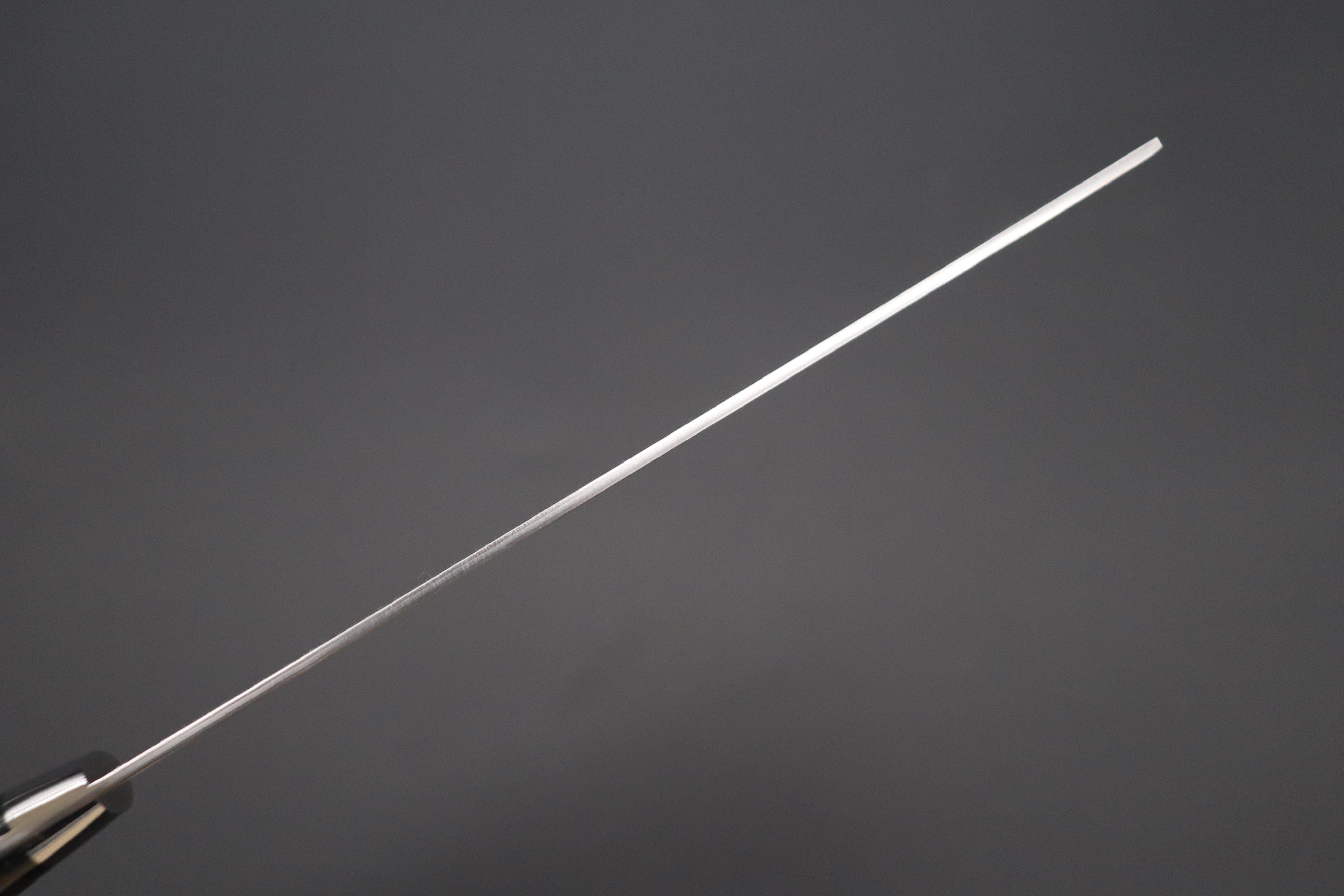 Takeshi Saji is a very well respected Master Smith, who specializes in making traditional hammer forged Japanese knives. We are often surprised by the variety of ideas he has and the very distinctive materials and rare steel that he uses for his custom knives.
