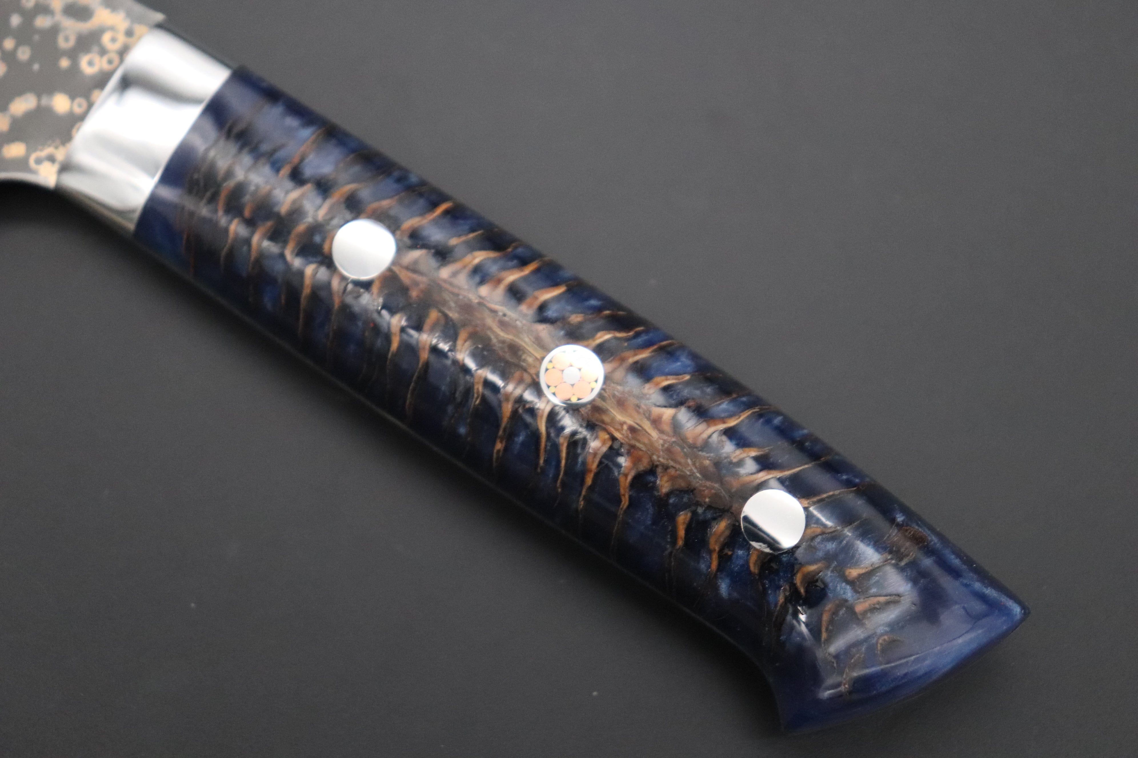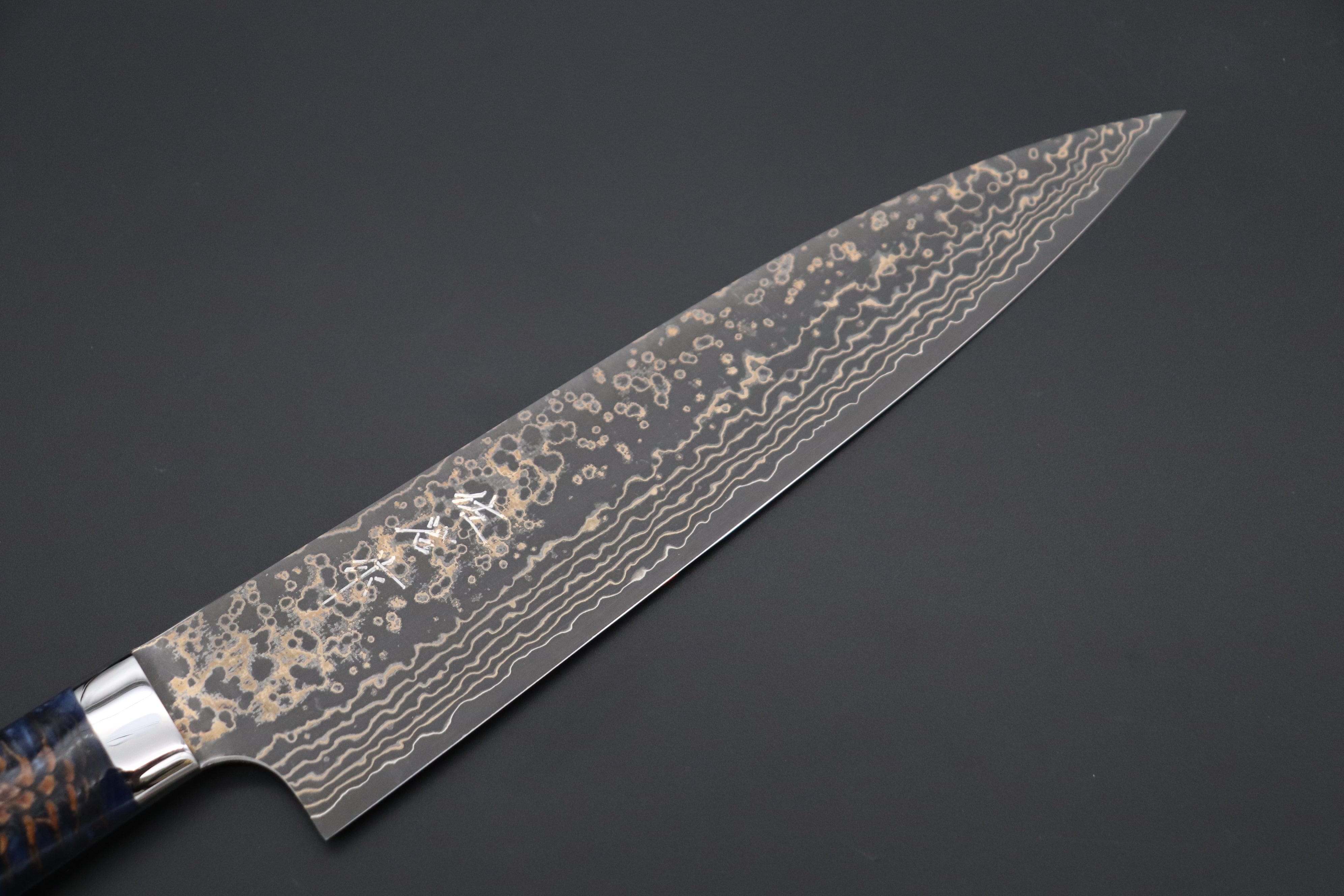 Master Saji has just completed a fresh new batch of traditional hammer forged custom kitchen knives that, once again, feature his unique multi-colored Damascus. The blades have a core of VG-10W Cobalt-Tungsten Stainless steel (HR.c 61 to 62), which has been clad with multiple layers of rust-resistant stainless steel, brass and copper.