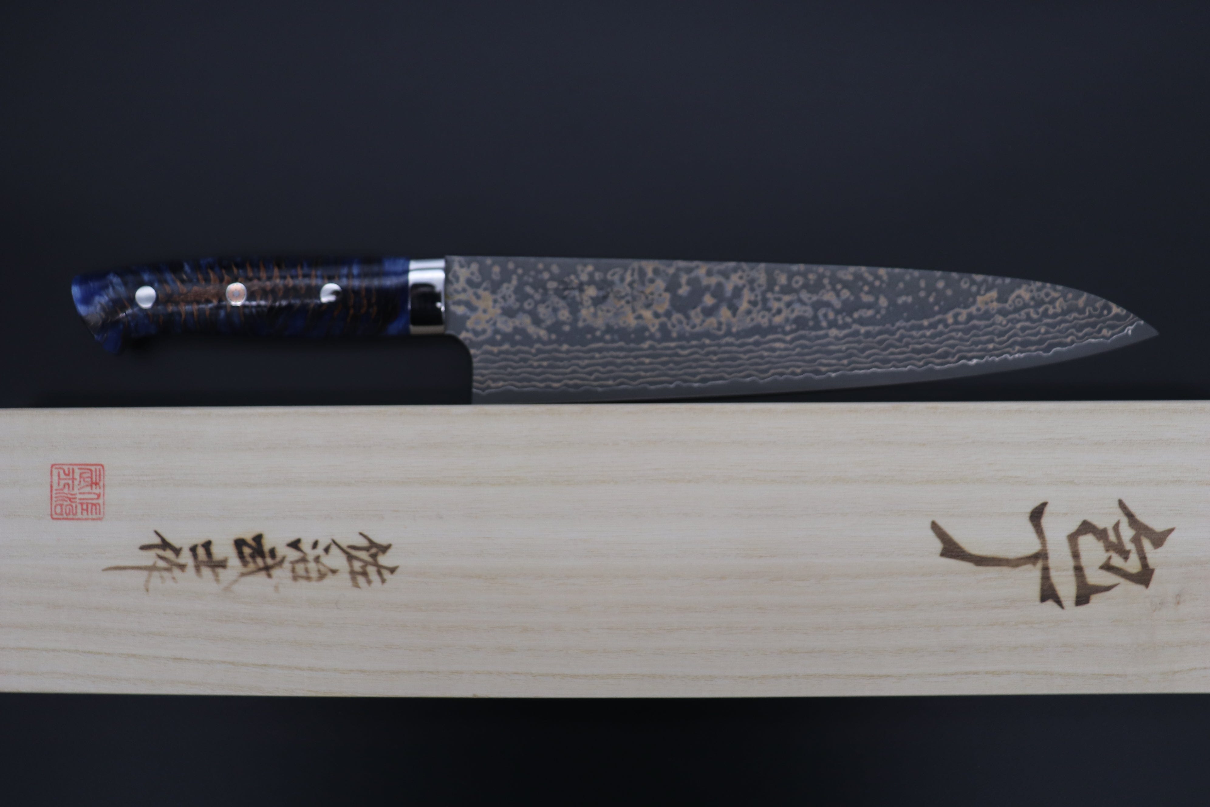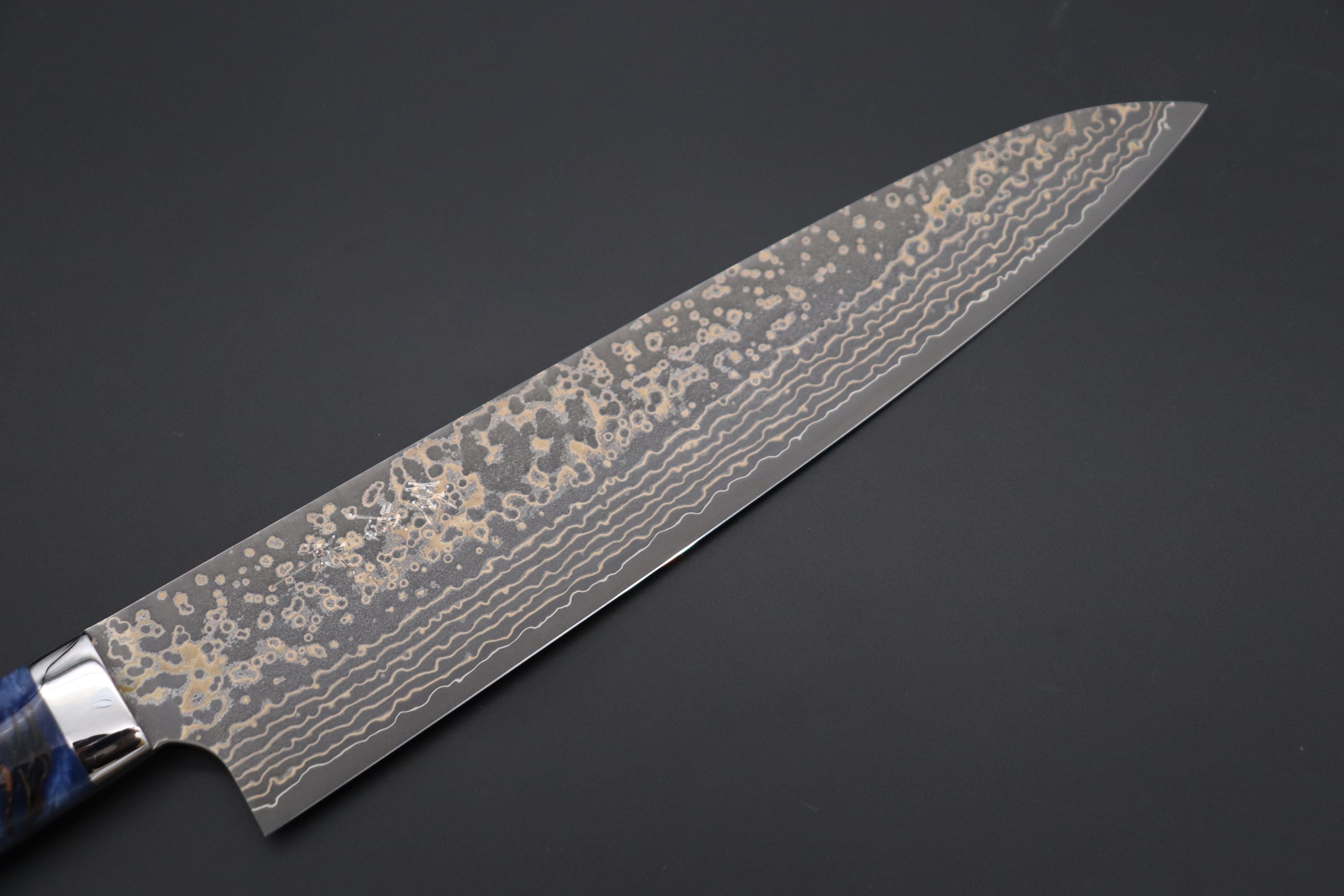 Knife Model: Takeshi Saji SUMMIT ― Limited Edition Custom Series SMT-1062 VG-10W Multi-Colored Golden-Rainbow Damascus Gyuto 240mm