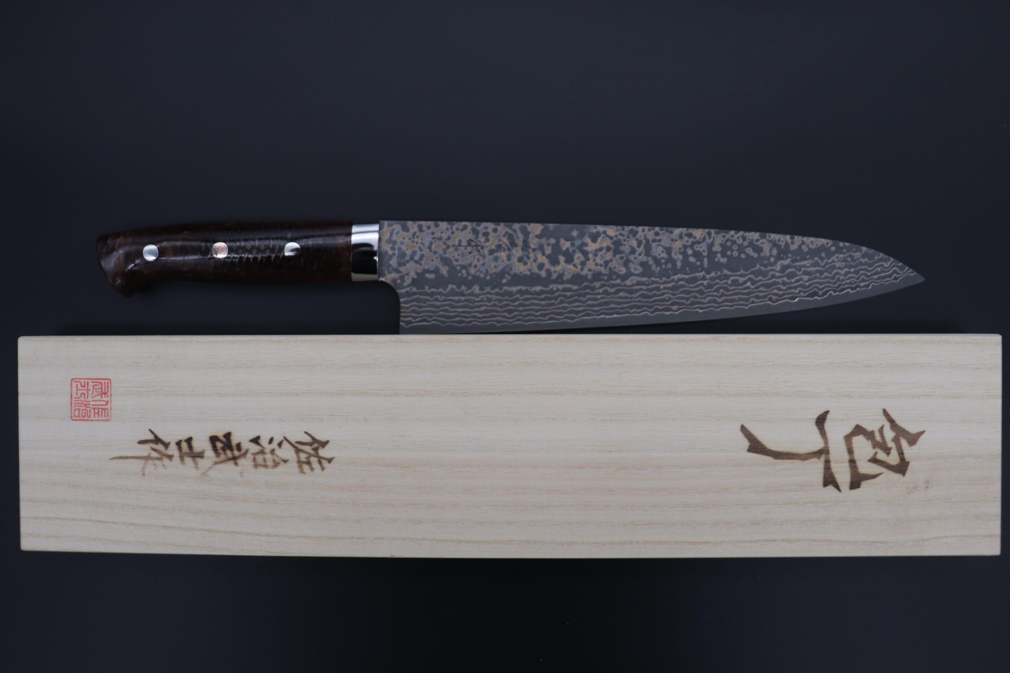 Each knife comes with a traditional Wooden Presentation Box that is inscribed with Takeshi Saji’s name.