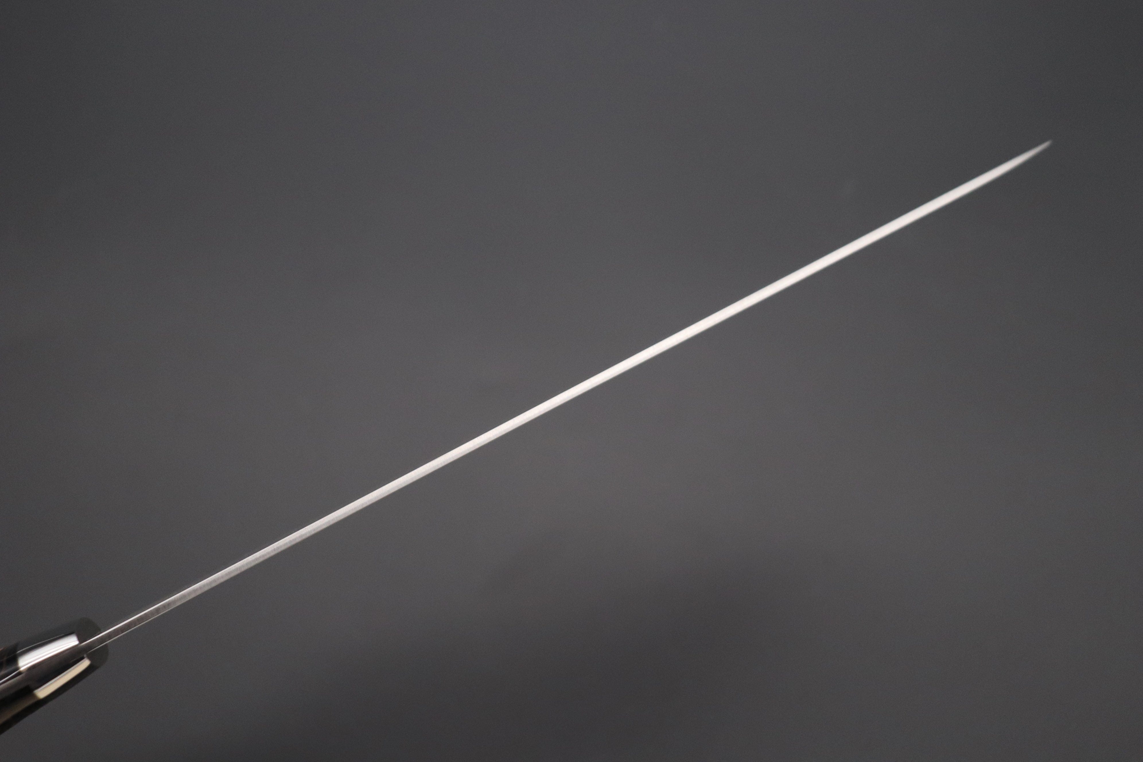 Takeshi Saji is a very well respected Master Smith, who specializes in making traditional hammer forged Japanese knives. We are often surprised by the variety of ideas he has and the very distinctive materials and rare steel that he uses for his custom knives.