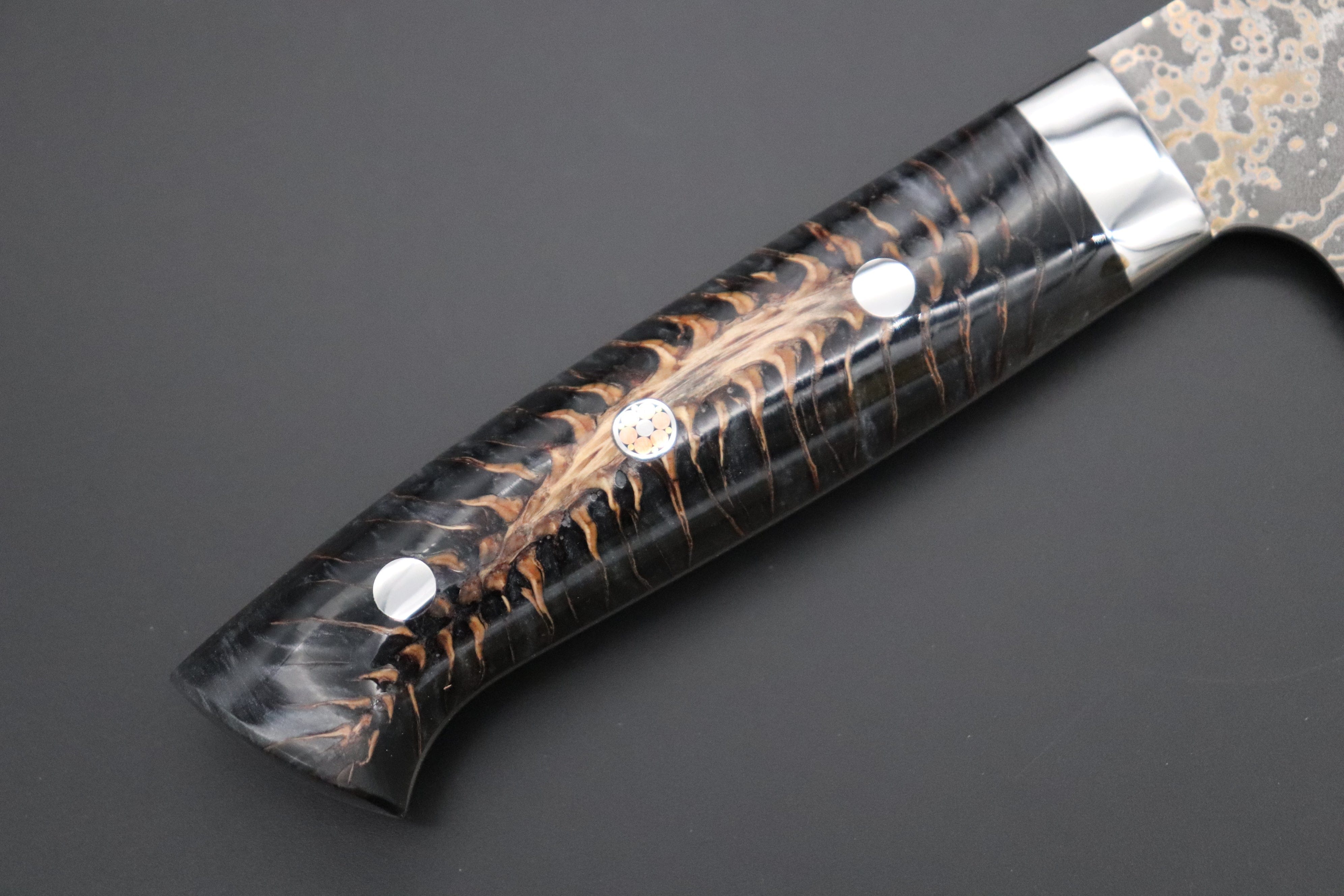 Takeshi Saji's Custom Handmade "Stabilized Spruce Cones Hybrid Wood Handle" perfectly complements the Beautiful and Wild Custom Damascus Blade. This handle blends the allure of spruce cones with durability and ergonomic design.